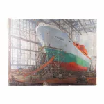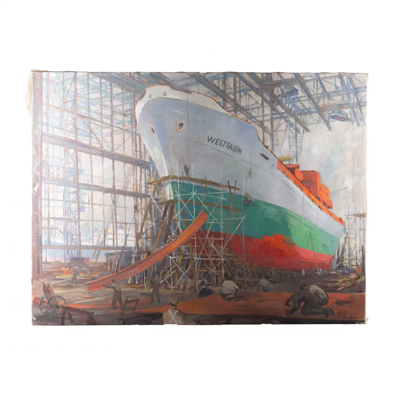 Bau des Seebäderschiffs Westfalen in der Meyer Werft, Öl auf Leinwand, 90 cm x 120 cm Leinwandmaß, signiert, 1951 datiert, partiell berieben, partiell craqueliert, partiell Abplatzungen