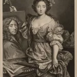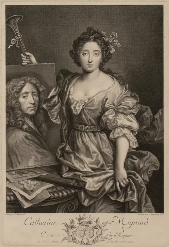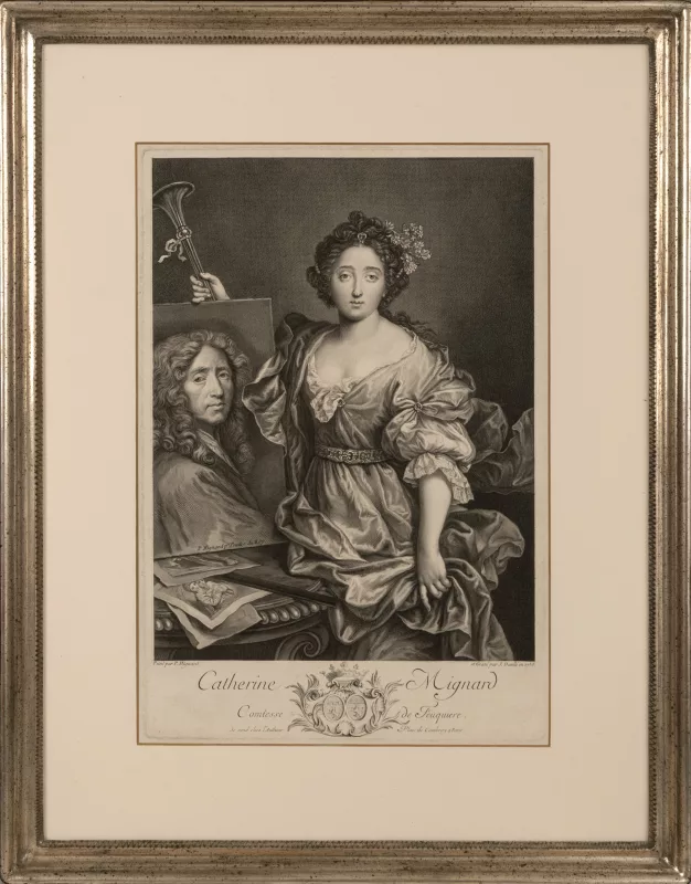 Catherine Mignard, Tochter des Malers Pierre Mignard, nach einem Bild ihres Vaters, Kupferstich auf Papier, 46,5 cm x 31,45 cm Plattenmaß, im Druck signiert, 1735 datiert, betitelt und Place de Cambray a Paris ortsbezeichnet, montiert