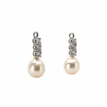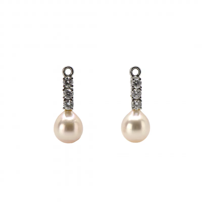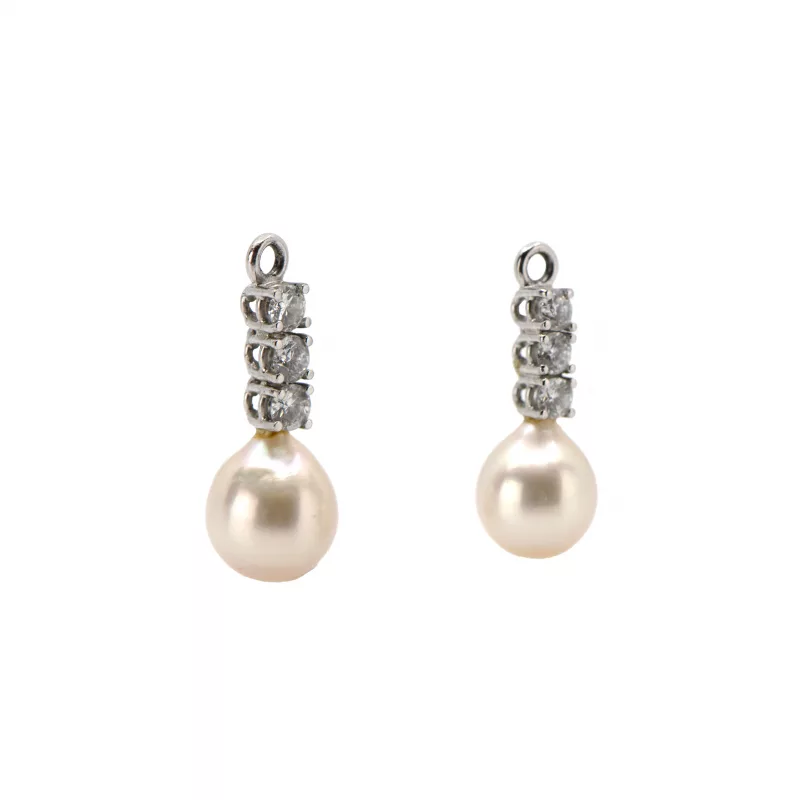 2-tlg., 750 Weißgold, geprüft, insgesamt 6 Diamanten im Brillantschliff, gesamt ca. 0,60 ct, G-H, vvs-vs, jeweils 1 cremefarbene, leicht rosefarbene Zuchtperle, Länge Ohrhänger 2,1 cm, Ø Perlen 8,2 – 8,3 mm, Gesamtgewicht ca. 3 g