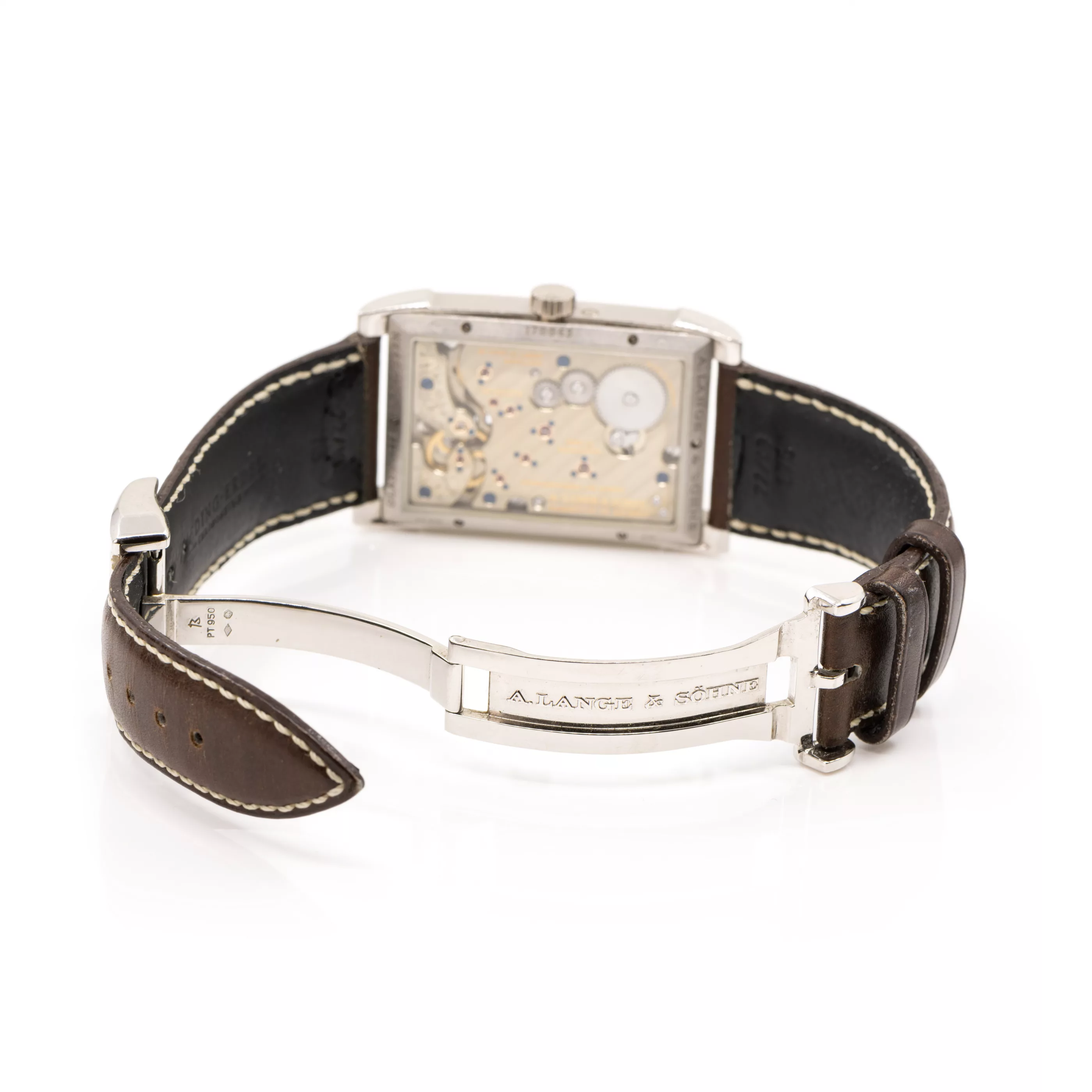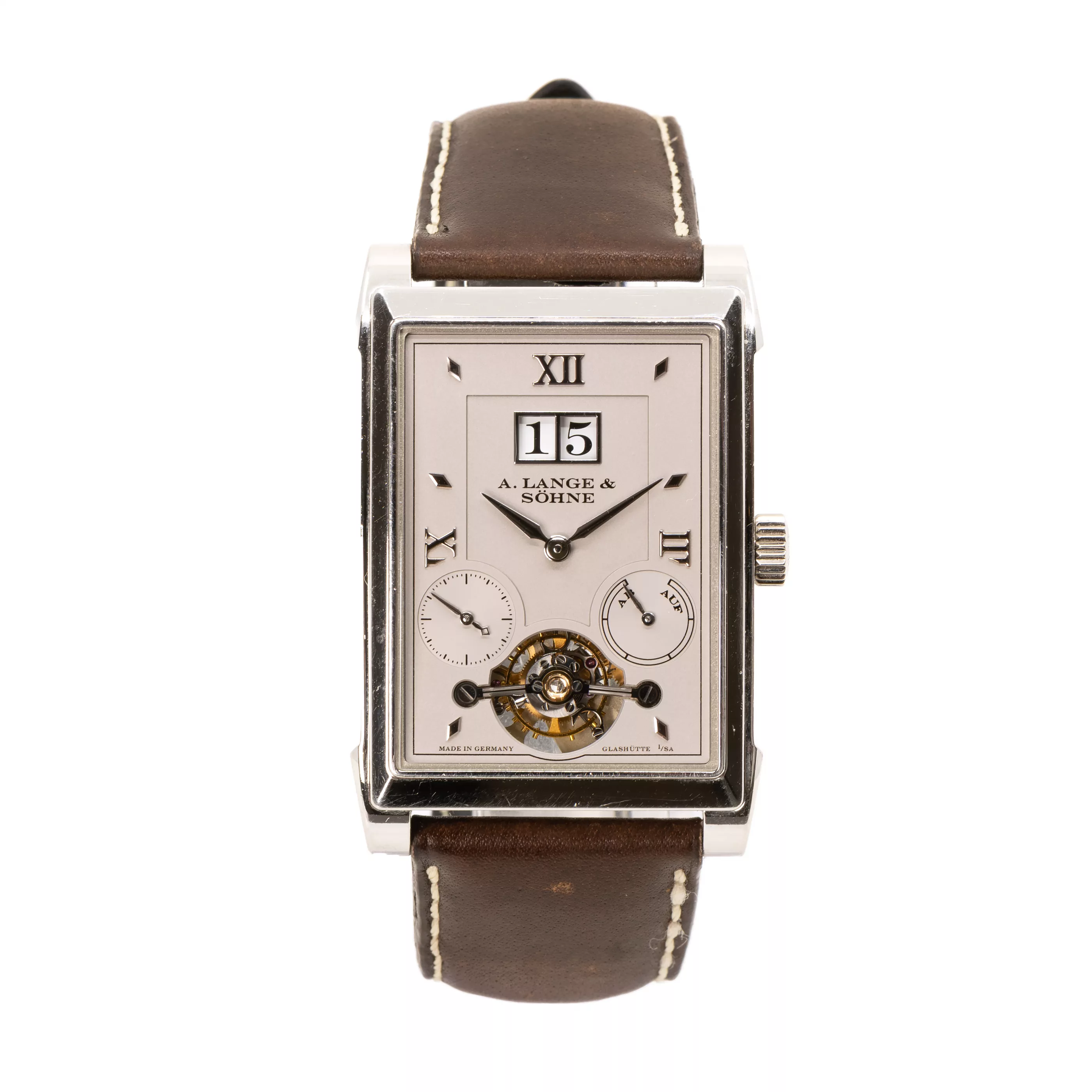 Full set, year 2008, manual winding, tourbillon, date display, date quickset, power reserve indicator, off-centre seconds, visible case back, case no. 170063 | model no. 703.025F | movement no. 60379 | cal. L042. 1 | regulated in 5 positions, 2 diamonds, 45 rubies, case 950 platinum, hallmarked, dimensions 39.2 mm x 29.5 mm, bracelet replaced, leather, original folding clasp, 950 platinum hallmarked, length 16 cm, total weight 142.5 g, functional, tested, condition good, condition and functionality tested by our master watchmaker, with original box, outer packaging and papers, outer packaging very good, box very good, original folder: watch book with guarantee certificate, operating instructions, original microfibre cloth, setting pin, Note: The premium is 14.28% incl. VAT. There is an additional fee of 3% plus VAT (3.57%) for using the online bidding consoles.