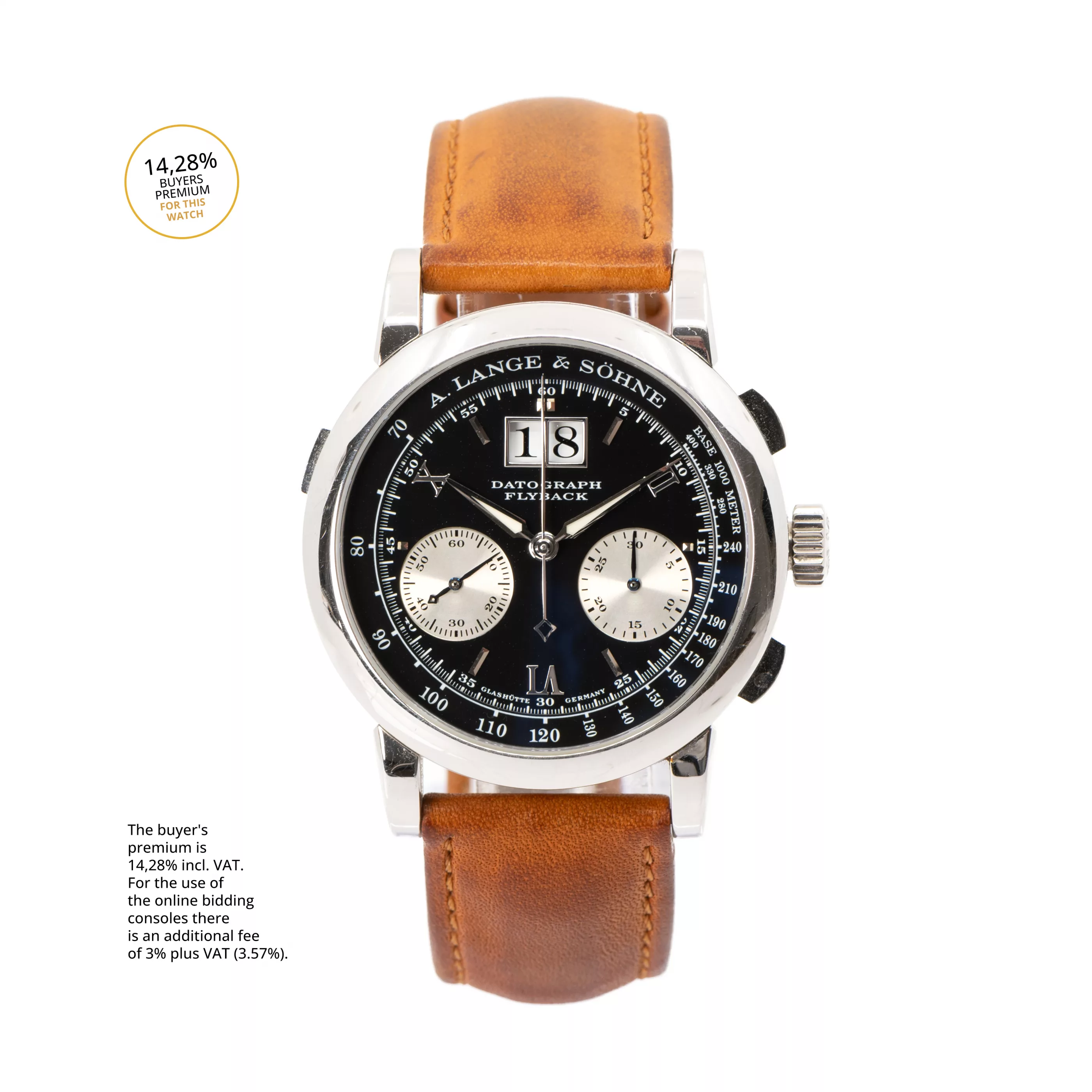 Full set, year 2000, manual winding, chronograph, under-glass tachymeter scale, flyback function, date display, decentralised 30-minute counter, decentralised seconds, visible case back, case no. 123404 | model no. 403.035F | movement no. 13416 | cal. L951.1, regulated in 5 positions, 40 jewels, case 950 platinum, hallmarked, diameter 39 mm, strap replaced, leather, original folding clasp, 950 platinum, hallmarked, length 17 cm, adjustable, total weight approx. 172 g, functional, tested, condition good, condition and functionality checked by our master watchmaker, with original box, outer packaging and papers, outer packaging good, slightly light-margined, box very good, guarantee certificate, instruction manual, original microfibre cloth, note: The buyer's premium is 14.28% incl. VAT. There is an additional fee of 3% plus VAT (3.57%) for using the online bidding consoles.