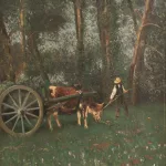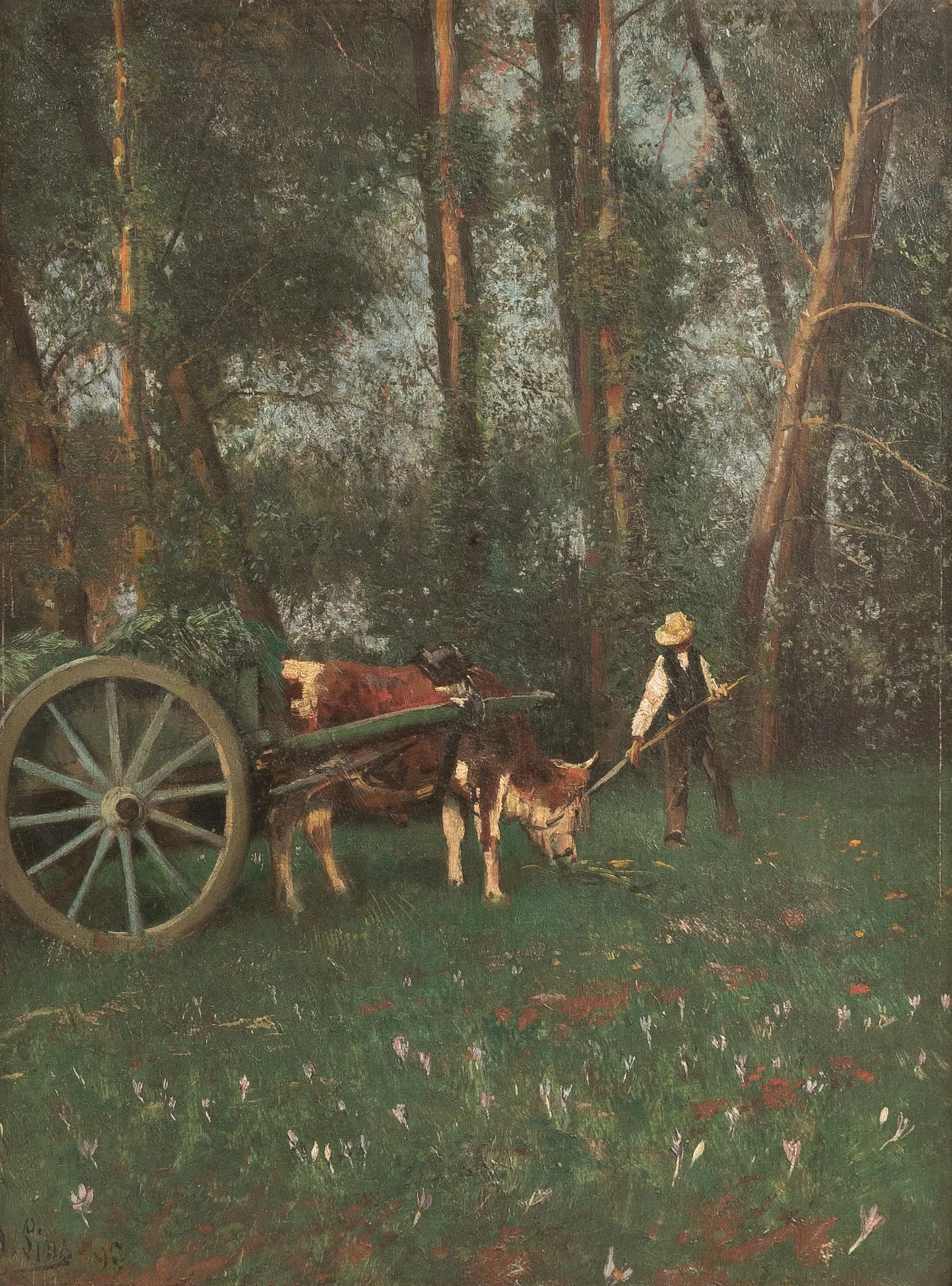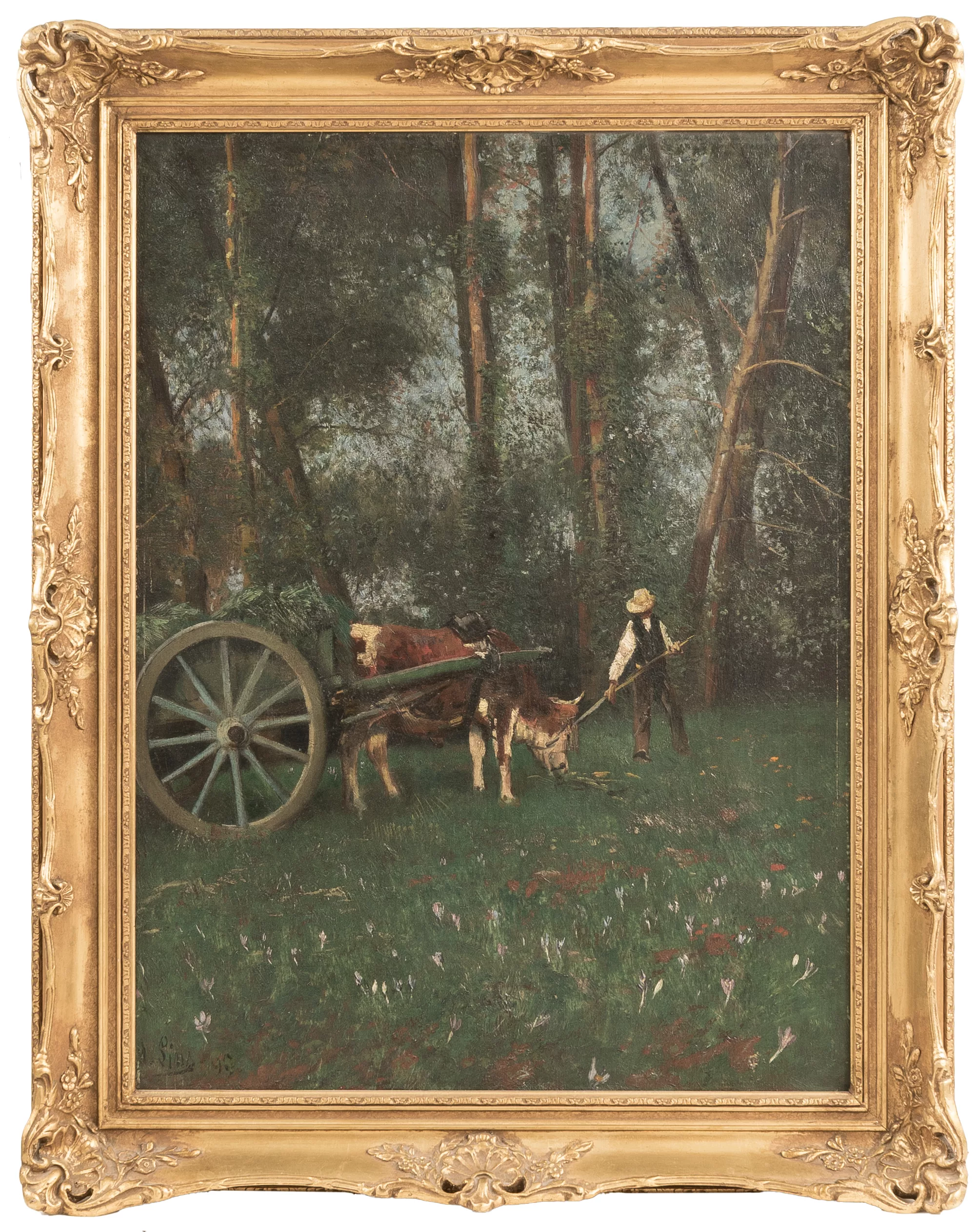 Farmer with cattle at the edge of the forest, oil on canvas, 71 cm x 53 cm canvas size, signed, dated 90, renewed wider stretcher, thus vertical lines on both sides, partially small abrasions