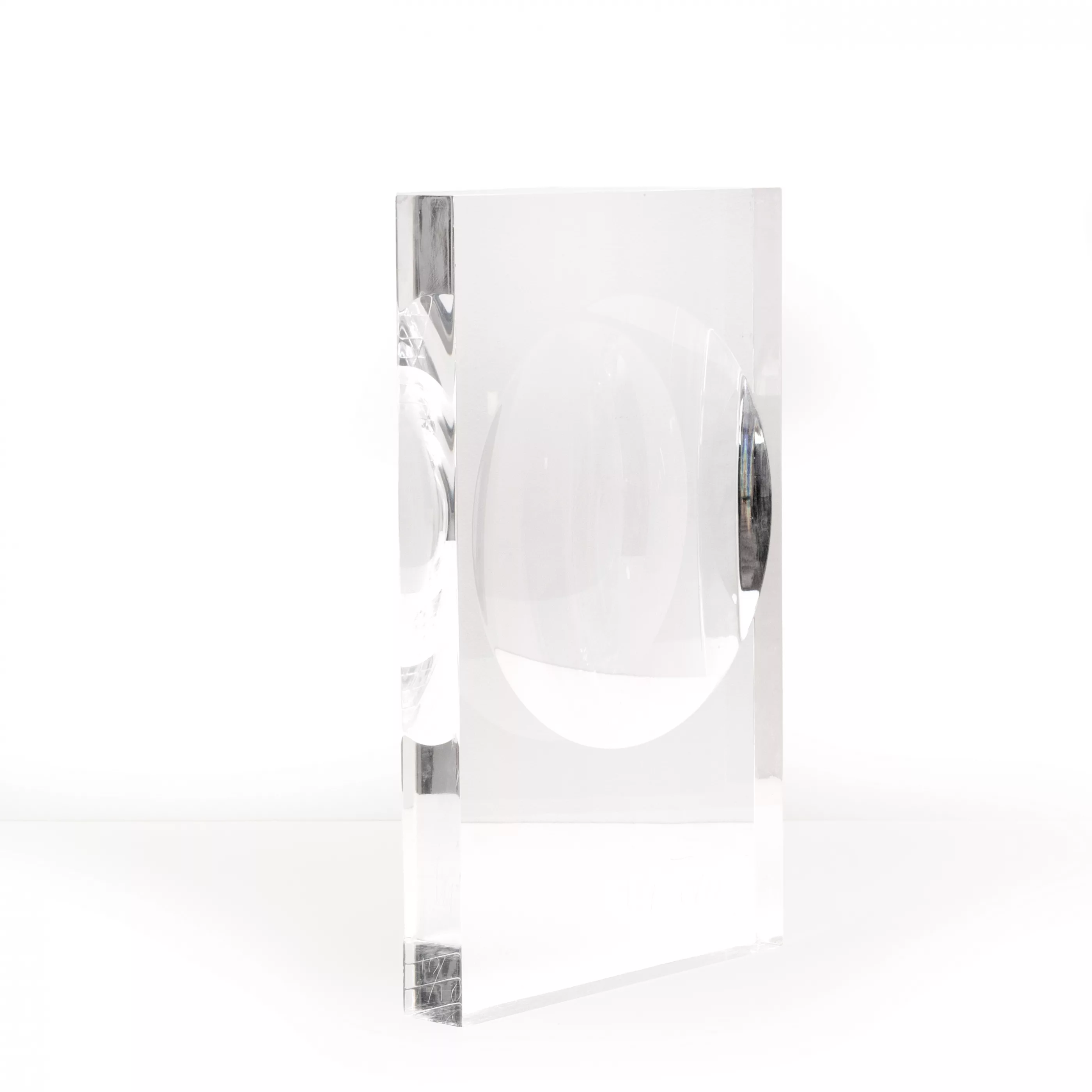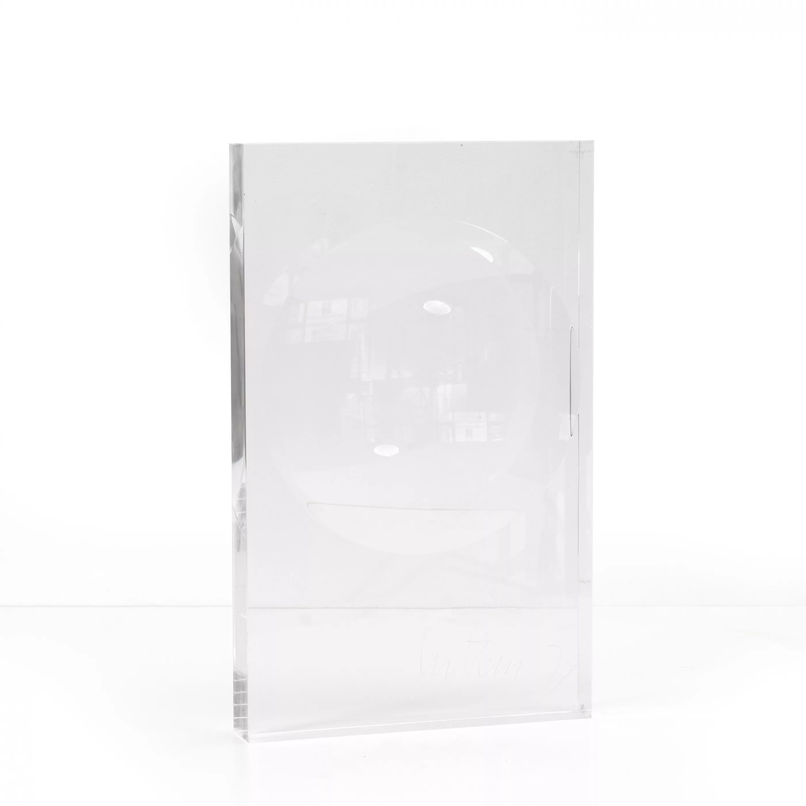 Stele (lens object), plexiglass with concave lens, height 40 cm, incised signature, dated 79, numbered 40/50, partially scratched, partially bumped, bottom and top right corner chipped