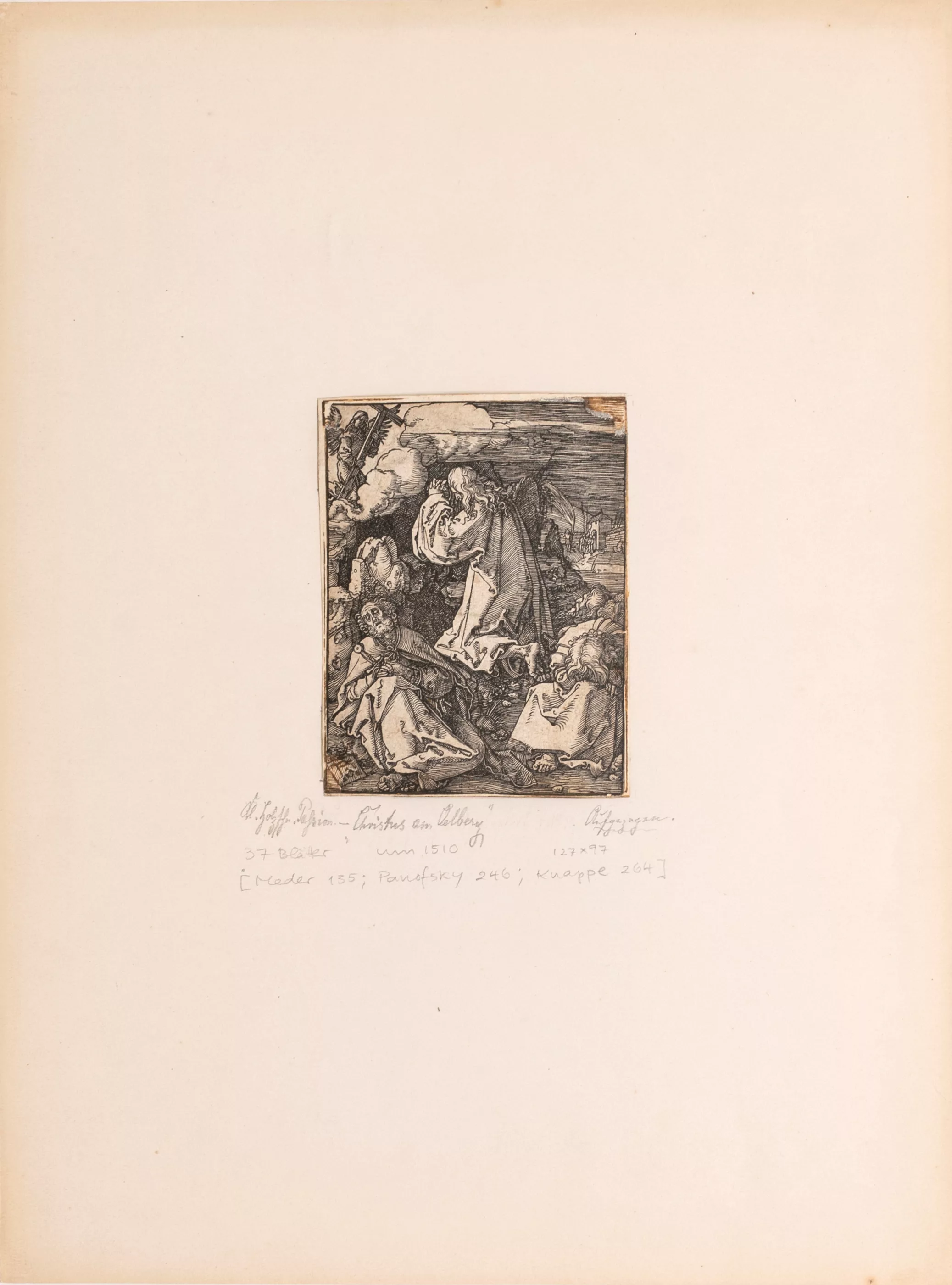 Christus am Ölberg, Holzschnitt auf Papier, 13 cm x 10 cm Blattmaß, monogrammiert, mit Rissen, partiell hinterklebt und mit Tuschezeichnung ergänzt, Papier gebräunt, Literatur: Meder: 135, Panofsky: 246, Knappe: 264