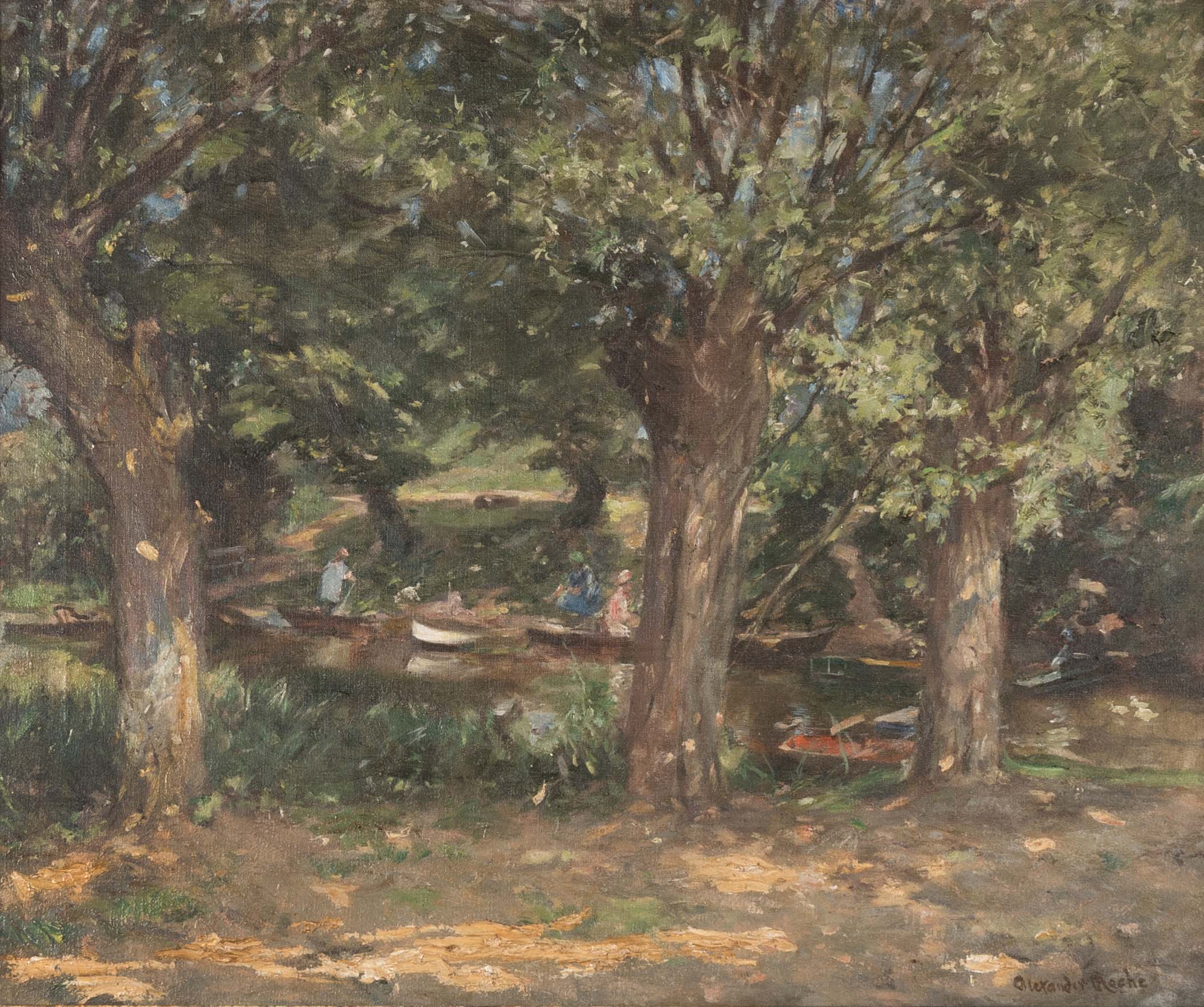 Flusslandschaft mit Booten, Öl auf Leinwand, 63 cm x 76 cm Leinwandmaß, signiert, partiell restauriert, retuschiert, minimal craqueliert
