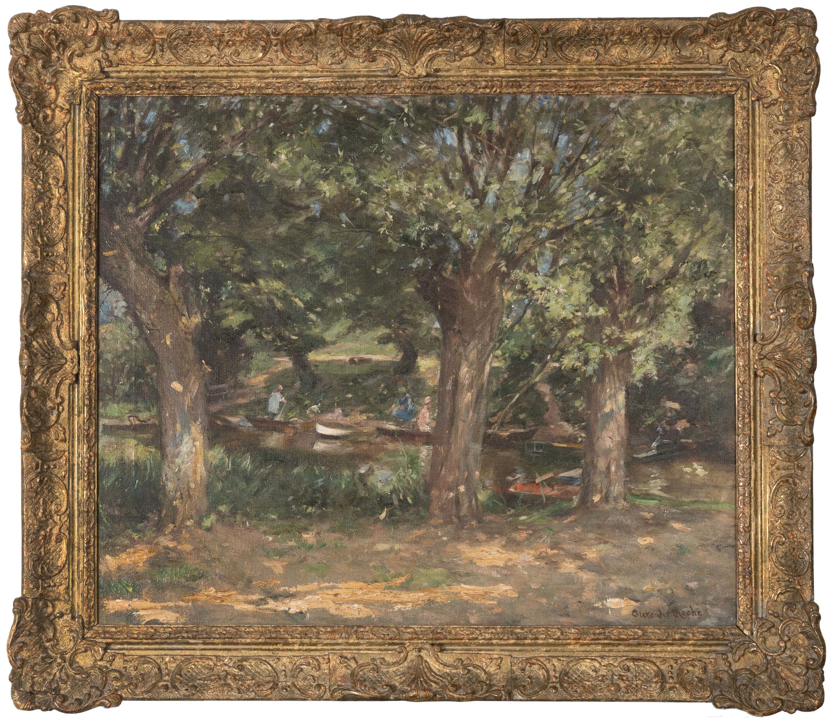 Flusslandschaft mit Booten, Öl auf Leinwand, 63 cm x 76 cm Leinwandmaß, signiert, partiell restauriert, retuschiert, minimal craquel