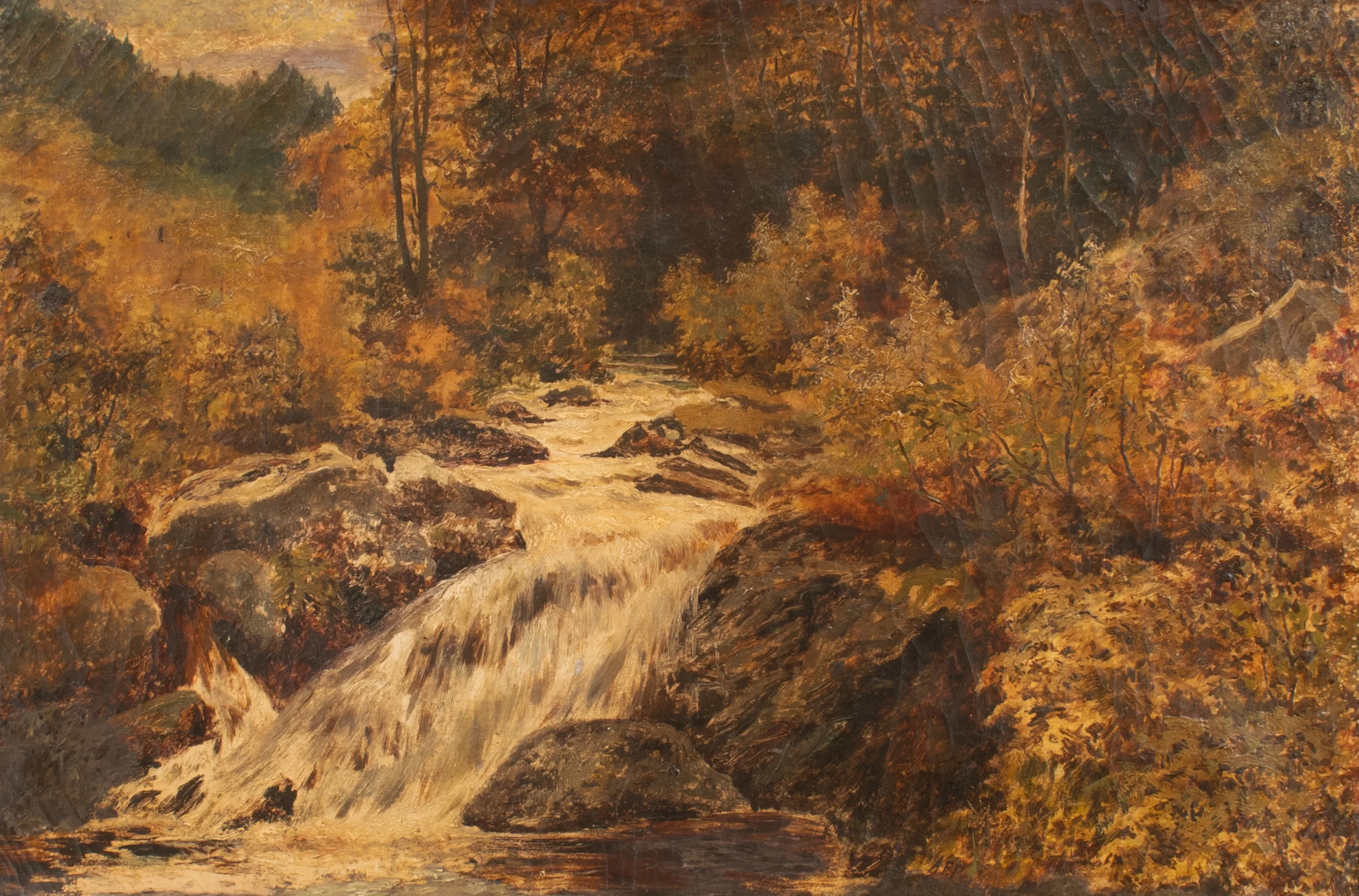 Reißender Fluss, Öl auf Leinwand, 50 cm x 76 cm Leinwandmaß, signiert, stark craqueliert, rissig, Farbabplatzer, retuschiert, reinigungsbedürftig