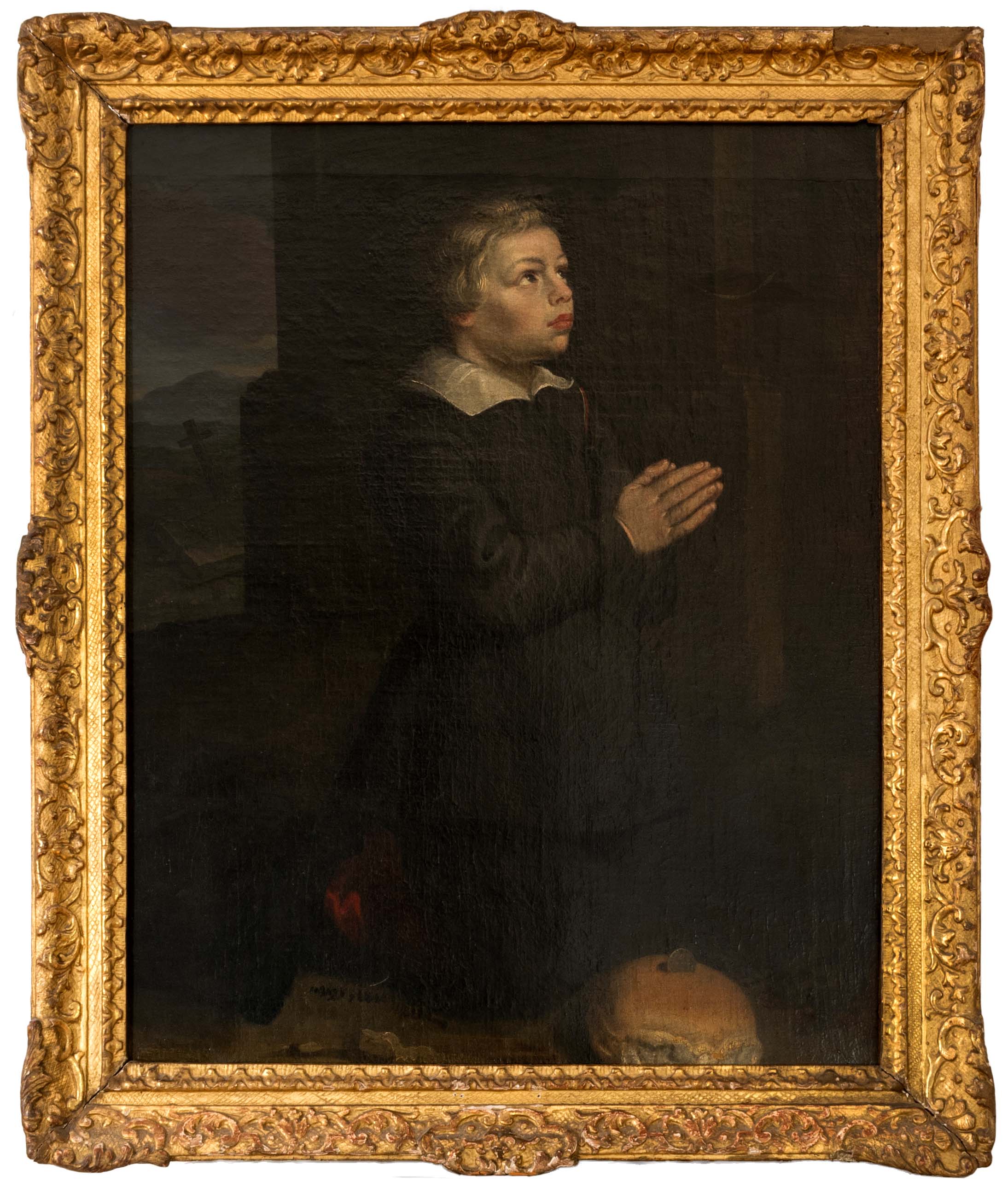 Praying Boy, oil on canvas, 81 cm x 65 cm canvas dimensions, partially craquelured, in need of cleaning, retouched, partially restored. A boy kneels down to pray. He turns towards a source of light outside of the painting, which illuminates his face. Spanish court fashion has long since merged into the fashion of the Thirty Years' War, in whose ascetic black the child presents himself. Red-lined boots and a white collar covering his shoulders complete his fussy appearance. The barren landscape in the background, from which the boy turns away, is dominated by a large wooden cross. The loaf of bread that he has placed in front of him refers to the carnal physicality of Christ and to the Last Supper, at which Jesus broke bread with his disciples. The boy is turning towards a divine power that is higher than his own physical existence. The sculptural quality of the boy and the clarity of the forms are reminiscent of Francisco Pachero's influence on Alonso Cano, who valued the disegno, the influence of drawing on the painting, and favoured it over the use of colour. Cano's typical use of light emphasises the spiritual expression of the boy, whose devotion encourages the viewer to devote as well. The artistic quality of the subject and its execution emphasise the high religious significance that this painting had at the time of its creation.