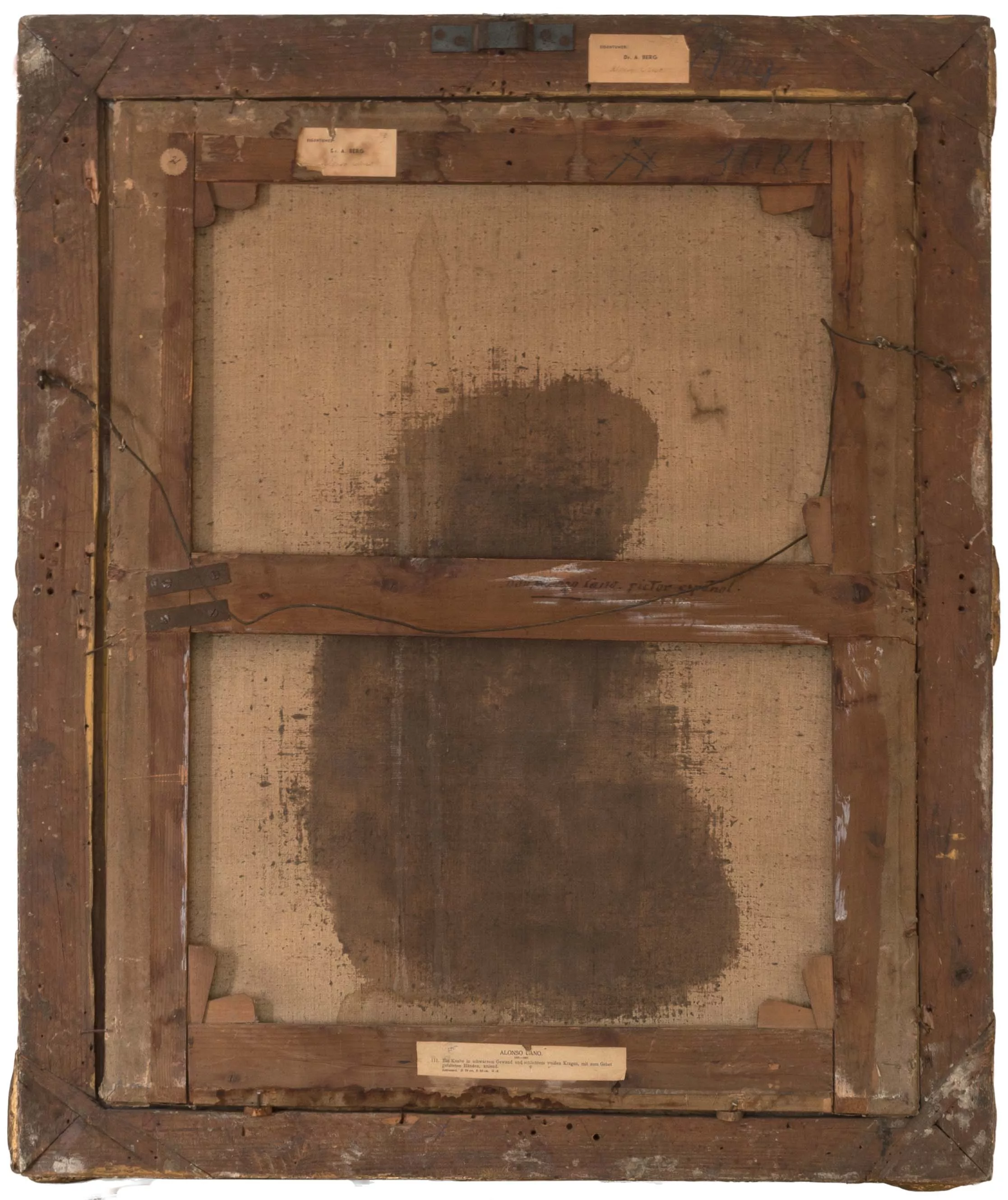 Betender Knabe, Öl auf Leinwand, 81 cm x 65 cm Leinwandmaß, partiell craqueliert, reinigungsbedürftig, retuschiert, partiell restauriert. Ein Knabe kniet nieder, um zu beten. Er wendet sich einer Lichtquelle außerhalb des Bildes zu, die sein Gesicht erhellt. Die spanische Hofmode ist längst in die Mode des Dreißigjährigen Krieges aufgegangen, in deren asketischen Schwarz sich das Kind präsentiert. Rot gefütterte Stulpenstiefel und ein die Schultern bedeckender, weißer Kragen komplettieren seine wählerische Erscheinung.Die karge Landschaft des Hintergrunds, von der sich der Junge abwendet, wird durch ein großes Holzkreuz dominiert. Der Laib Brot, den er vor sich gelegt hat, verweist auf die fleischliche Körperlichkeit Christi und auf das letzte Abendmahl, bei dem er mit seinen Jüngern das Brot brach. Der Dargestellte wendet sich einer göttlichen Macht zu, die höher als seine eigene körperliche Existenz ist.Die skulpturale Qualität des Jungen und die Klarheit der Formen erinnert an den Einfluss Francisco Pacheros auf Alonso Cano, der das Disegno, den Einfluss der Zeichnung auf das Gemälde hoch bewertete und ihr den Vorzug gegenüber der Farbe gab. Die für Cano typische Lichtführung unterstreicht den spirituellen Ausdruck des Knaben, der in seiner Andacht den Betrachter zur eigenen Hingabe ermuntert. Die künstlerische Qualität des Bildthemas und ihre Ausführung verdeutlichen die hohe religiöse Bedeutung, die diesem Bild zu seiner Entstehungszeit zukam.