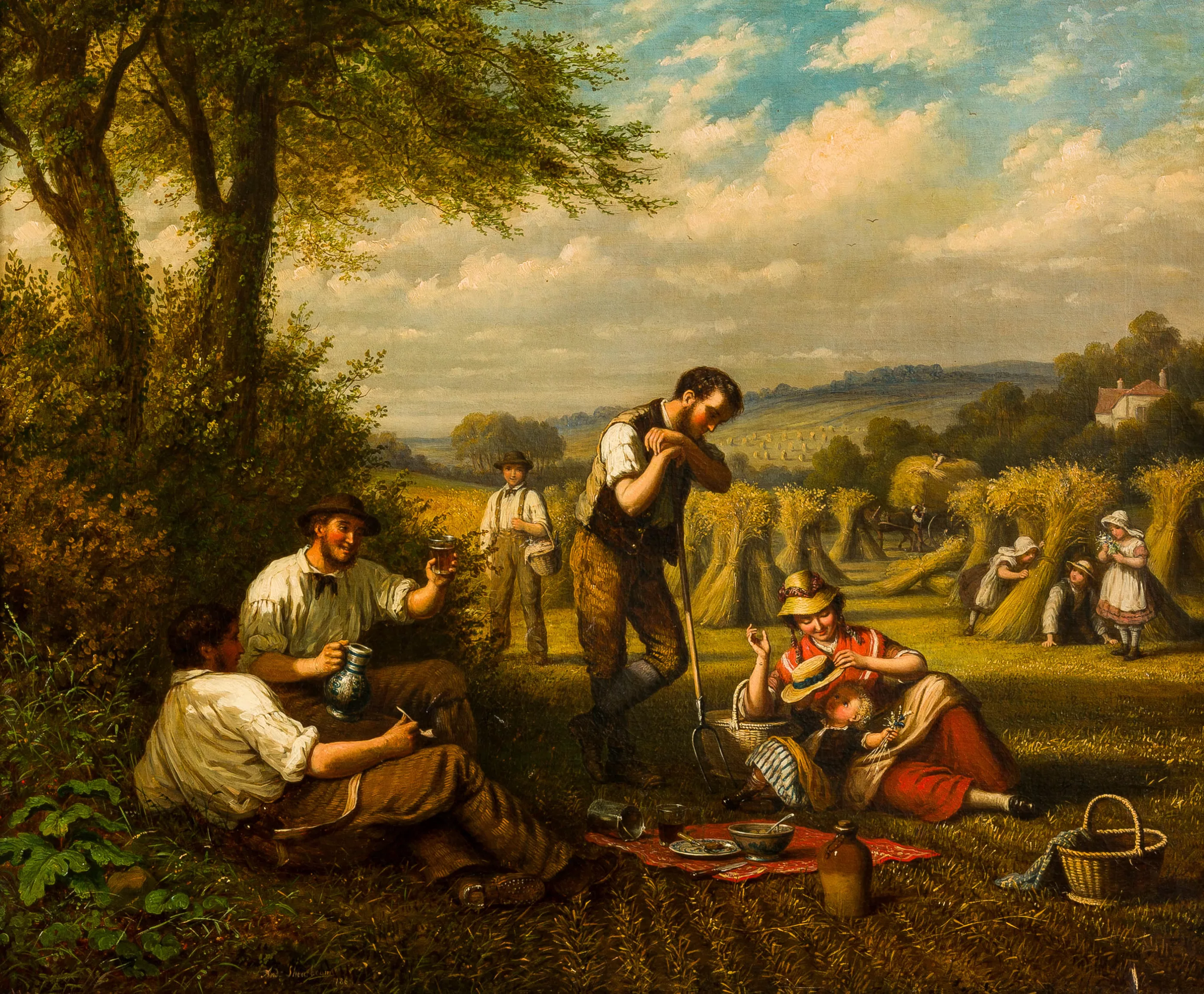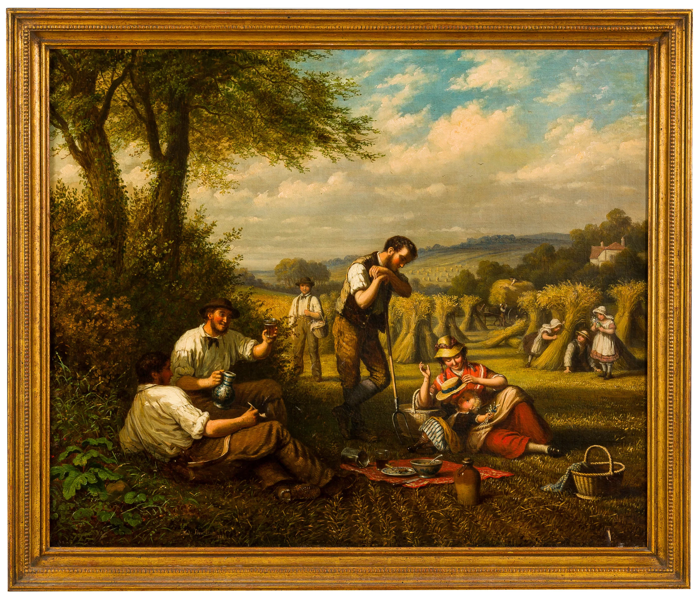 Mittagspause bei der Kornernte, Öl auf Leinwand, 63,5 cm x 76 cm Leinwandmaß, signiert, 1866 datiert, doubliert, craqueliert, minimale Farbabplatzer, partiell Kratzer, partiell retuschiert