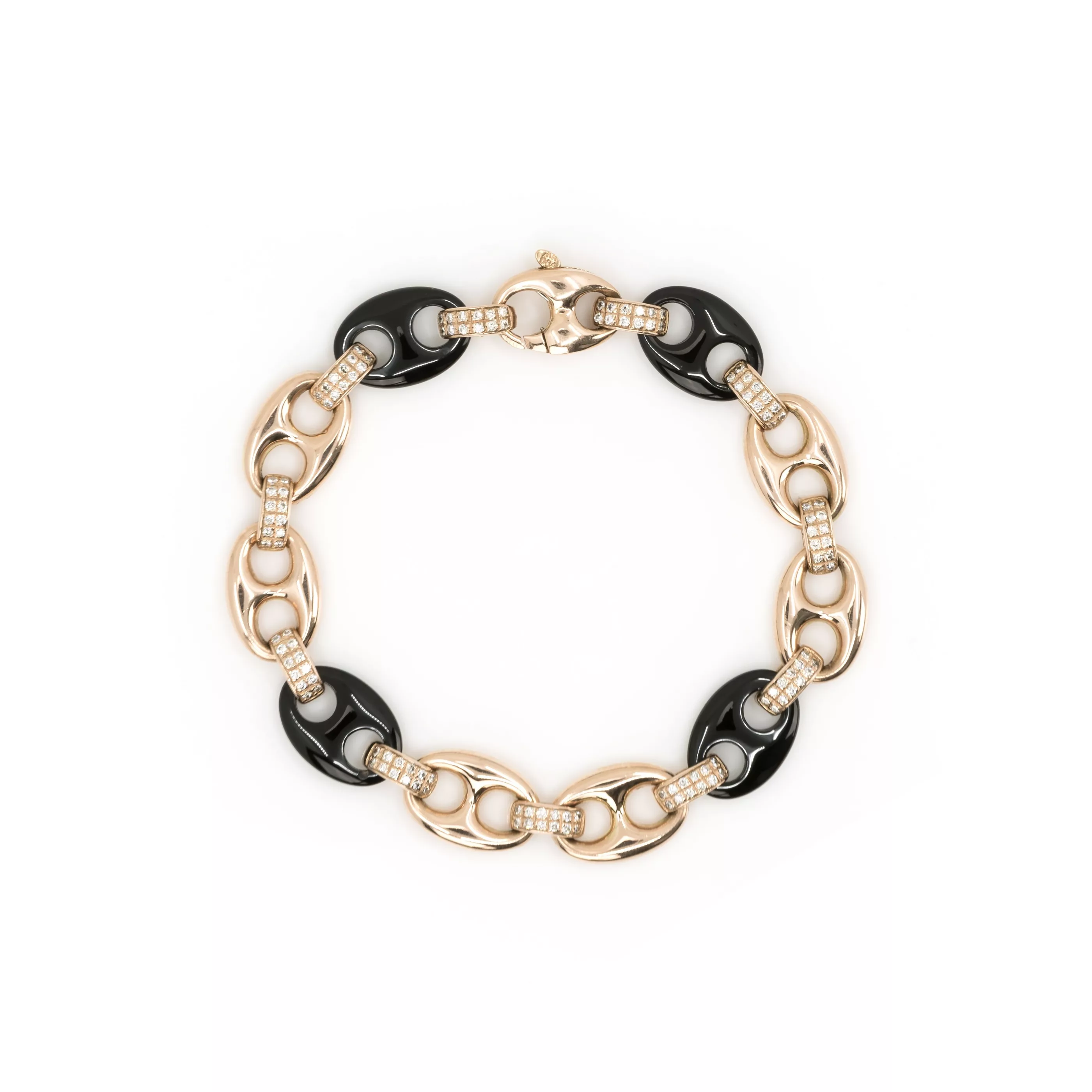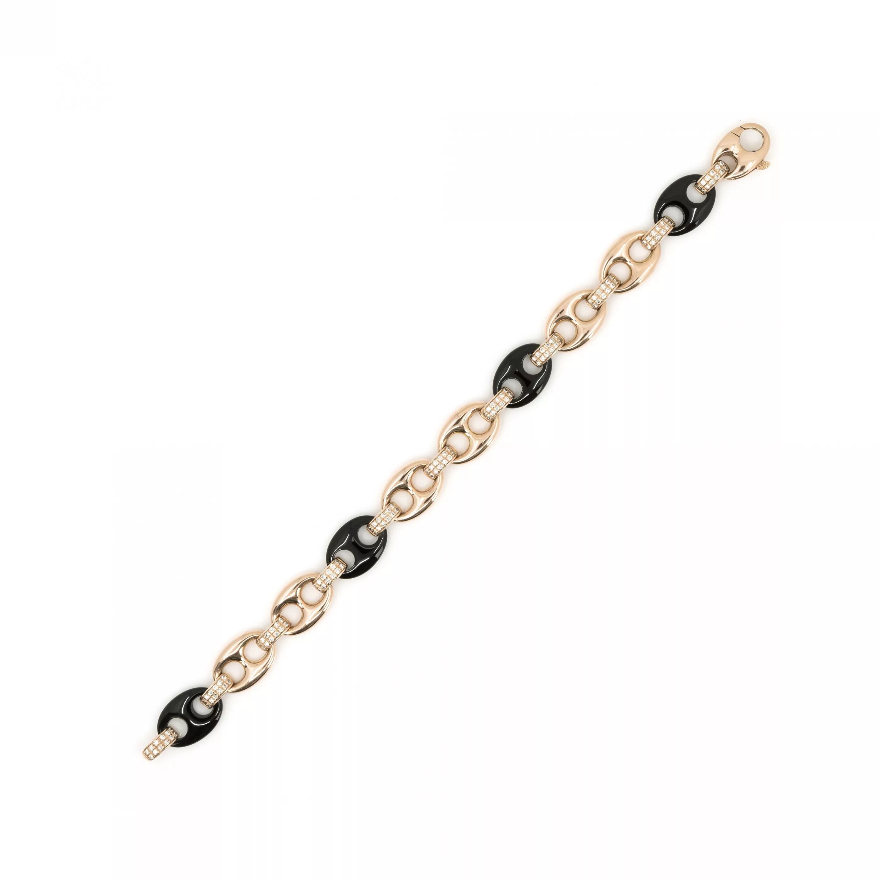 750 Rotgold, punziert, 132 Diamanten im Brillantschliff, gesamt ca. 1,32 ct, G, vvs-vs, die übrigen 4 Armbandglieder aus Onyx, Länge 20 cm, Gewicht ca. 18,6 g