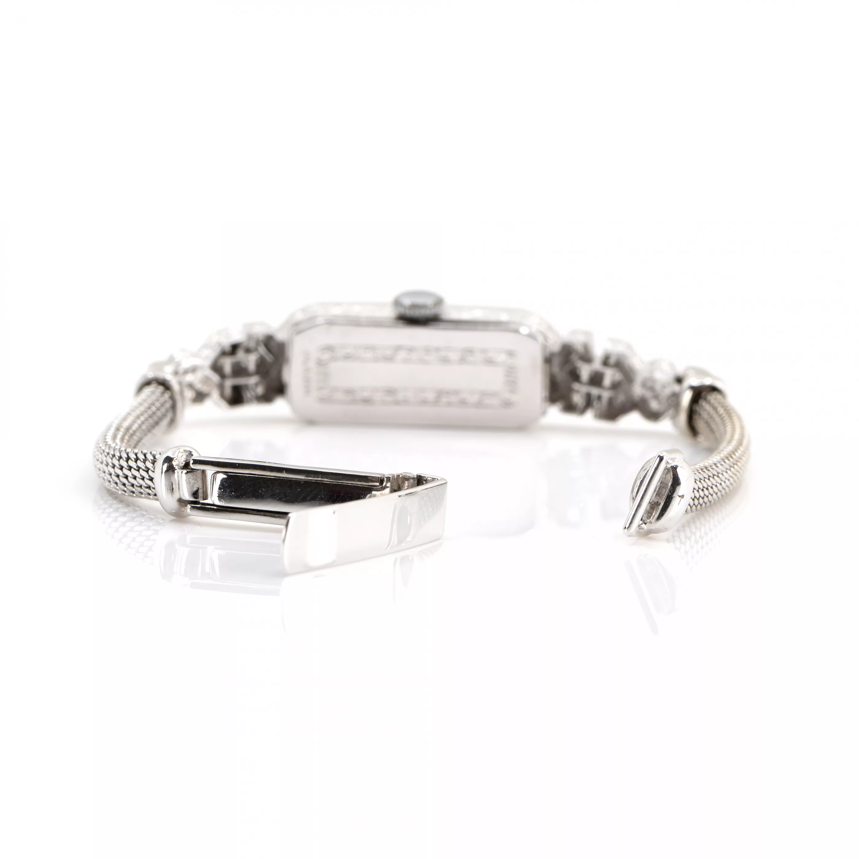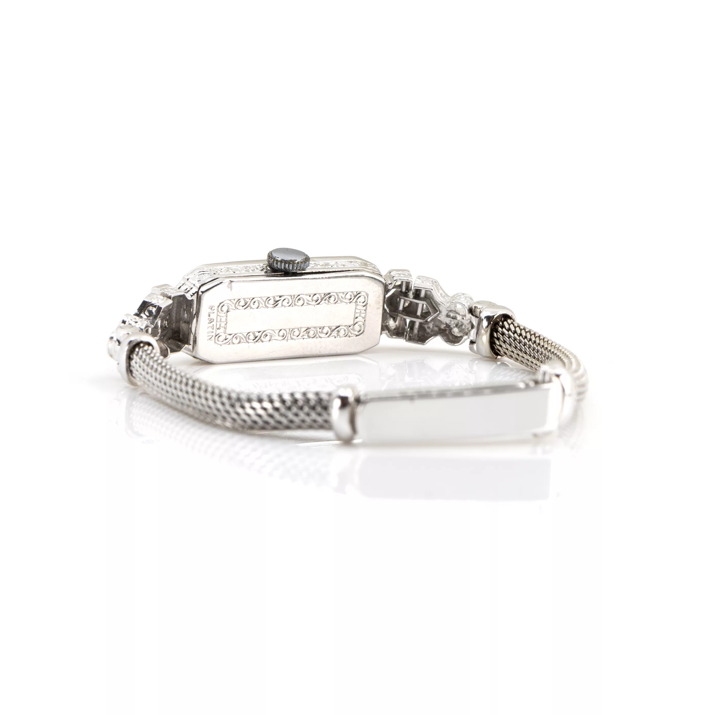 Hand-wound, platinum case, hallmarked, old and rose-cut diamonds, case 25 mm x 10 mm, bracelet 585 white gold, hallmarked, renewed, clasp 585 white gold, hallmarked, length 16.5 cm, pull clasp, weight approx. 20 g, function tested, working, dial somewhat corroded, without original box or papers