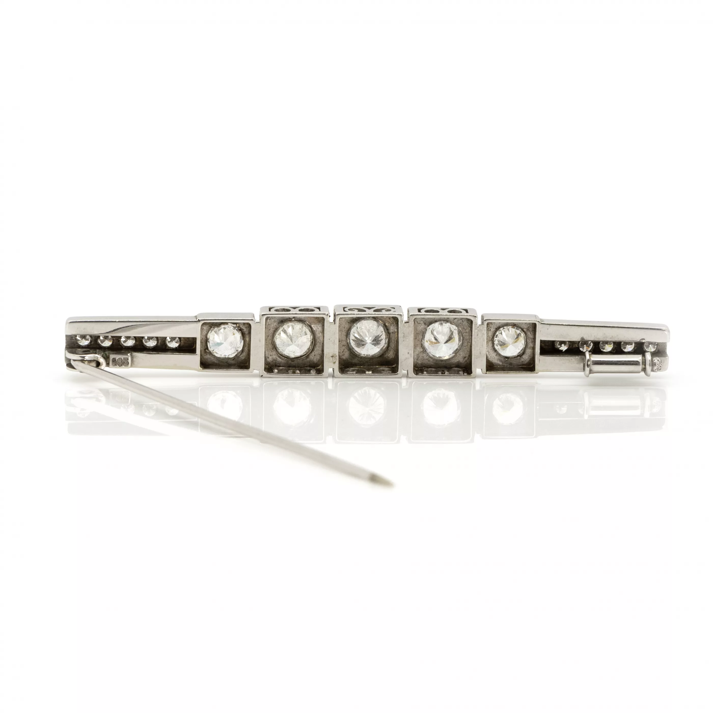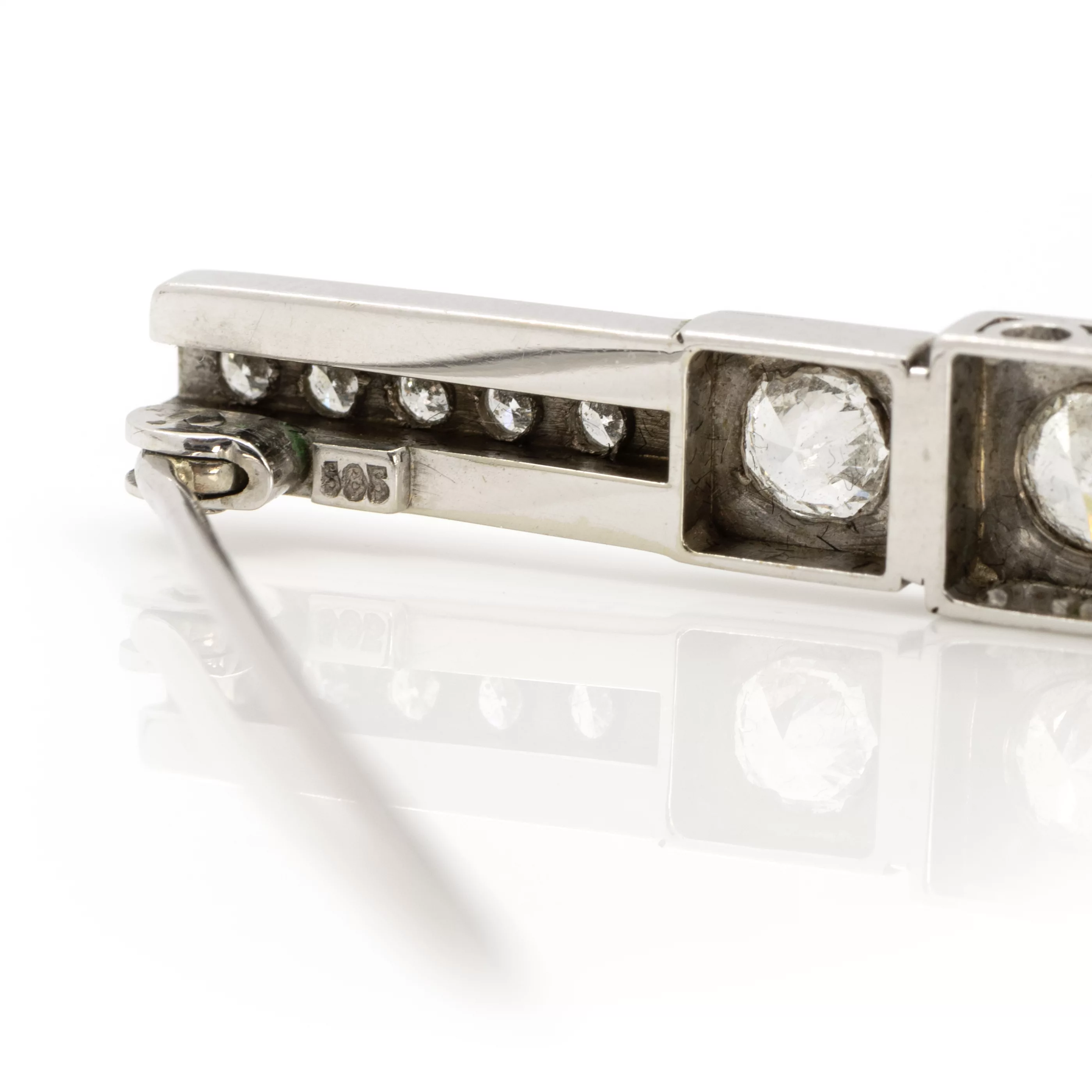Um 1930, 585 Weißgold, punziert, 15 Diamanten im Übergangsschliff, Mittelstein ca. 0,34 ct, Diamanten gesamt ca. 1,50 ct, I-L, si, Länge 6,5 cm, Gewicht ca. 7,5 g