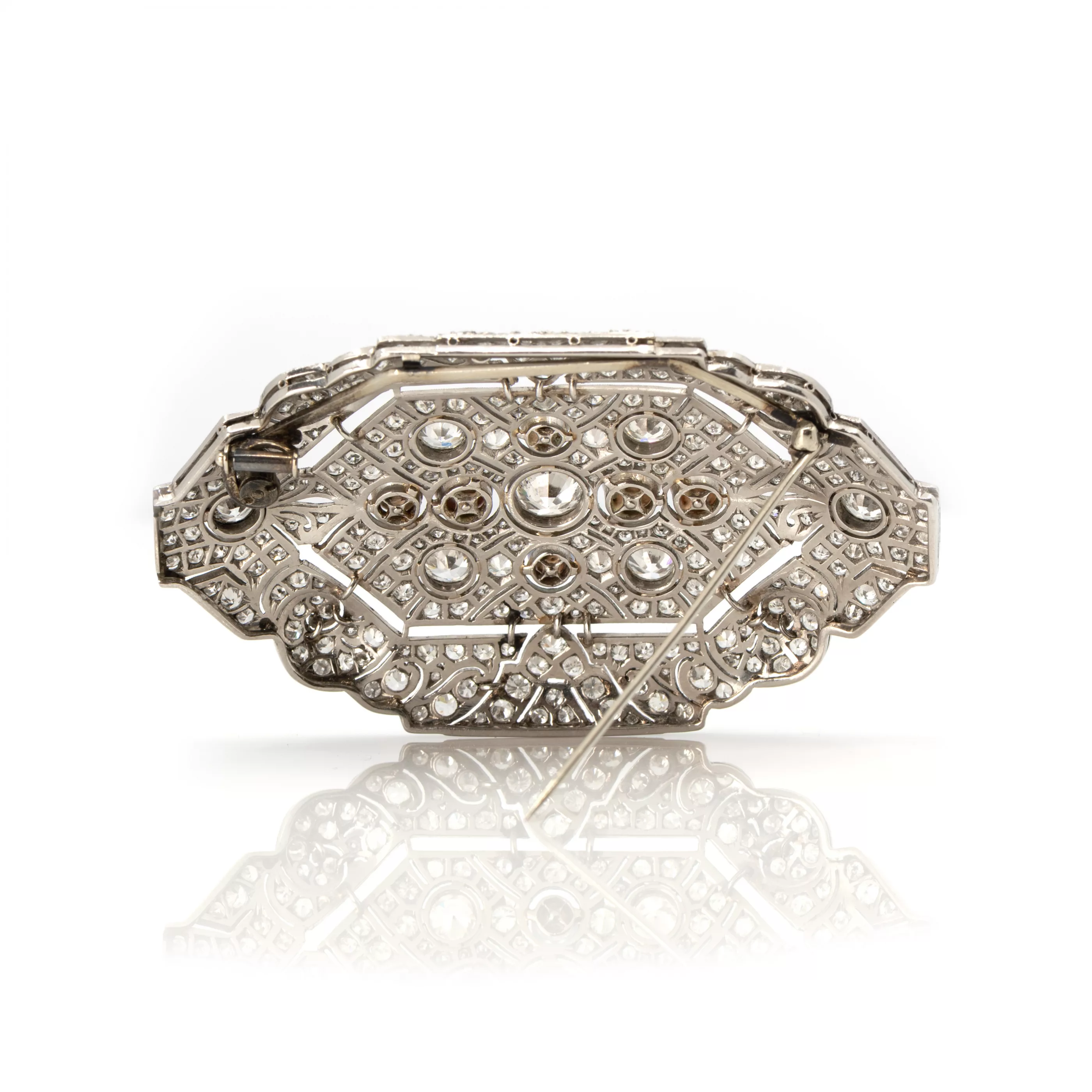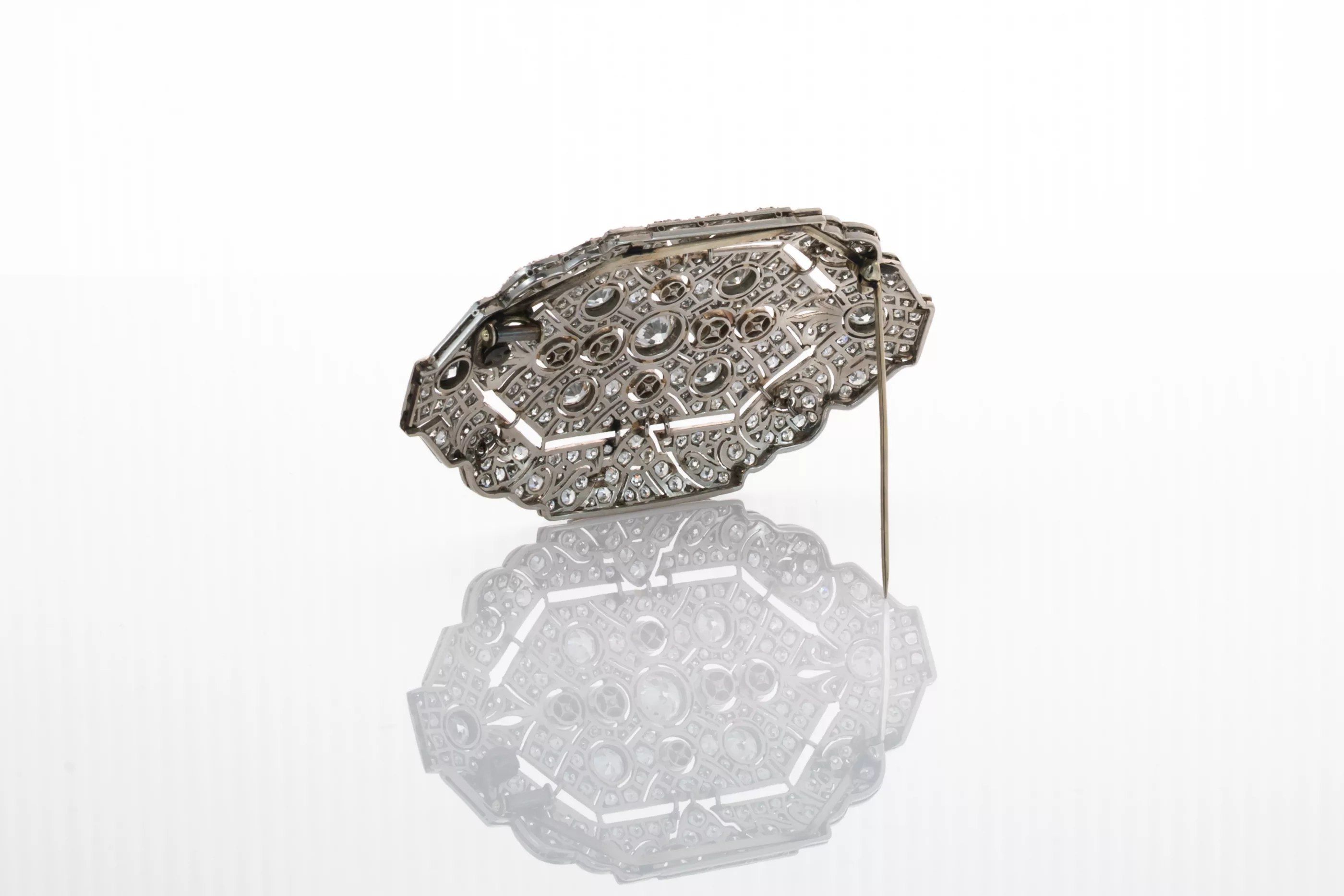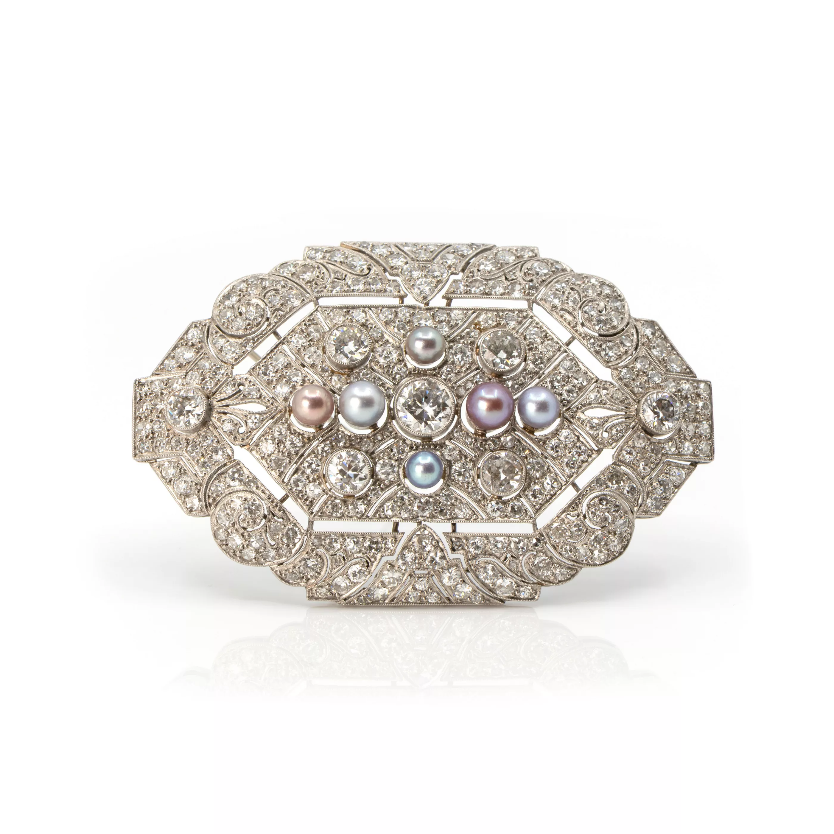 Um 1930, Platin, getestet, Nadel Silber, mittlerer Diamant im Altschliff ca. 1 ct, M, P1, 6 Diamanten im Altschliff je 0,5 ct, M, SI, umgeben von ca. 272 Diamanten im Altschliff insgesamt ca. 11,78 ct, VSI-SI, H-J, 6 lavendel-farbene Perlen, Gesamtgewicht ca. 33,5 g, Maße: 5,3 cm x 7,5 cm Geometrisch durchbrochene Form, dekoriert mit Millegriffes an den Fassblenden