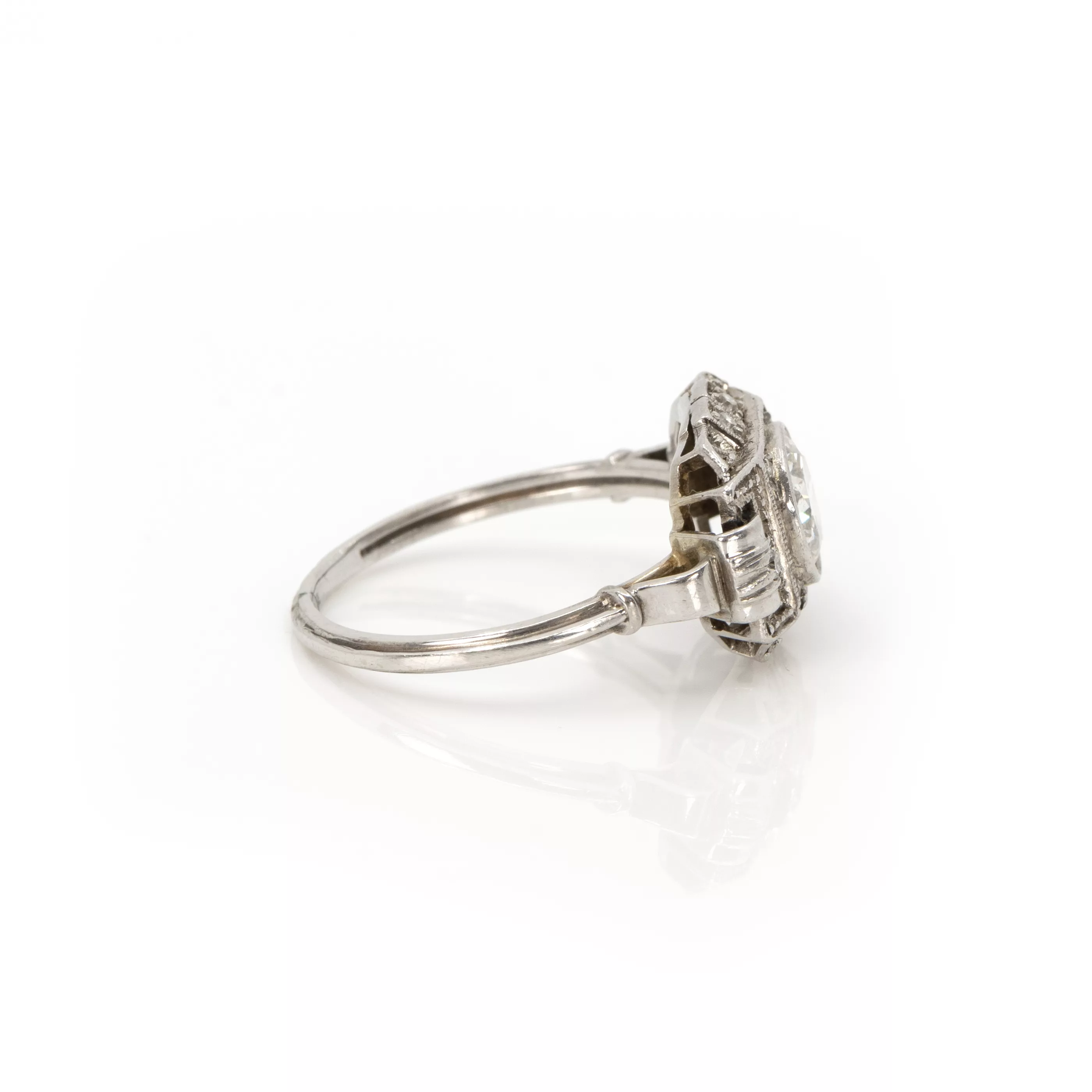 585 white gold, tested, central diamond in transitional cut, approx. 0.80 ct, the remaining 6 diamonds in octagonal cut, total approx. 0.06 ct, H, vs, RW 53, weight approx. 3 g