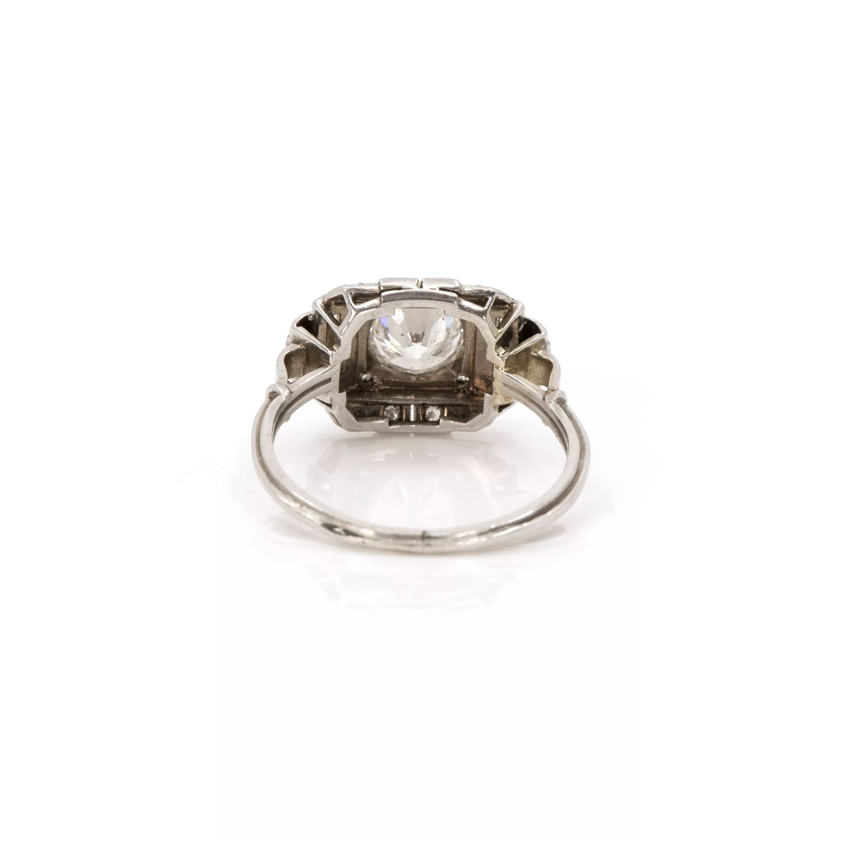 585 Weißgold, geprüft, zentraler Diamant im Übergangsschliff, ca. 0,80 ct, die übrigen 6 Diamanten im Achtkantschliff, gesamt ca. 0,06 ct, H, vs, RW 53, Gewicht ca. 3 g
