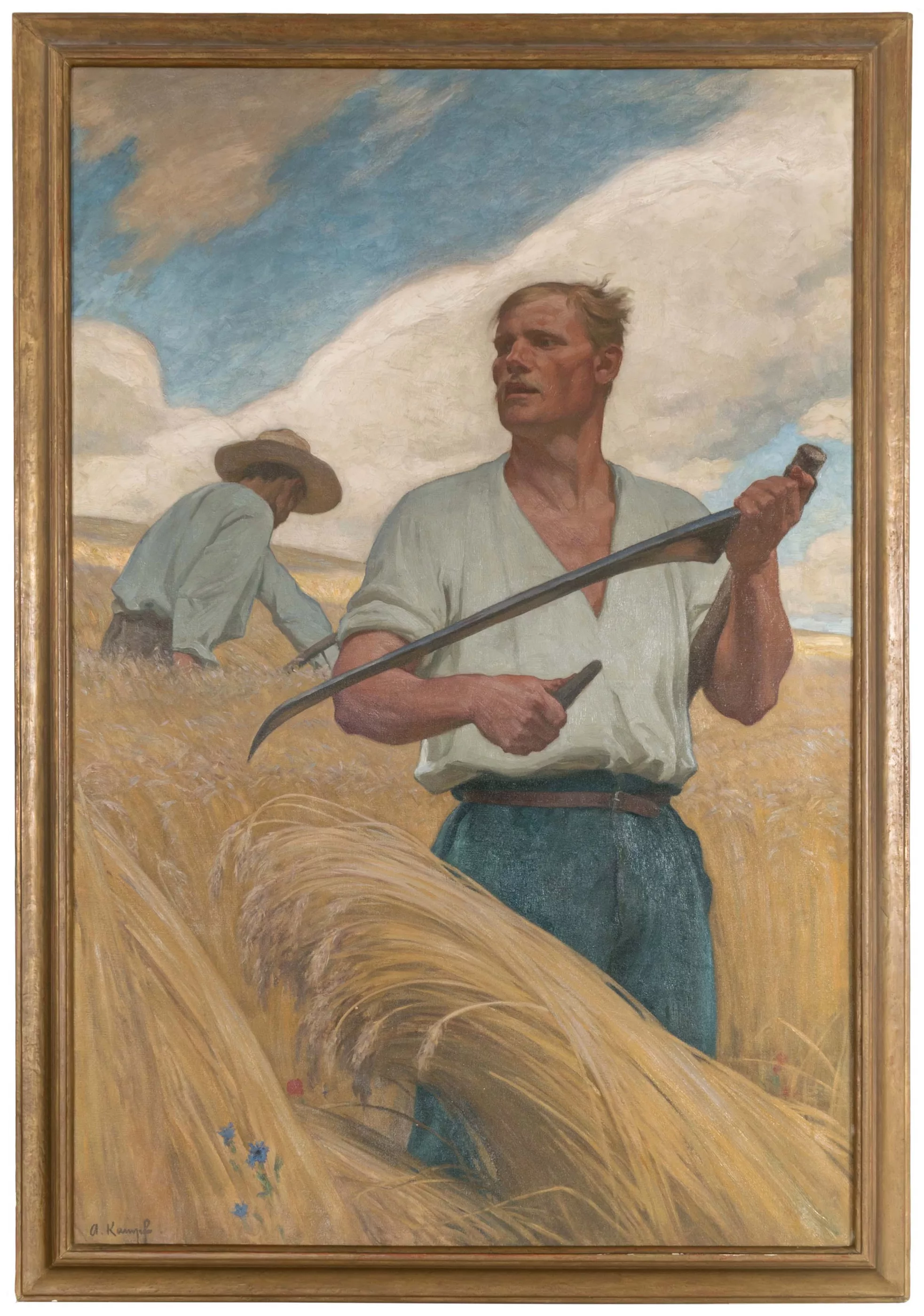 'Schnitter', Tempera auf Leinwand, 150 cm x 100,5 cm Leinwandmaß, signiert, verso signiert, Berlin ortsbezeichnet, partiell leicht craqueliert, partiell kleine Farbabplatzer, leicht retuschiert, reinigungsbedürftig, Literatur: Wvz. Schroyen G 1934/IX; Kat. Akademie der Künste Berlin, Frühjahr 1934, Nr. 80; Das Bild. Monatsschrift für das deutsche Kunstschaffen in Vergangenheit und Gegenwart, 5/1935, S. 156, mit Abb. S. 160, Provenienz: Berlin 1934; München 1935, Berliner Kunst; Privatsammlung Nordrhein-Westfalen