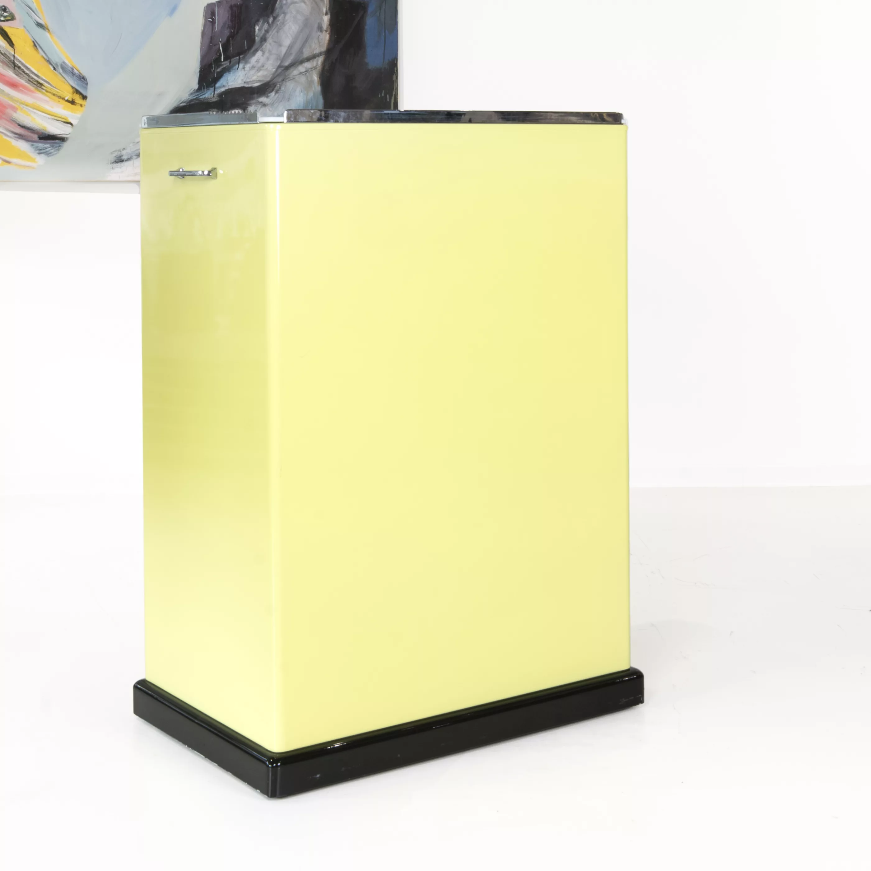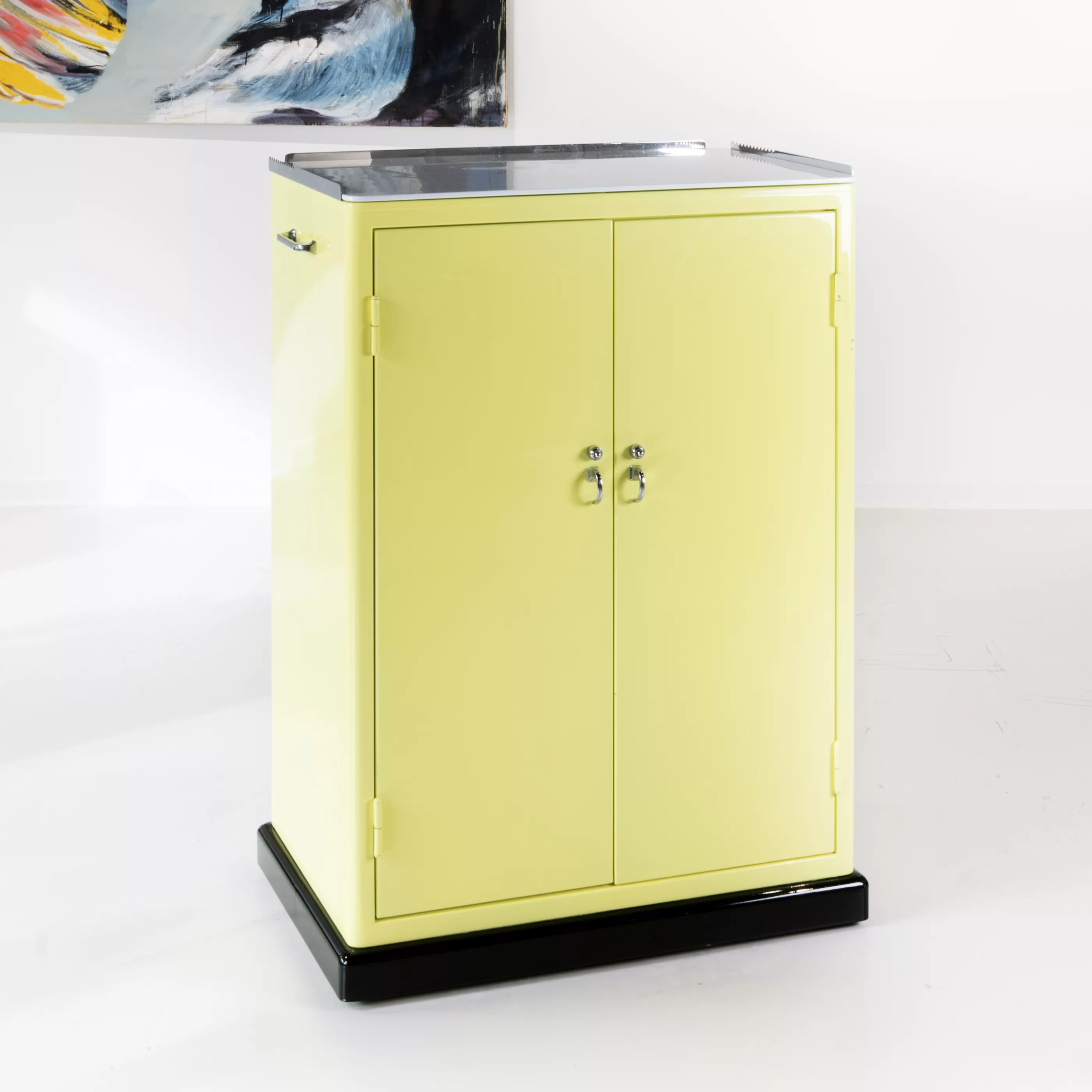 Entwurf vermutlich von Karl Baisch (1869 - 1943), lackiertes Metall, 103 x 71 x 47 cm, Zustand B, Lack partiell berieben, vereinzelt Farbabplatzer, 3 Einlegeböden aus Glas anbei
