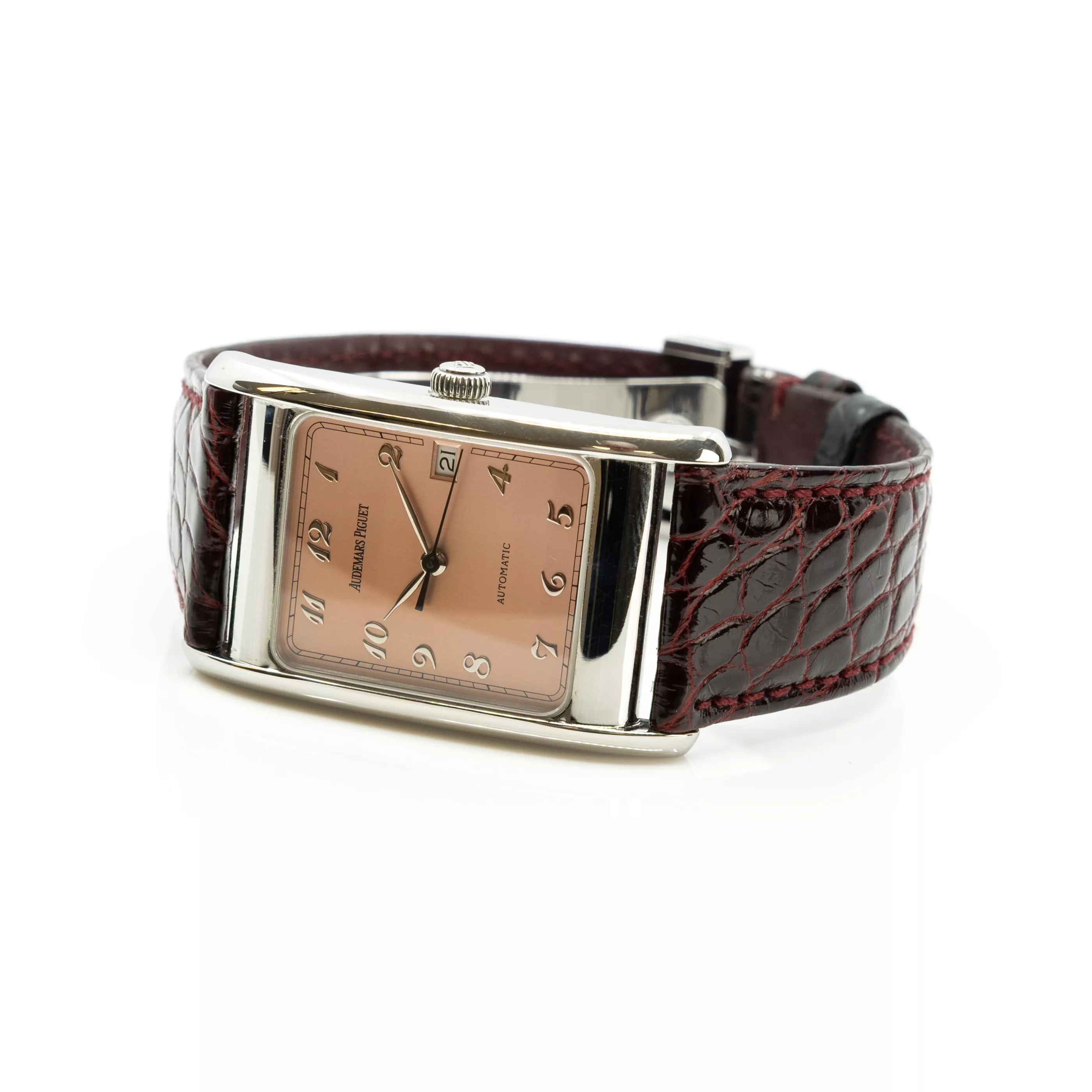 Automatik, Referenz-Nr. 15015ST/O/0002/02 | Werk-Nr. 442176 | Gehäuse-Nr. D83009 | Kaliber 2140, Gehäuse Stahl, rosafarbenes Zifferblatt, Datum bei 3 Uhr, Gehäuse 36 x 27 mm, Original-Armband, Leder, Original-Schließe, Stahl, Länge 22 cm, Gewicht ca. 54 g, Funktion gangbar, geprüft, Zustand sehr gut, Armbandrückseite mit Klebespuren, mit Original-Ledermäppchen, -Papieren und Umverpackung sowie Audemars Piguet Notizblock
