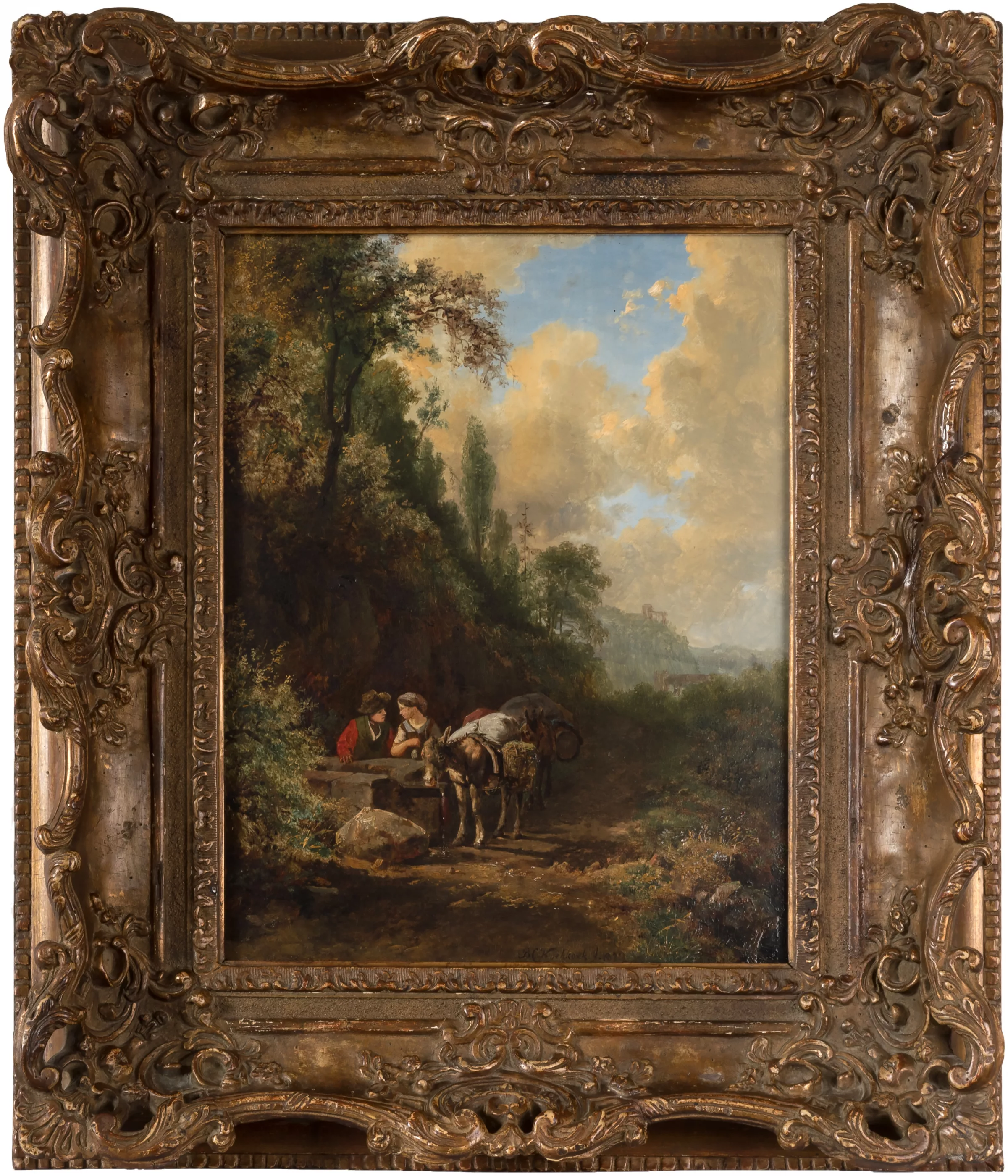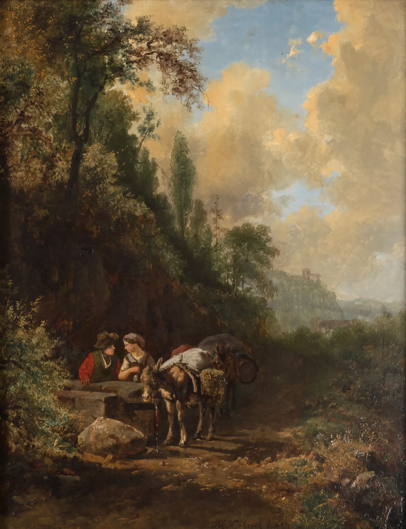 Die Rast, Öl auf Holz, 38 cm x 29,5 cm Werkmaß, signiert, 1829 datiert, leicht craqueliert, partiell retuschiert