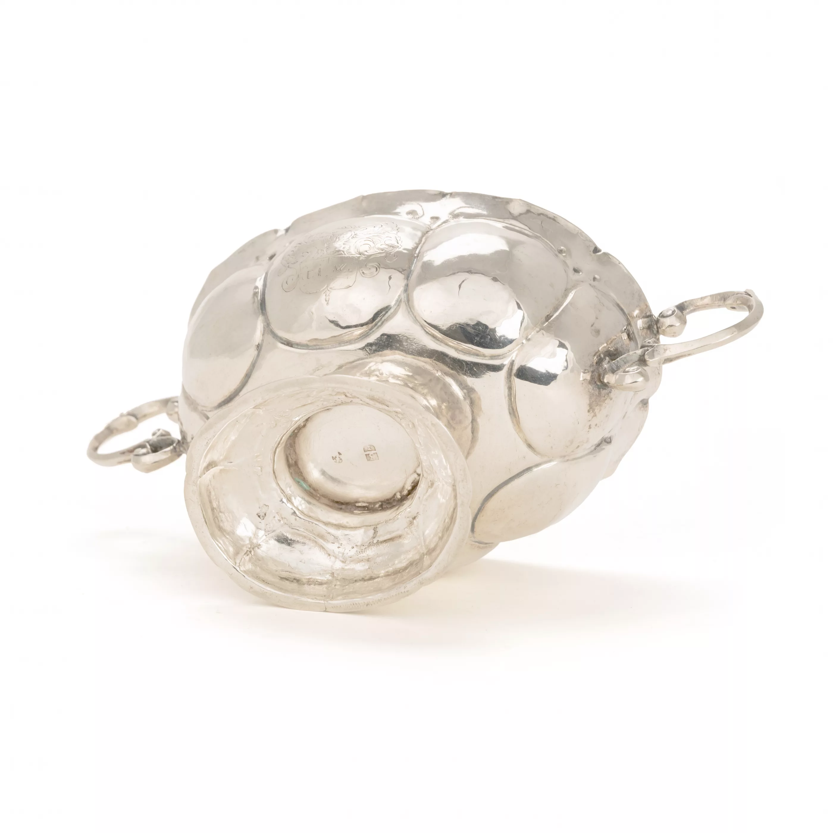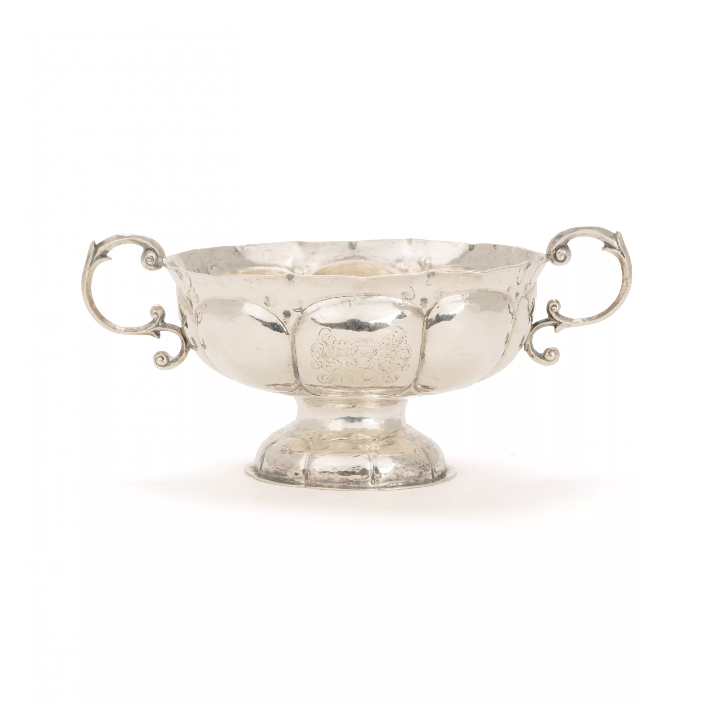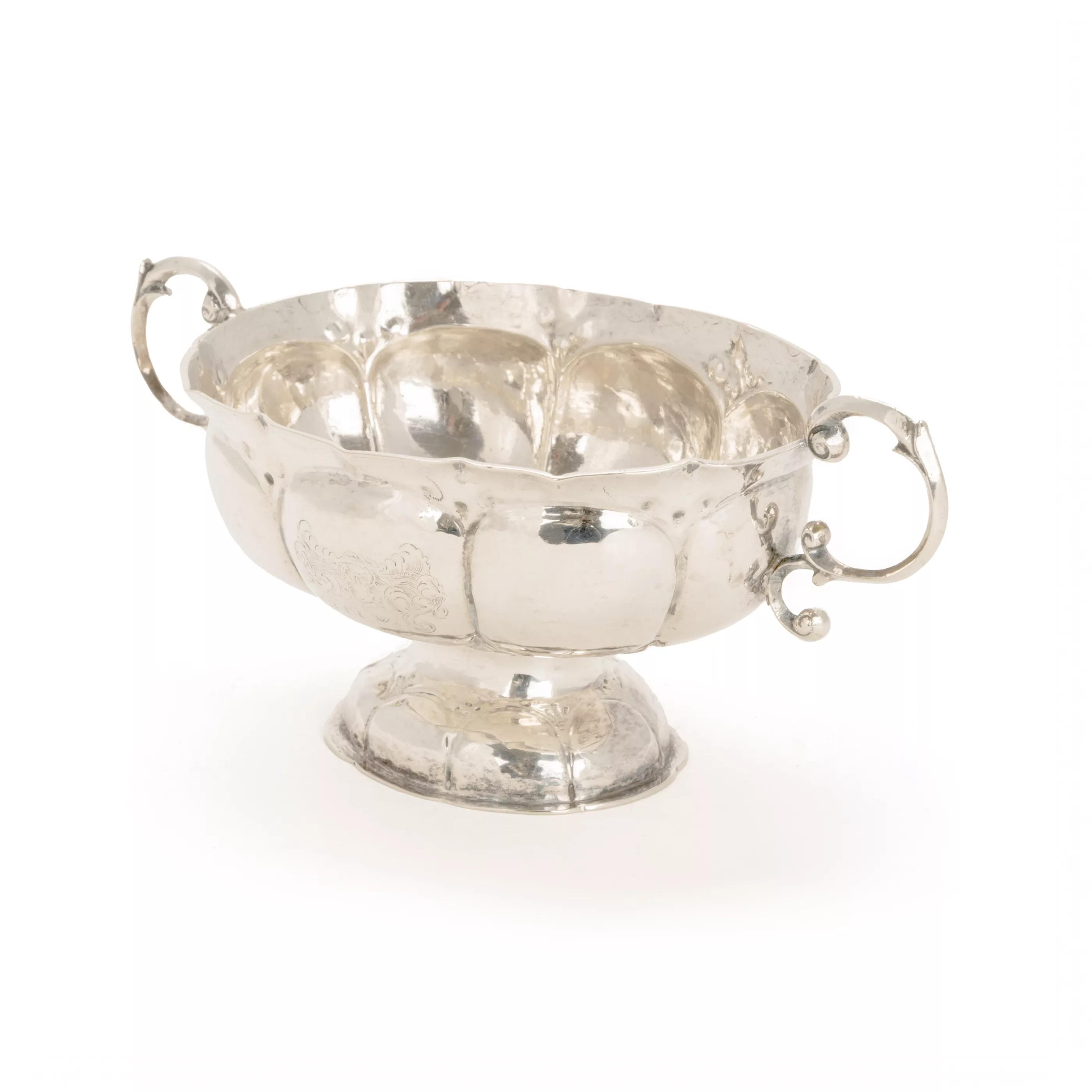 Niederlande, Groningen/Friesland, 1664, Silber, geprüft, Meisterzeichen Lilie im Oval, gegossen, getrieben, auf ovalem, 8-fach gebuckelten Fuß die entsprechend gestaltete Schale, seitlich gegossene S-Henkel, partiell Punktstichgravuren, eine Seite frontal mit Wappengravur, Höhe 10 cm, Breite 22 cm, Gewicht ca. 226 g, altersgemäßer Zustand, Expertise von 1991 anbei