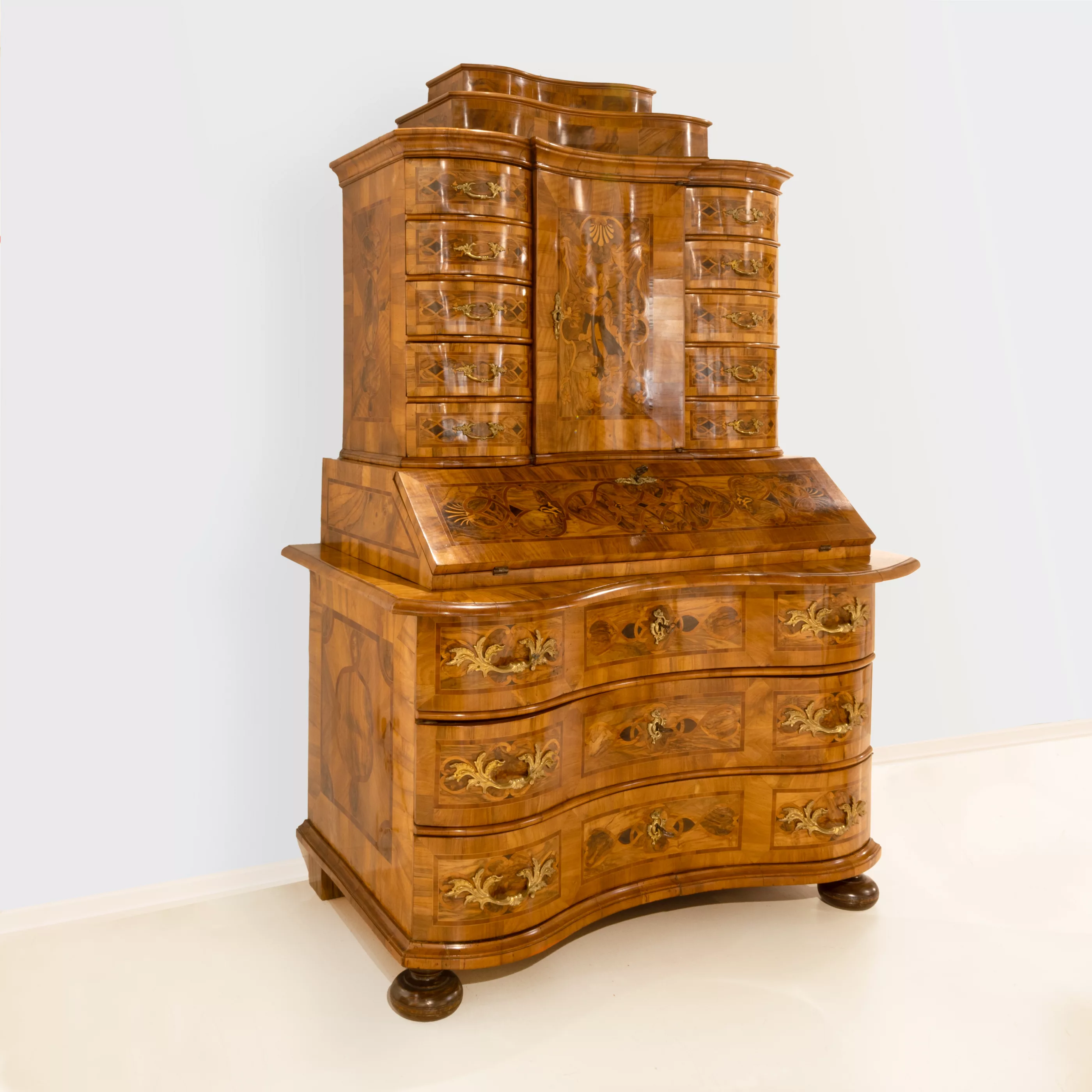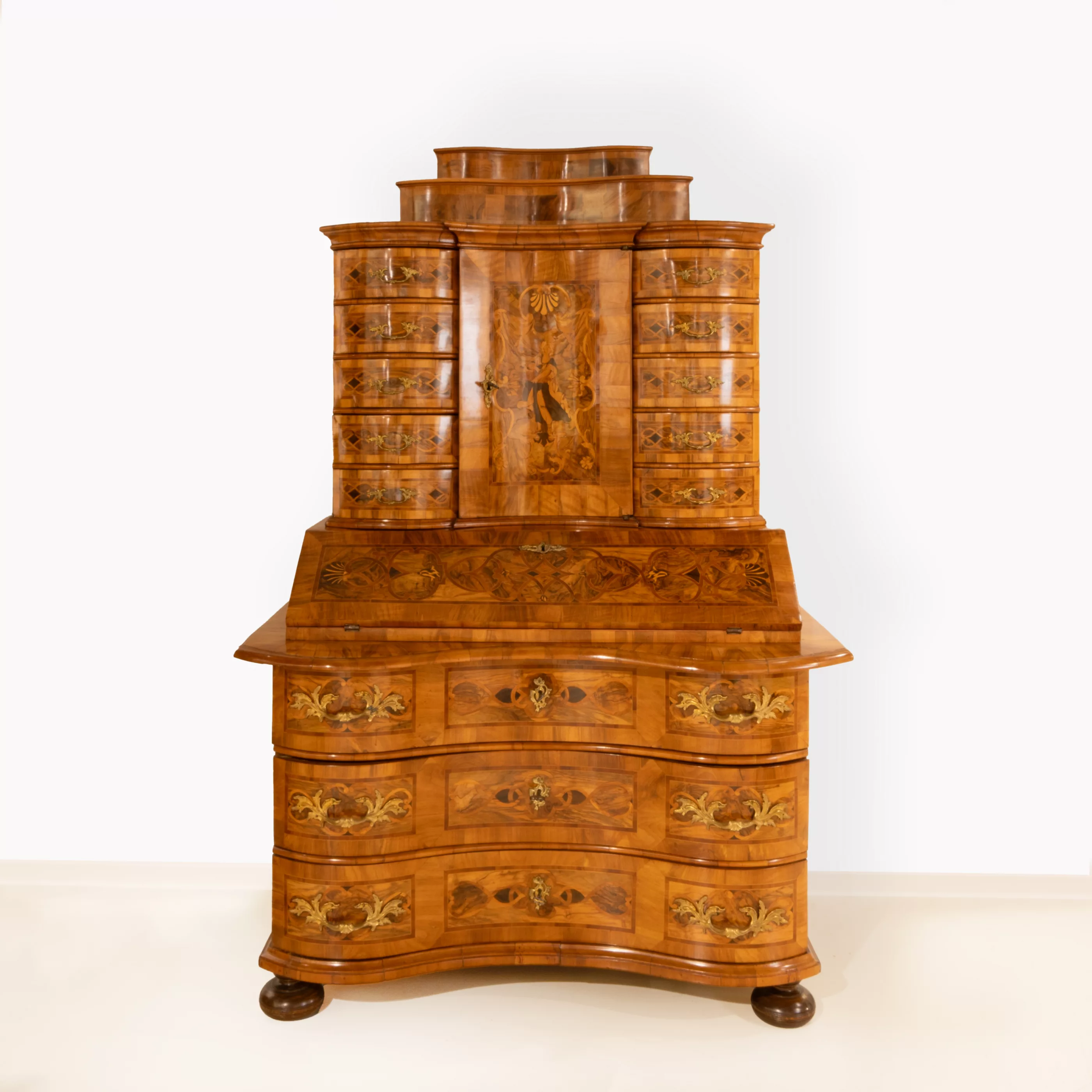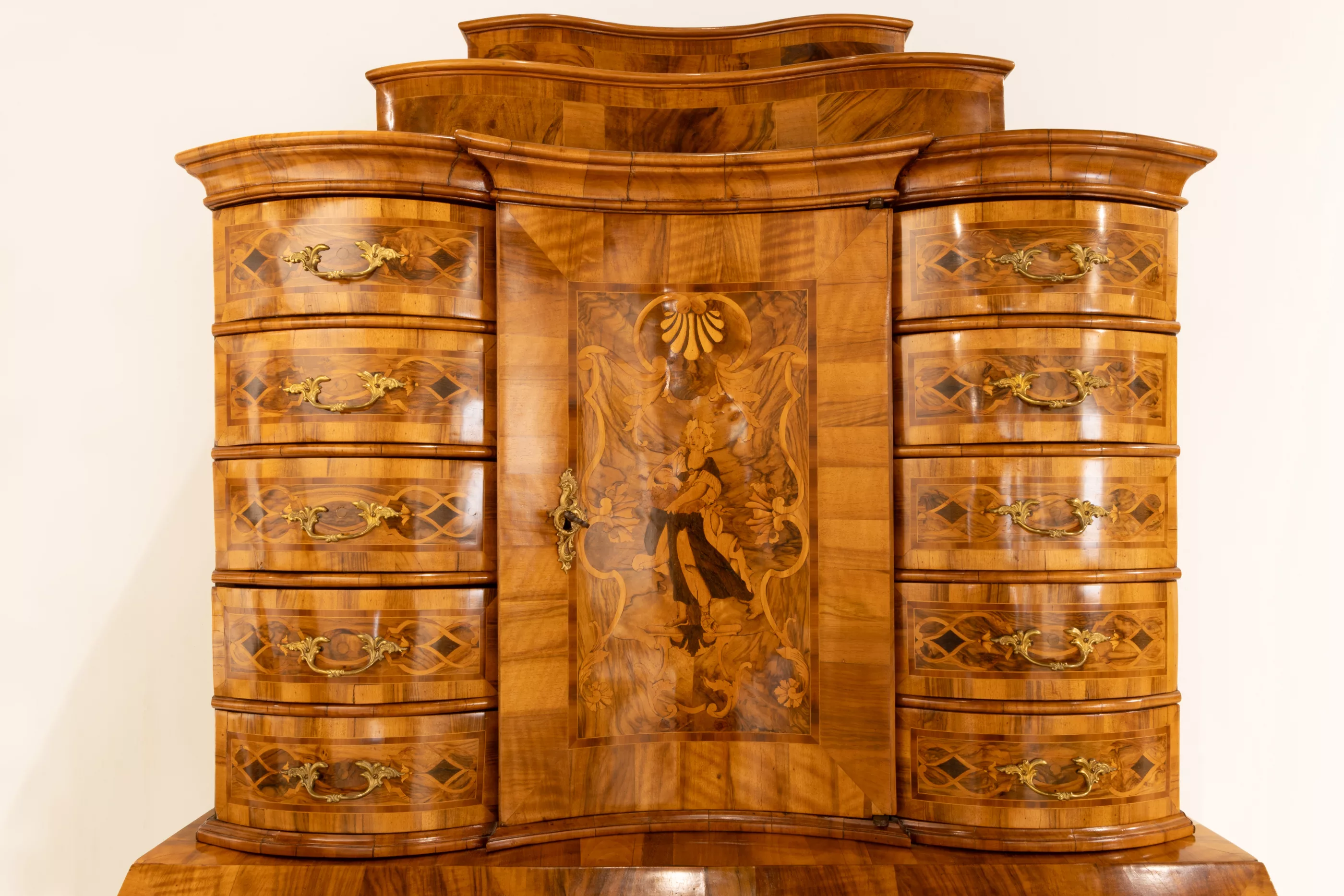 18. Jh., Weichholz, furniert mit Nussbaum und Nusswurzelmaser, geschwungenes Kommodenunterteil mit drei Schüben, Tabernakelaufsatz mit verschließbarem Schreibfach mit vier Schubladen, partiell mit Papier ausgekleidet, Lederschreibfläche, darüber 10-schübiger zurückgesetzter Aufbau, zentrale Tür mit Intarsie einer Frau mit Blumenkorb und Rocailleverzierungen, innen 3 Fächer mit Papier ausgekleidet, bekrönendes, gestuftes Gesims, vorne gedrückte Kugelfüße, Messingbeschläge, 198,5 x 132 x 80 cm Zustand B/C, Oberteil nachträglich ergänzt, restauriert, Tür verzogen, partiell Trockenrisse, Lederauskleidung neueren Datums, Messingbeschläge erneuert