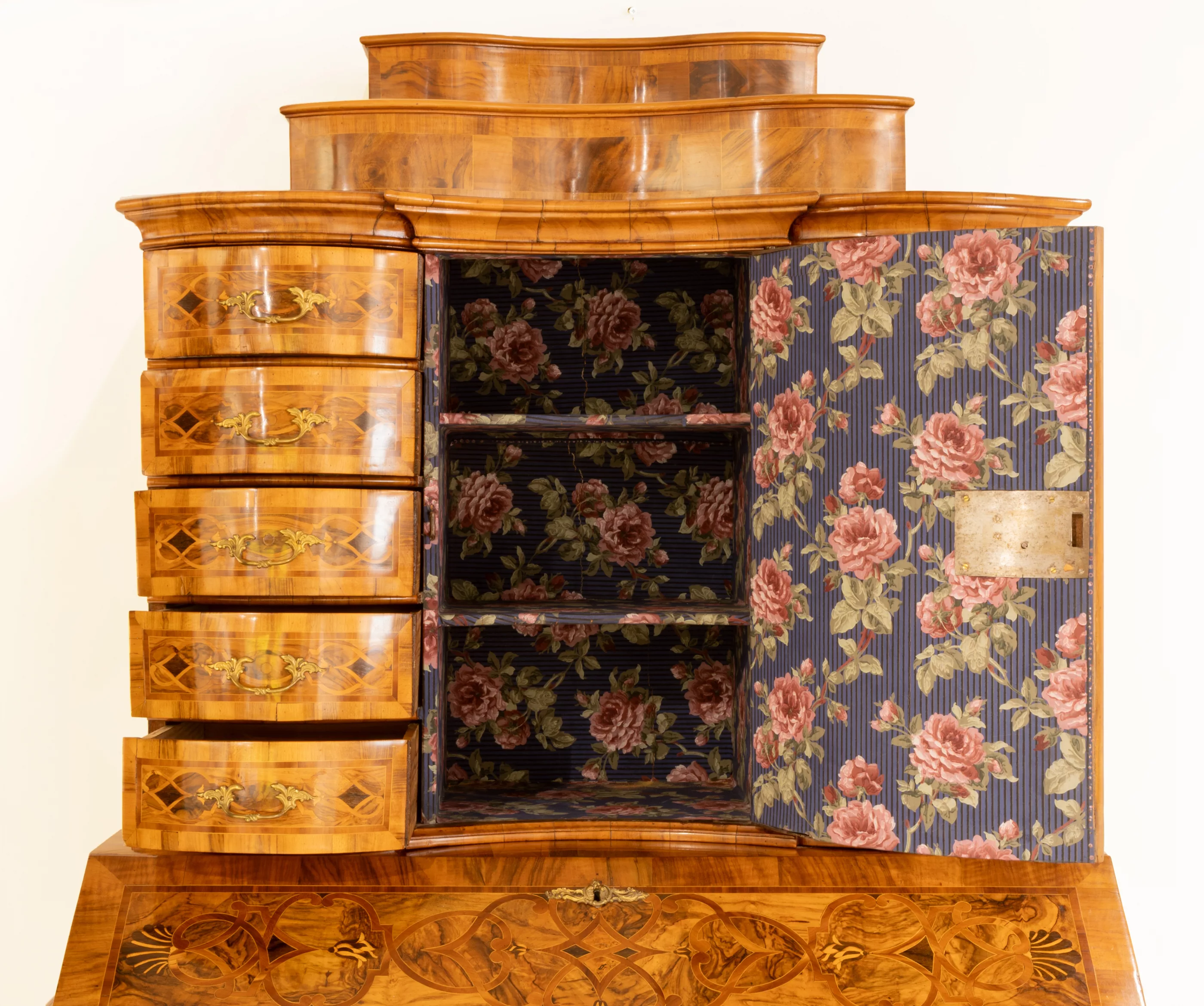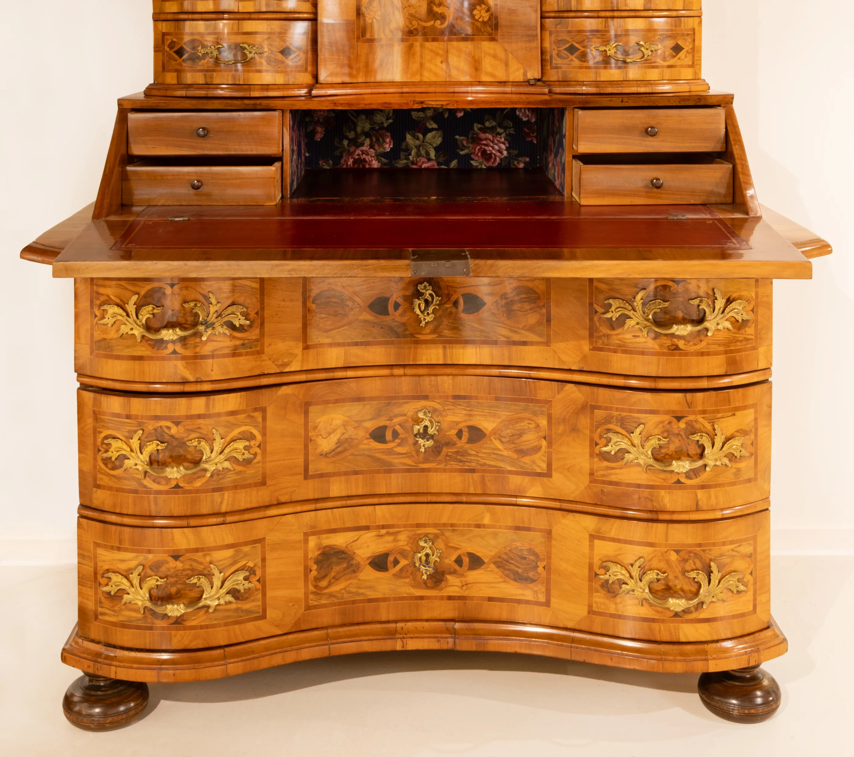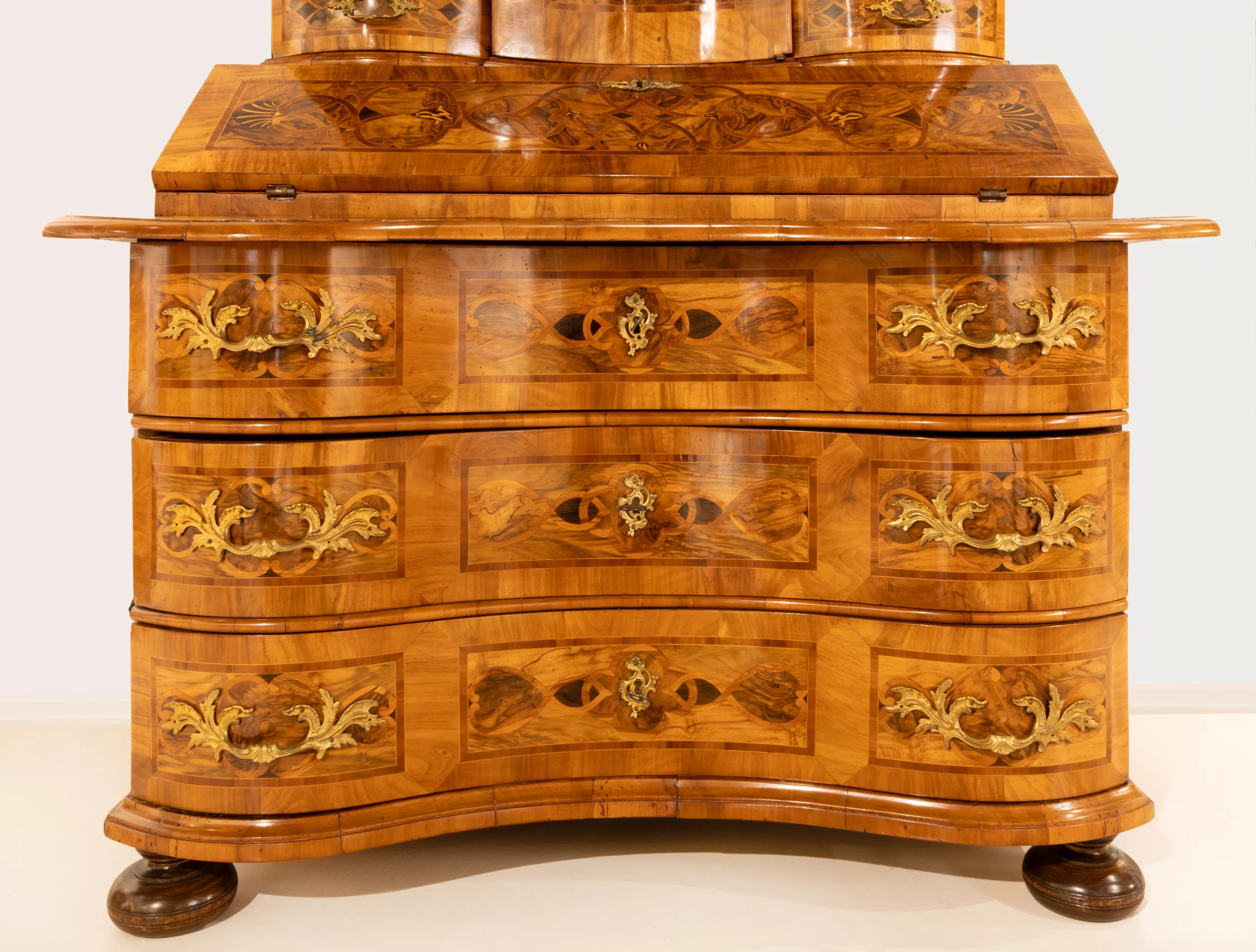 18. Jh., Weichholz, furniert mit Nussbaum und Nusswurzelmaser, geschwungenes Kommodenunterteil mit drei Schüben, Tabernakelaufsatz mit verschließbarem Schreibfach mit vier Schubladen, partiell mit Papier ausgekleidet, Lederschreibfläche, darüber 10-schübiger zurückgesetzter Aufbau, zentrale Tür mit Intarsie einer Frau mit Blumenkorb und Rocailleverzierungen, innen 3 Fächer mit Papier ausgekleidet, bekrönendes, gestuftes Gesims, vorne gedrückte Kugelfüße, Messingbeschläge, 198,5 x 132 x 80 cm Zustand B/C, Oberteil nachträglich ergänzt, restauriert, Tür verzogen, partiell Trockenrisse, Lederauskleidung neueren Datums, Messingbeschläge erneuert