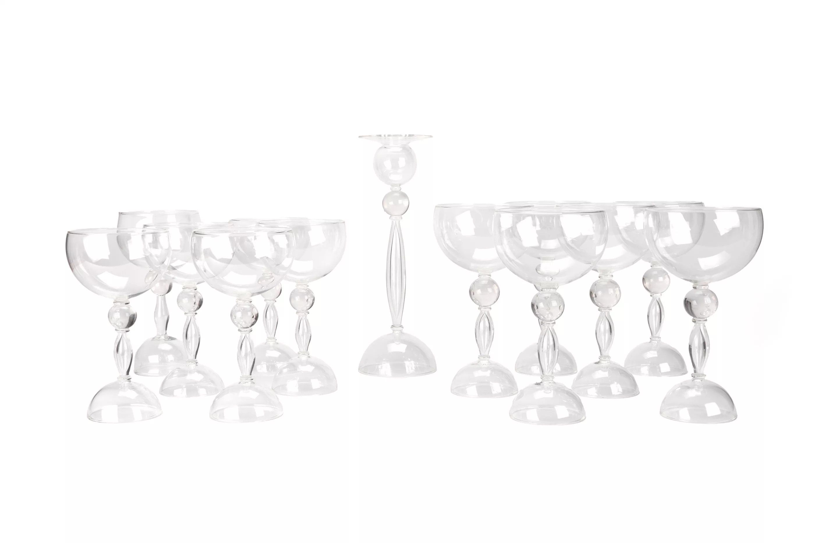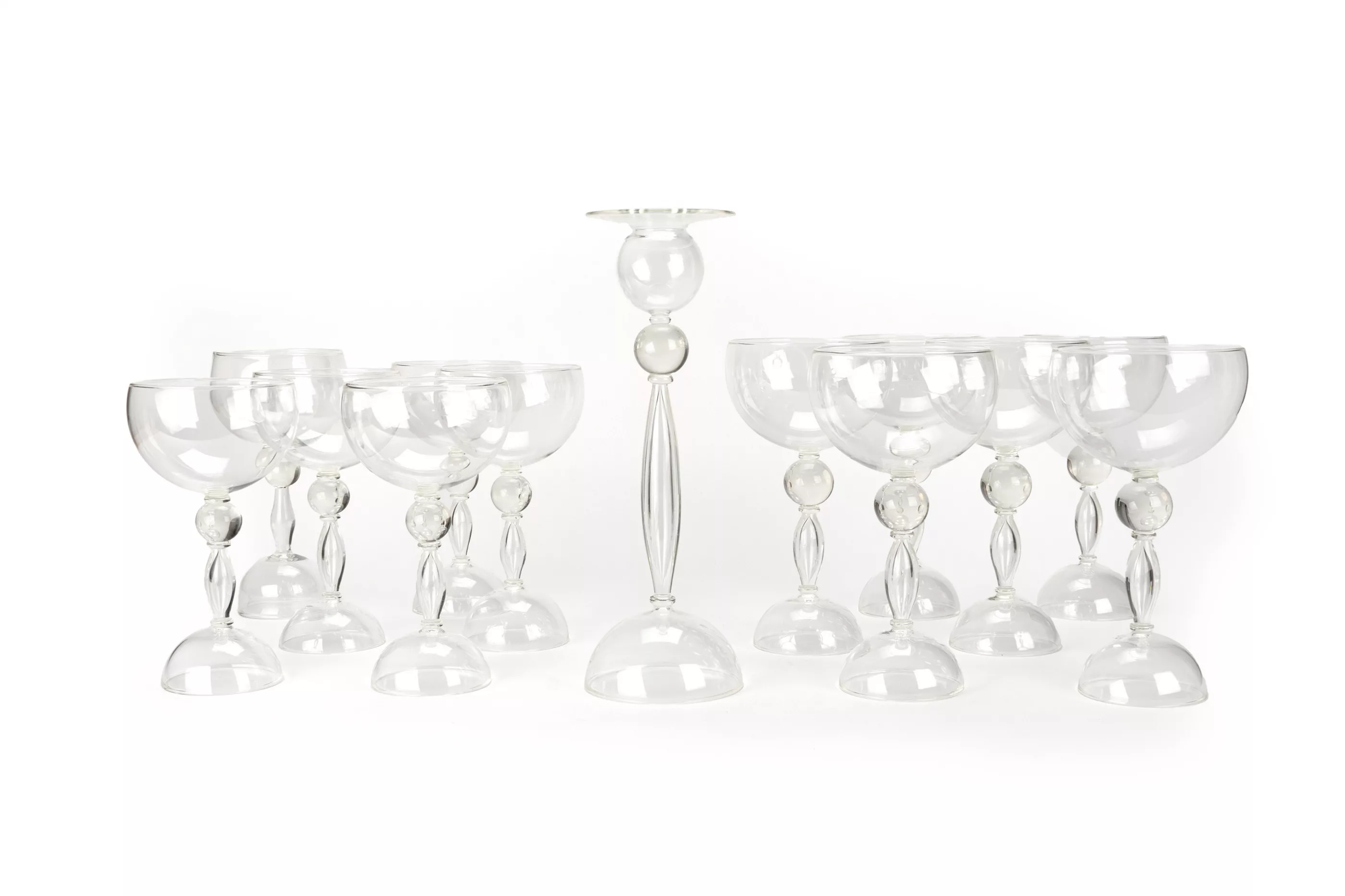 13-tlg., Entwurf von Matthäus Antonius Maria Graf von Thun und Hohenstein (1952 Bozen) aus dem Jahr 1984 für Barovier & Toso, Murano Venedig, Italien, nach 1984, farbloses Glas, 'soffiatura a lume'-Technik (traditionelle Glasbläsertechnik aus Italien), 6 Weißweingläser Höhe 18 cm bis 19 cm, 6 Rotweingläser Höhe 20 cm, 1 Kerzenständer Höhe 27,5 cm, 1 Weißweinglas mit Ätzmonogramm, Zustand A, minimale Gebrauchsspuren