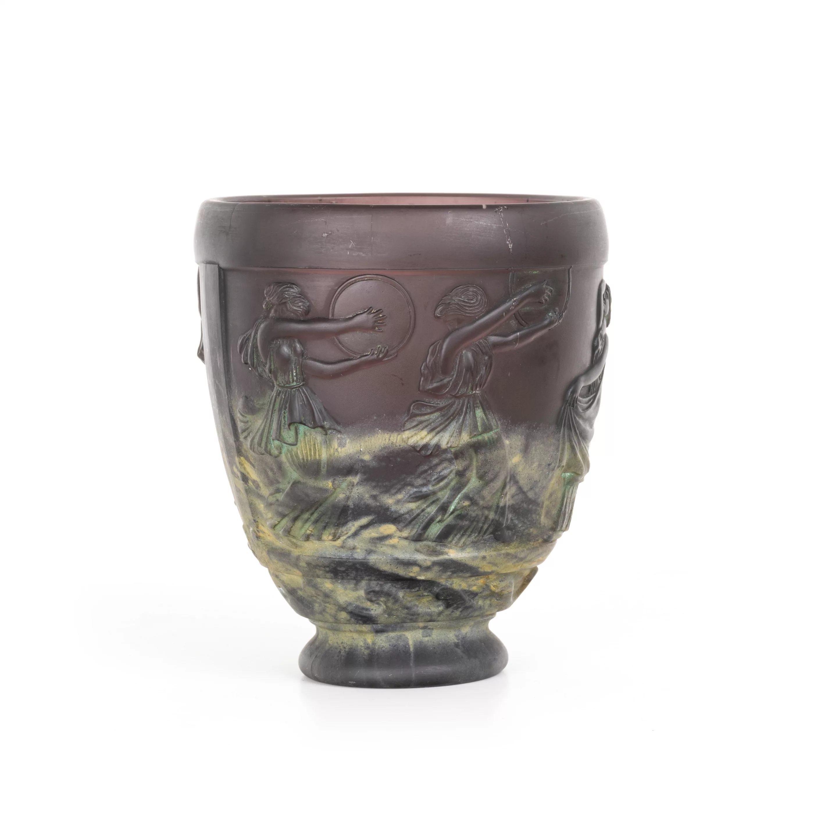 France, around 1910, violet moulded glass with yellow streaks, height 14 cm, surrounding frieze in relief with antique female figures playing music, rubbed with individual scratches, one bump with circumferential hairline crack