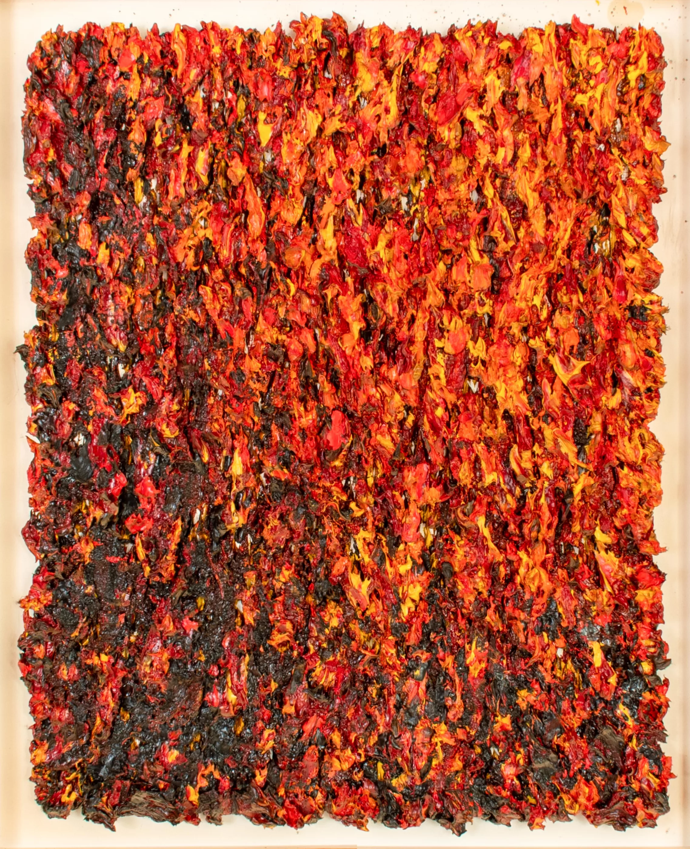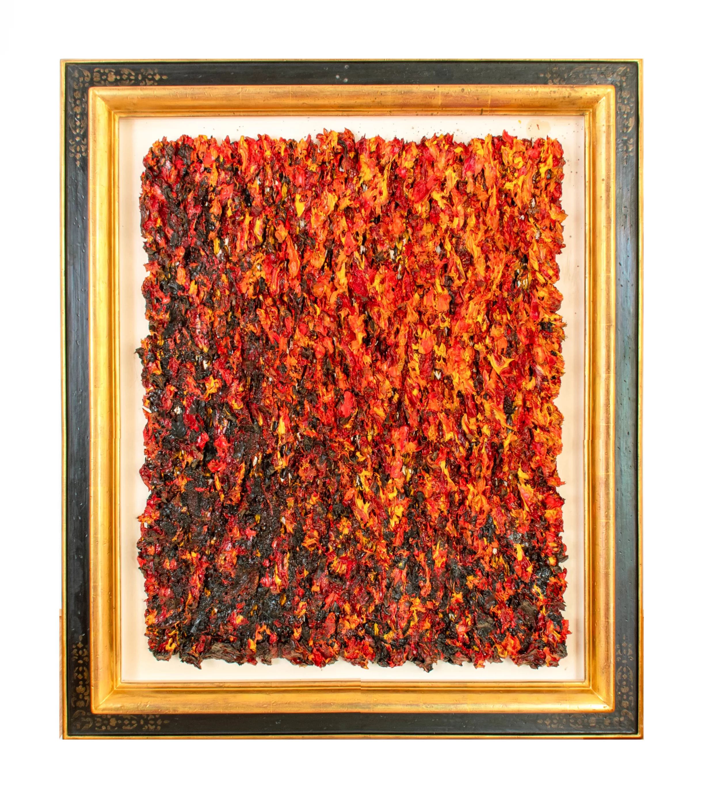 Flammenbild, Gold, Rot, Schwarz, Öl auf Leinwand, 80 x 105 cm, rückseitig doppelt signiert, 1988-1994 datiert, partiell beri
