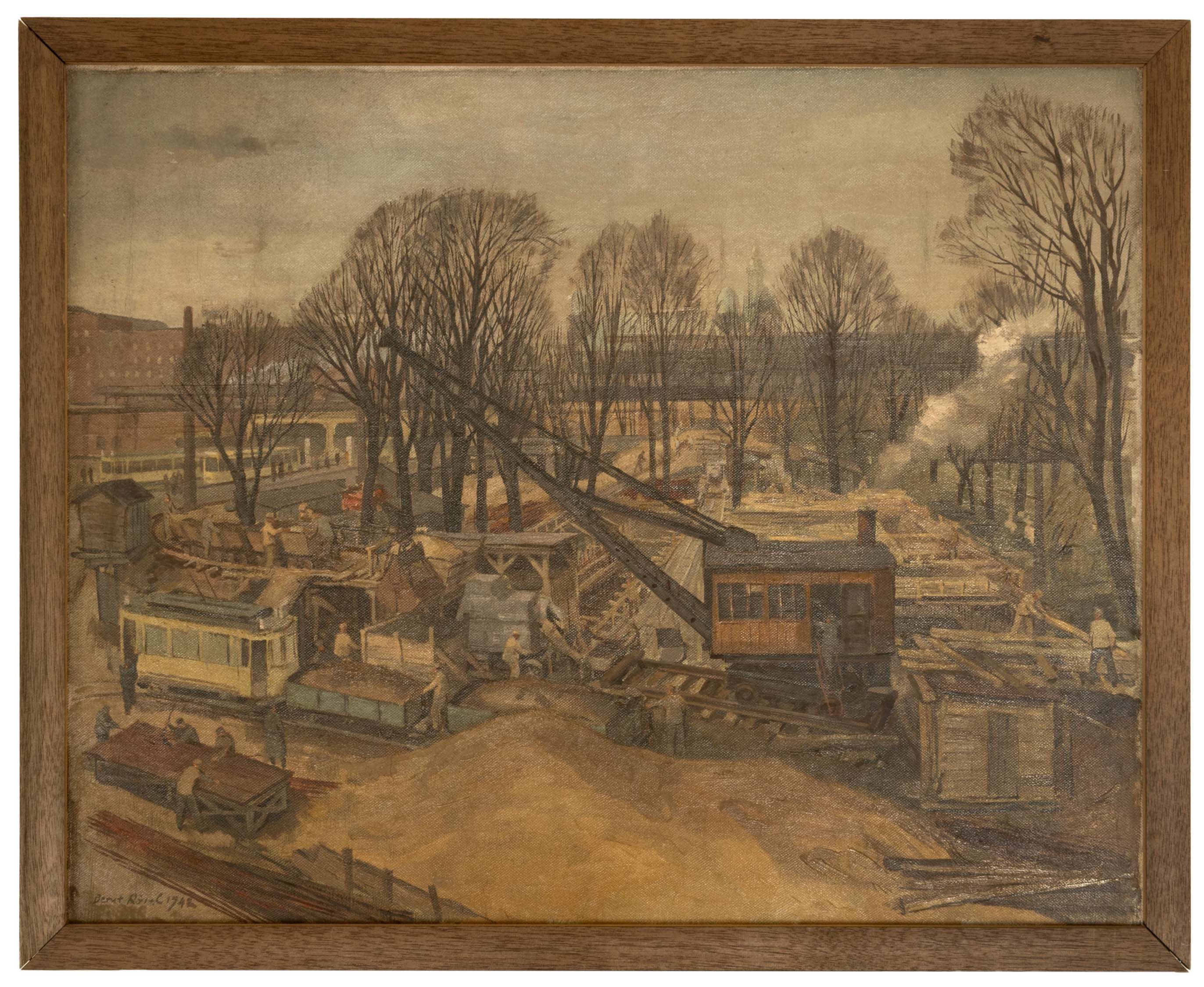 View of Essen Central Station, oil on hardboard, 67 cm x 84 cm object dimensions, signed, dated 1942, in need of cleaning, partially craquelured