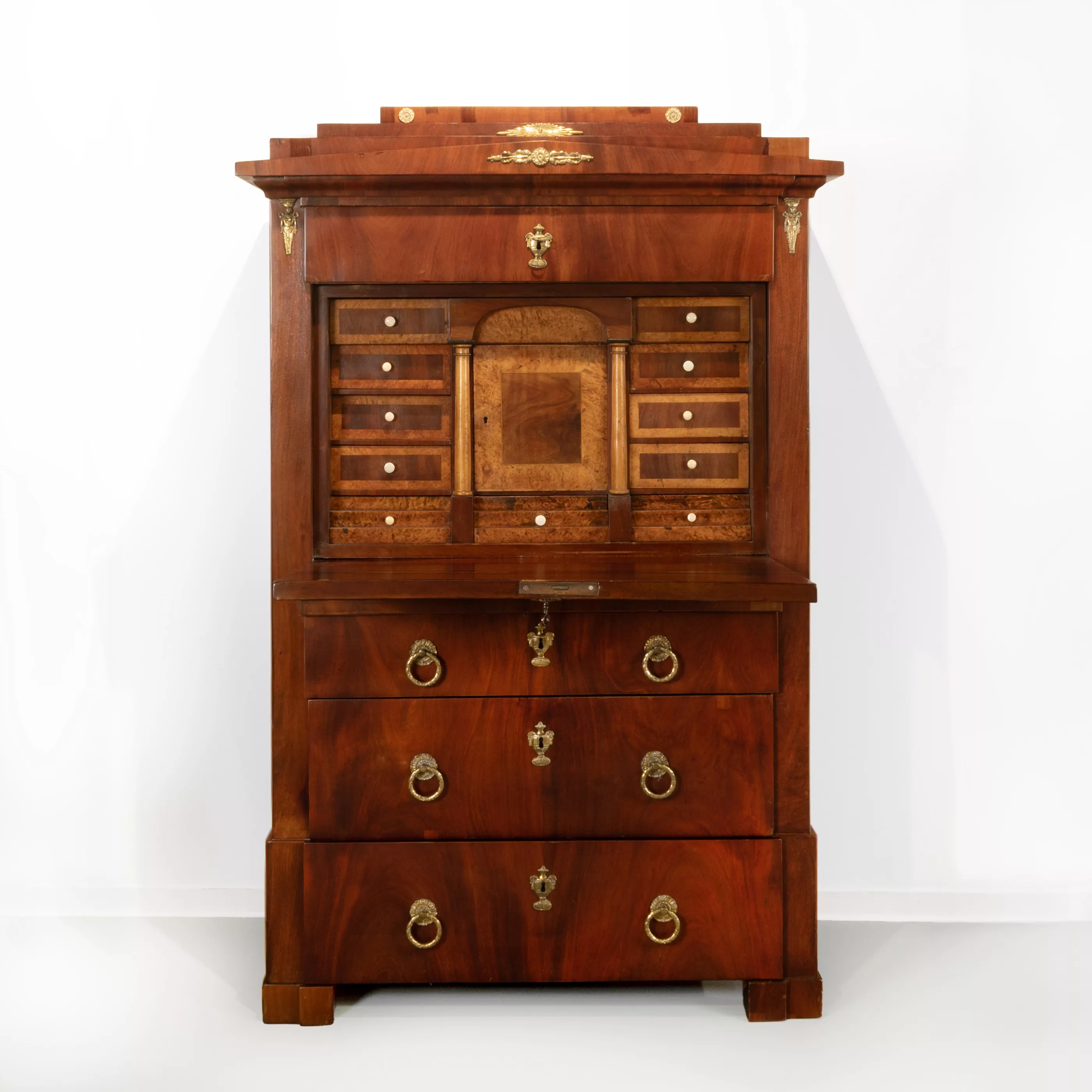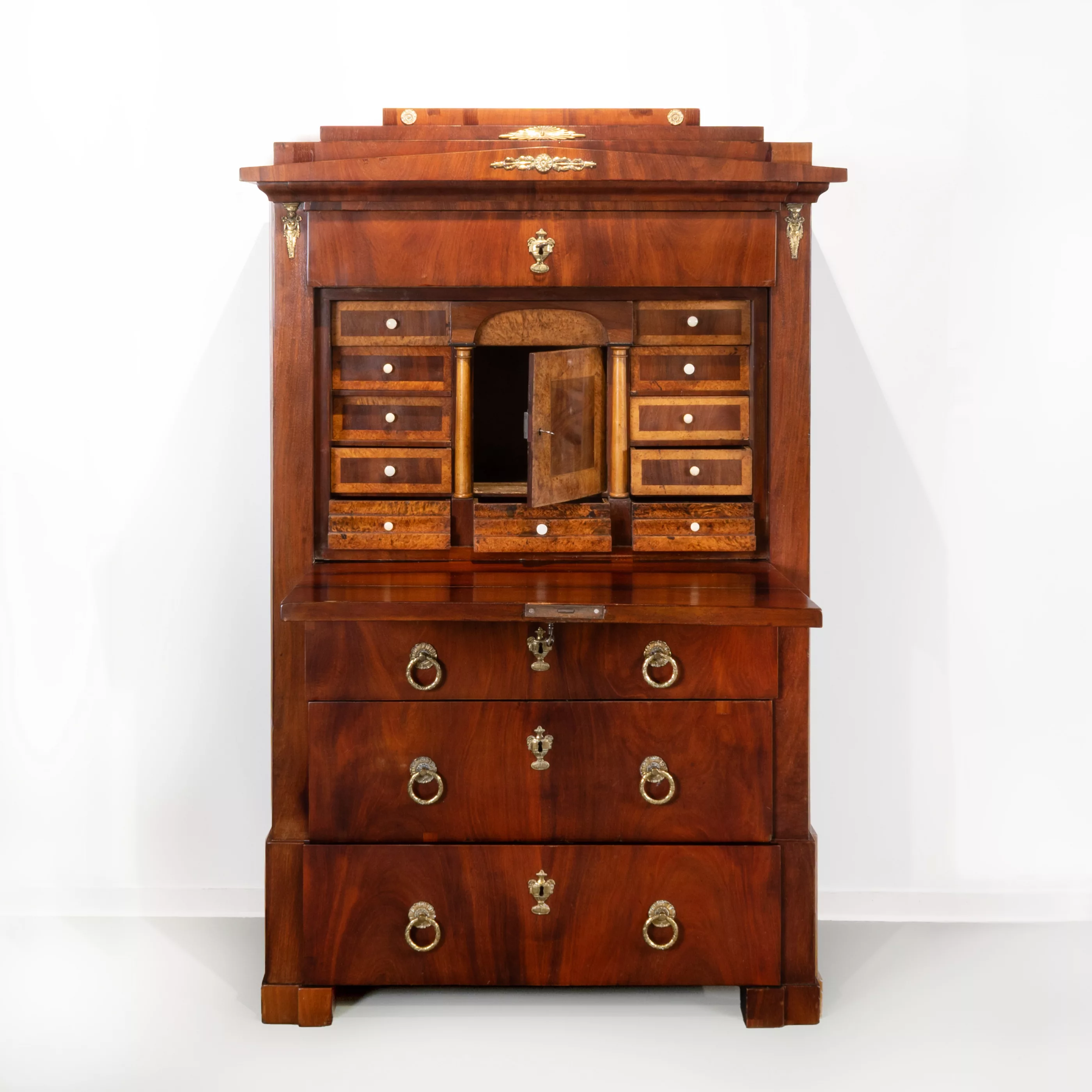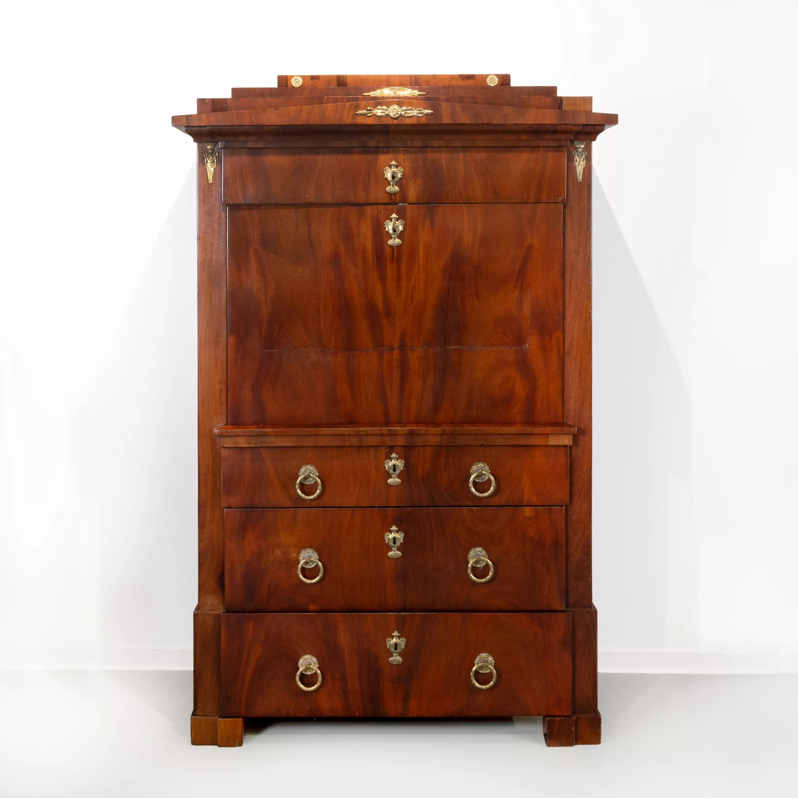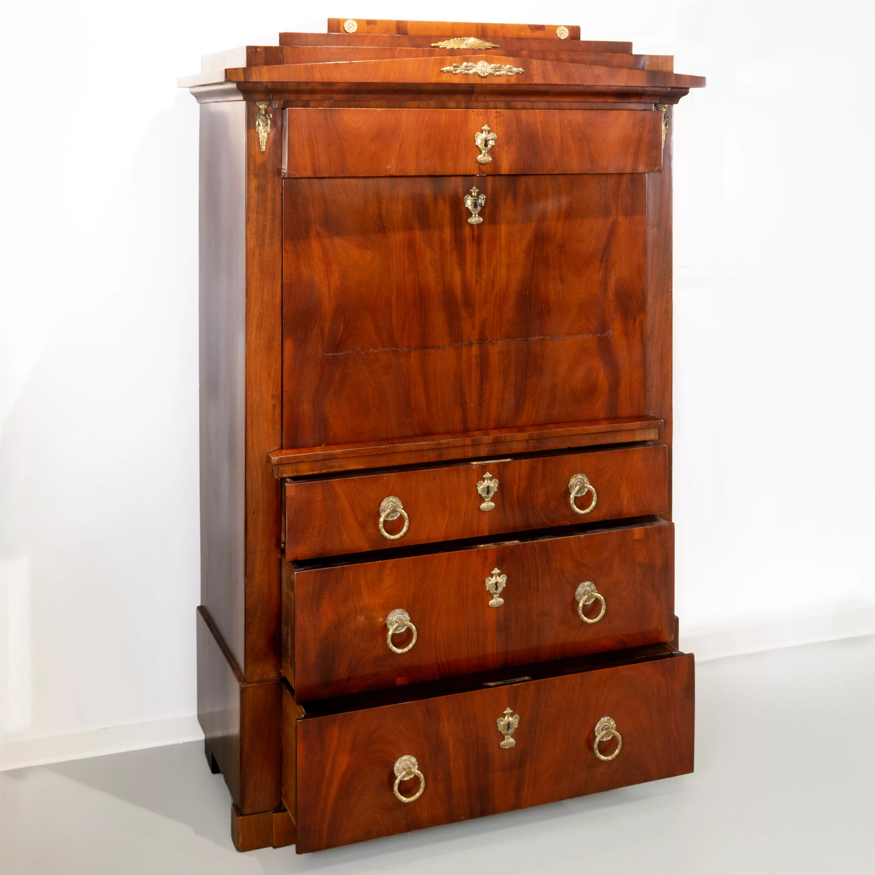 Probably Germany, c. 1810 - 1830, mahogany veneered on oak, partially precious or burl wood veneer, straight body with three drawers at the bottom, the writing surface above, a further drawer above, stepped pediment, fire-gilt fittings, partly figurative and partly floral, behind the writing flap 8 small drawers and a door flanked by half columns, 160 x 105 x 51 cm, last restoration in 2009, the locks of the lower drawers renewed, 3 leg knobs replaced, minimal veneer damage in places, flap with restored shrinkage crack
