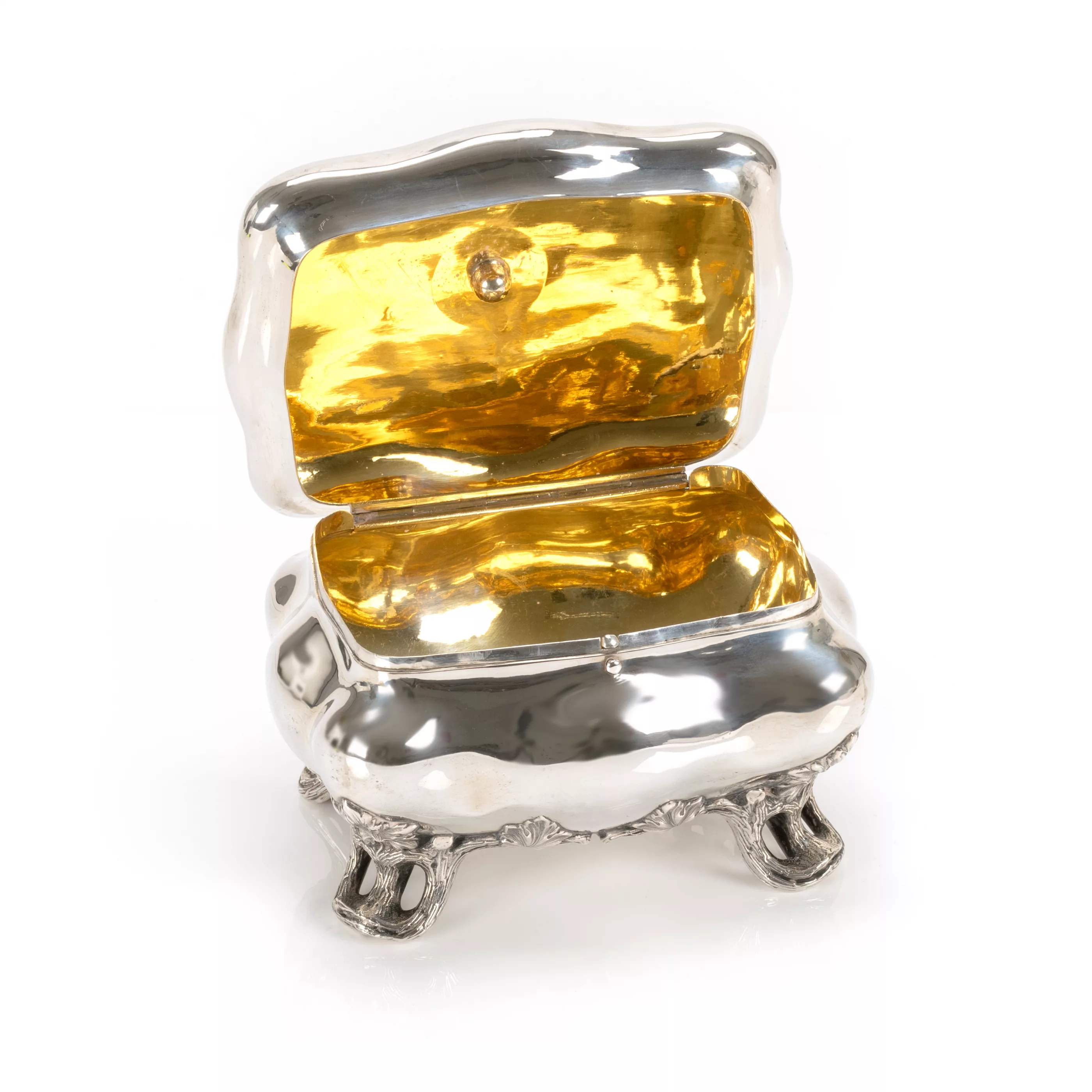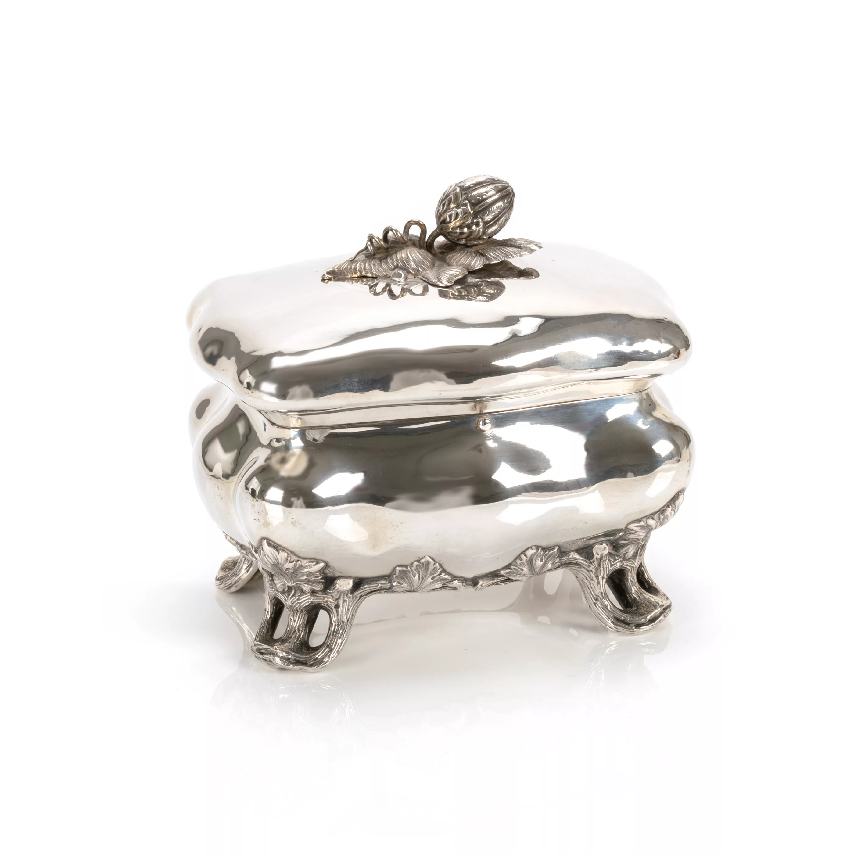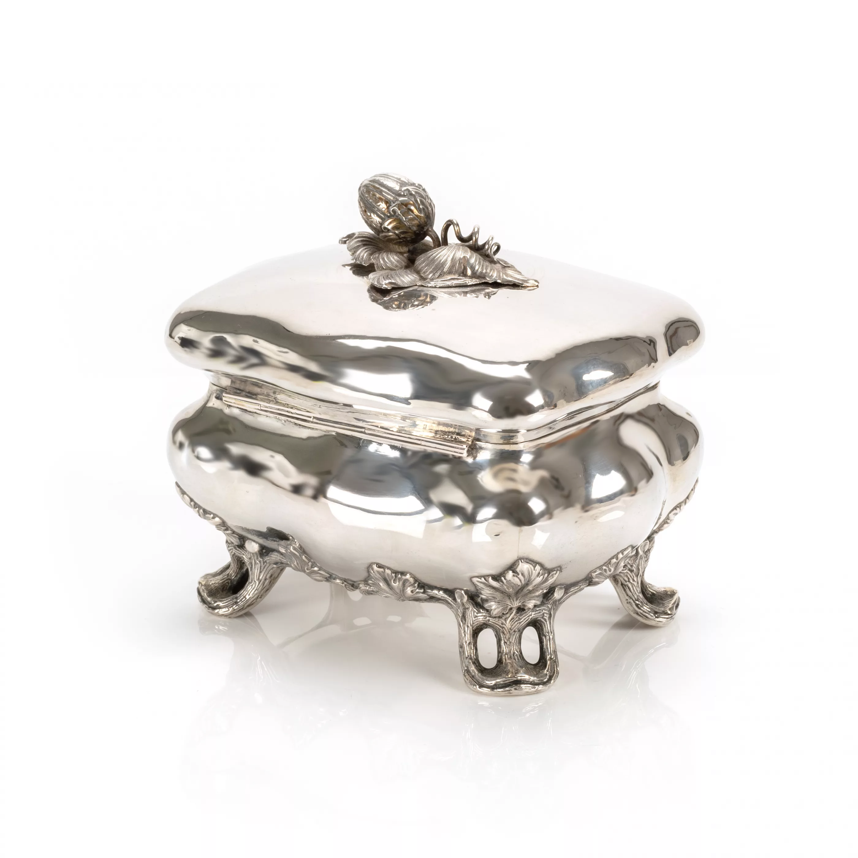 c. 1830, 13 lot silver, hallmarked, gilt interior, hallmark and unidentified hallmark, rectangular body with curved walls, on 4 branch-shaped feet with maple leaf decoration, push lock, domed lid with strawberry finial, height 13.2 cm, width 13 cm, weight approx. 267 g