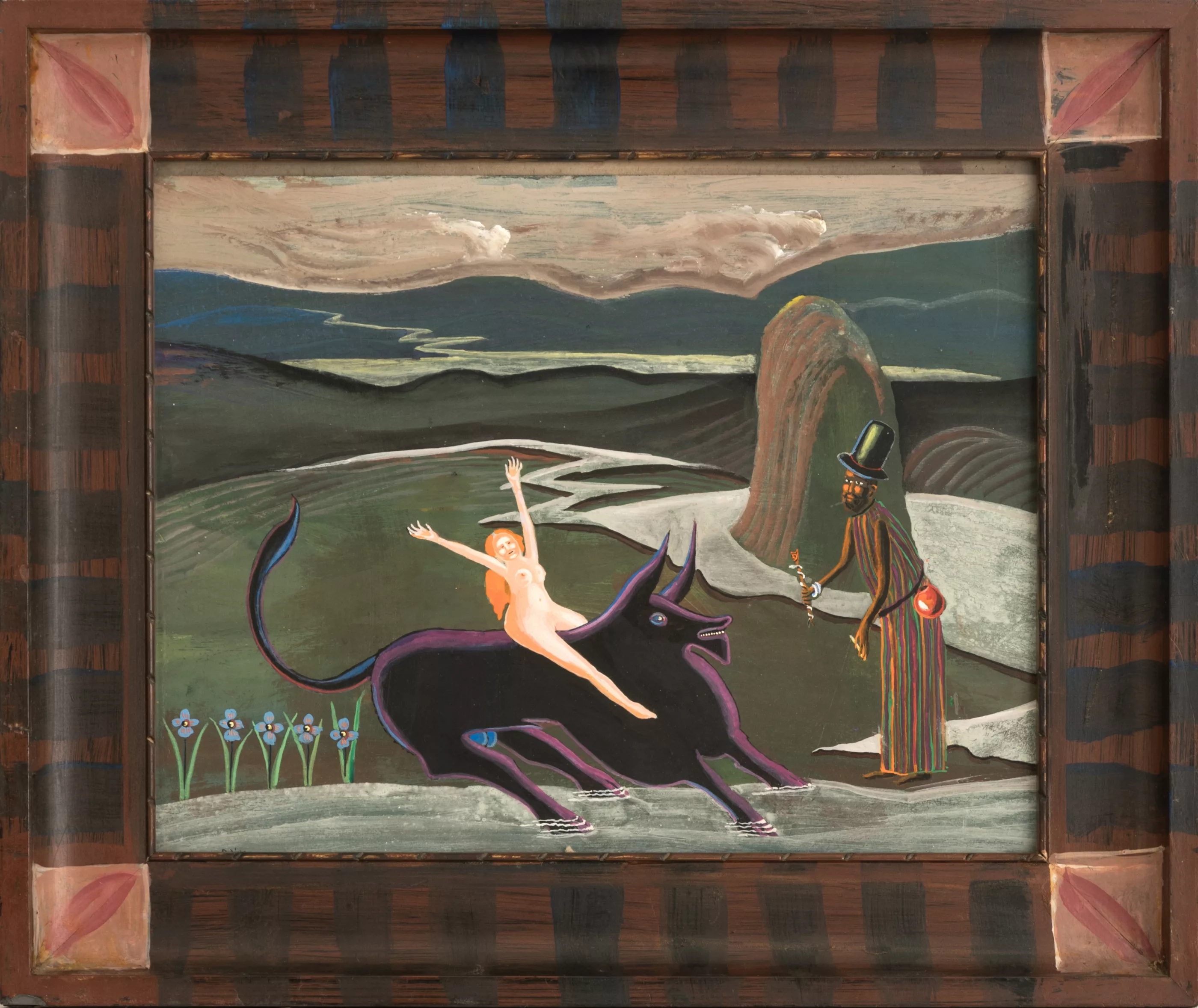 Magician stops Zeus with Europa, gouache on light cardboard, 25 cm x 32 cm inside frame dimensions, signed, dated 80, inscribed R. Bitta, mounted