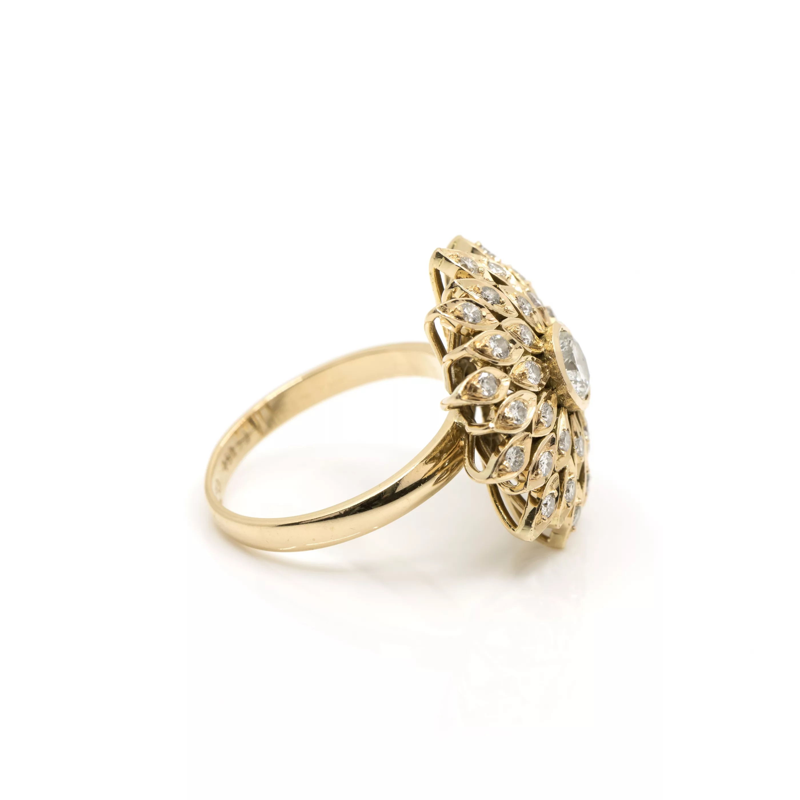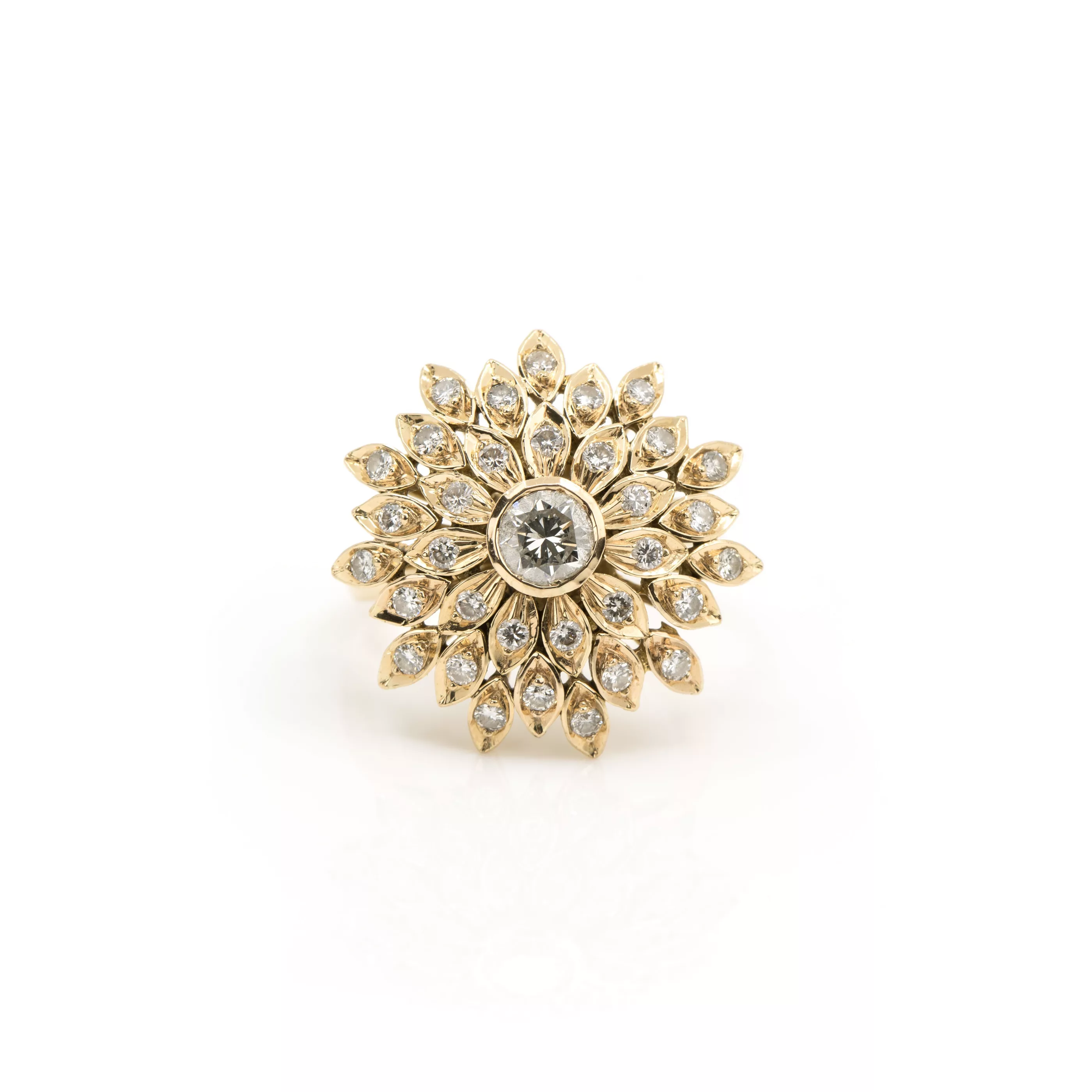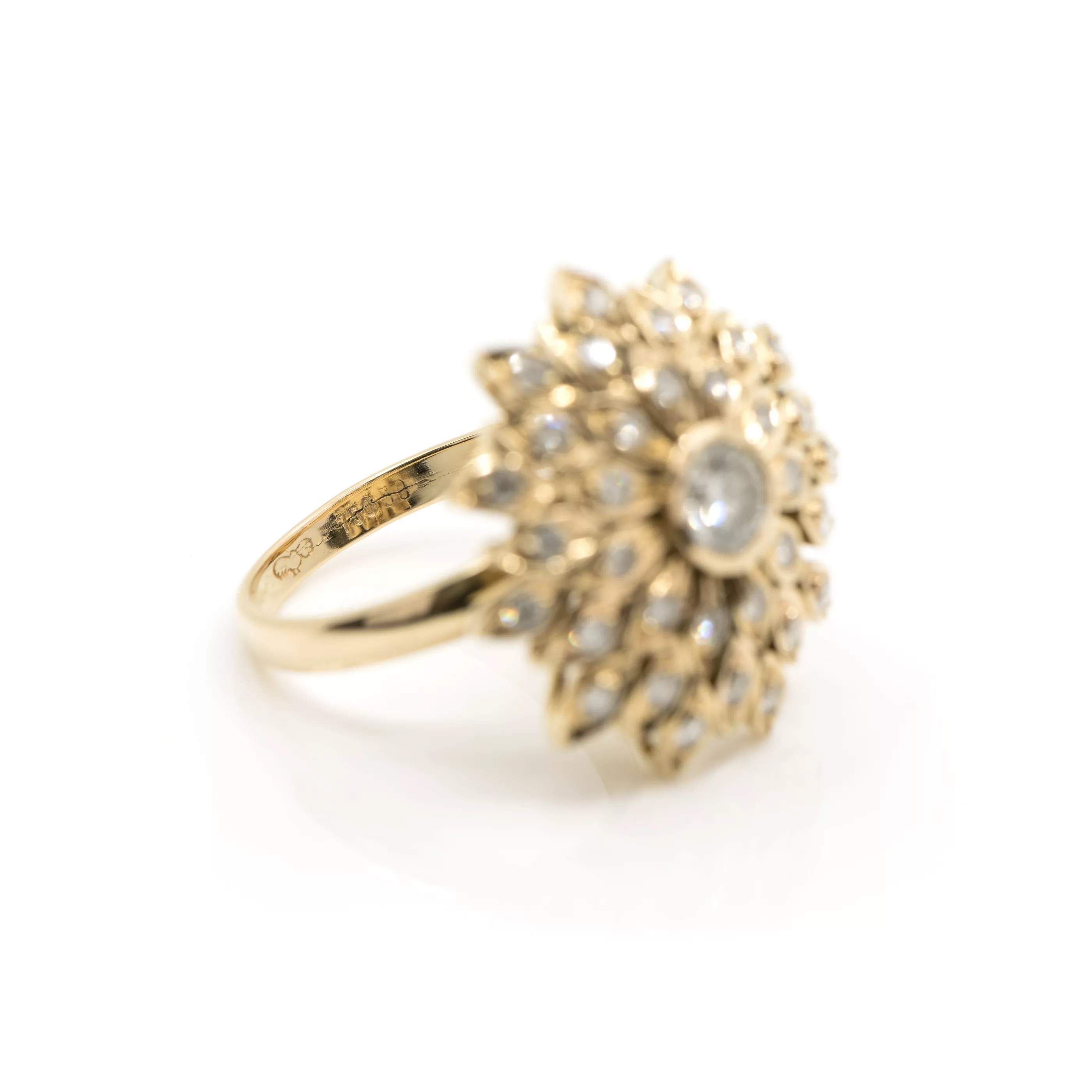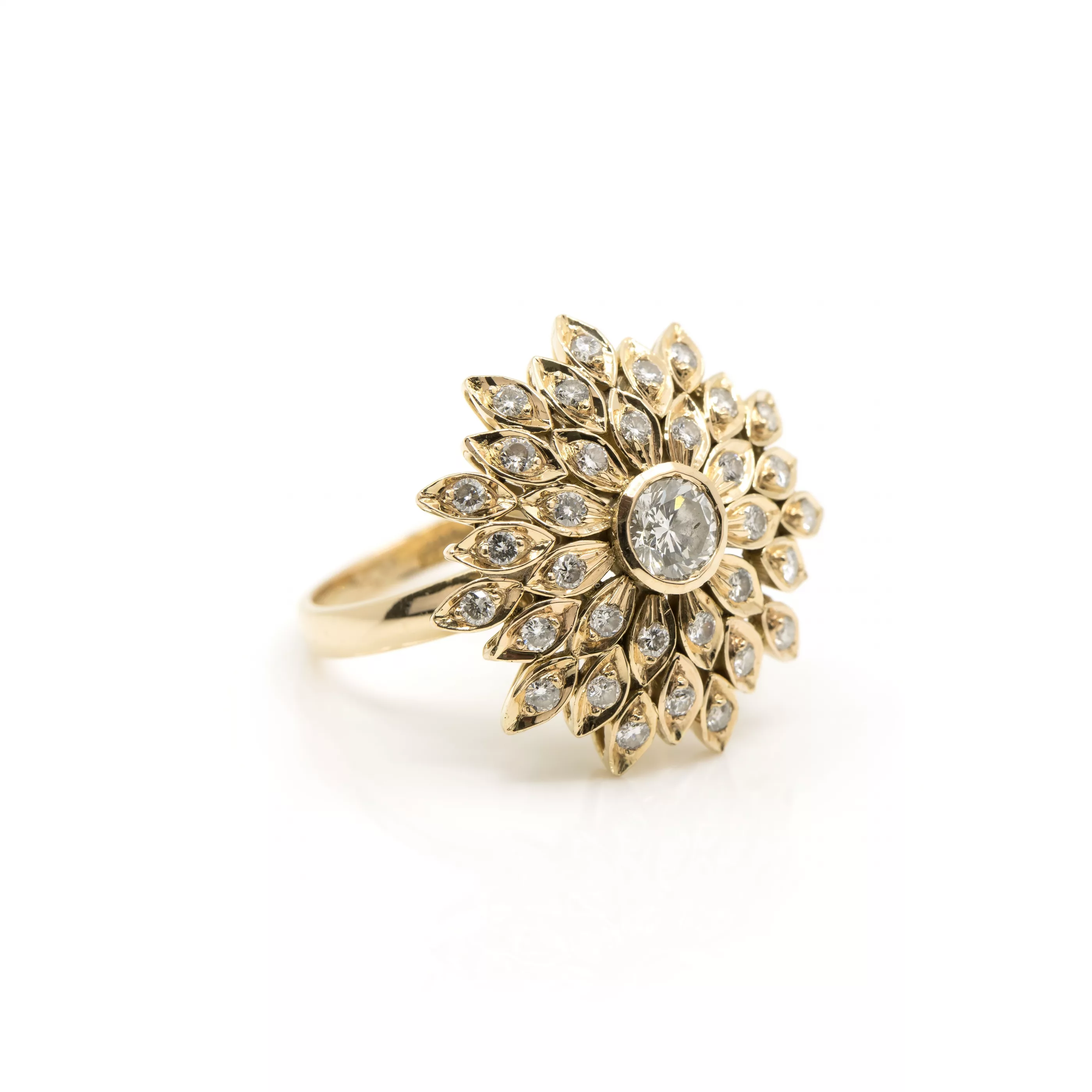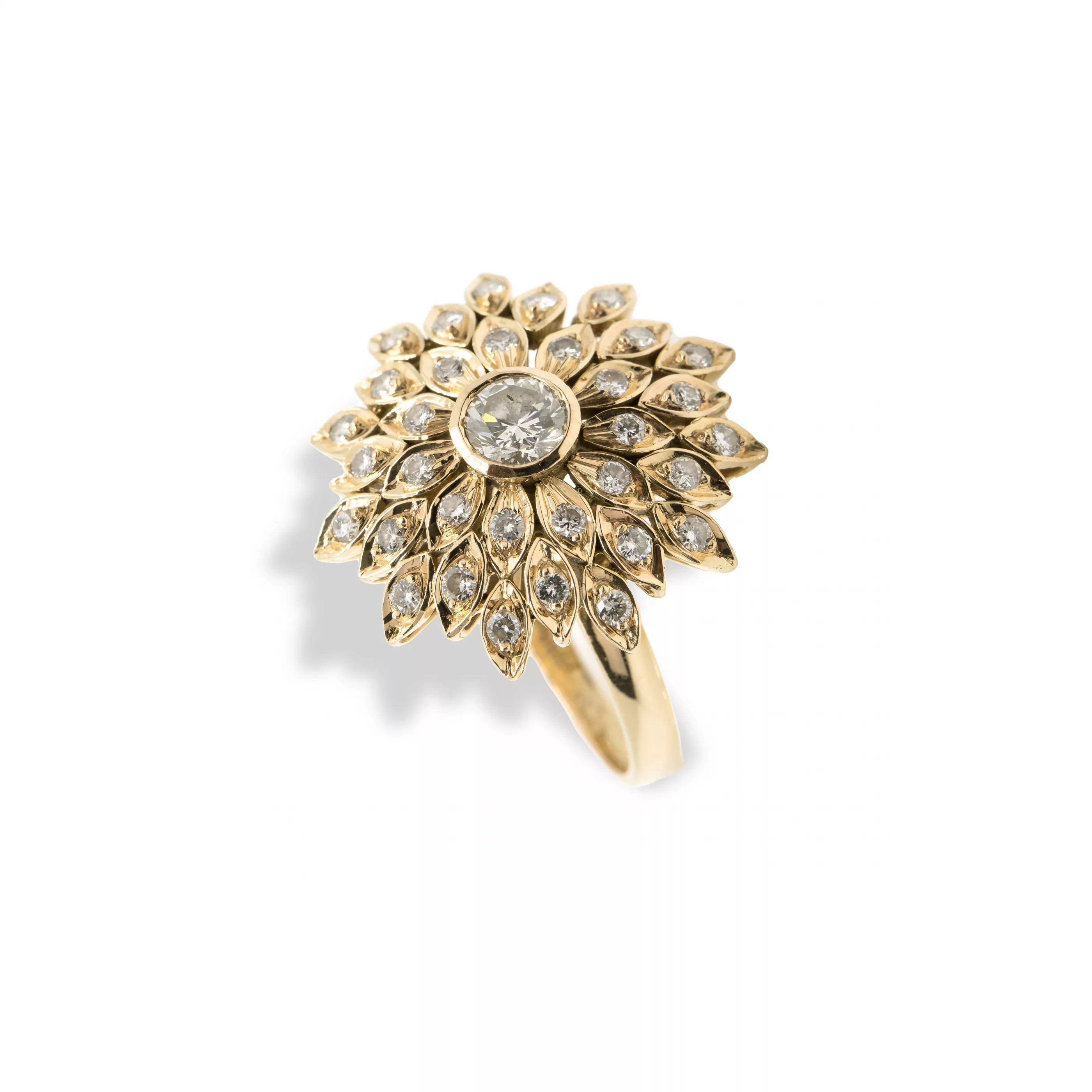 Blütenring mit Brillantbesatz750 Gelbgold, punziert, 36 Diamanten im Brillantbesatz, gesamt ca. 0,75 ct, H, si-pi, Ringdurchmesser 18 mm,...