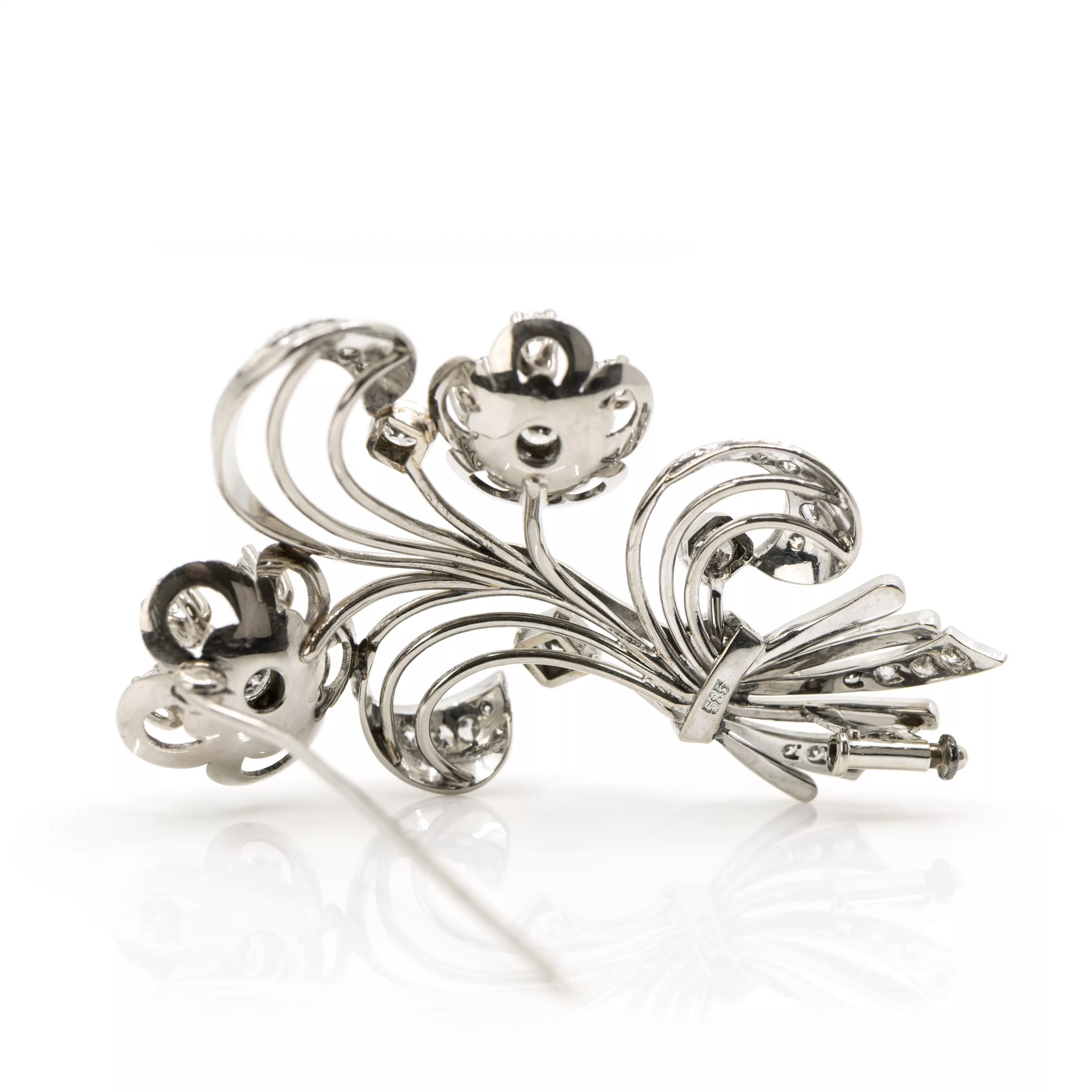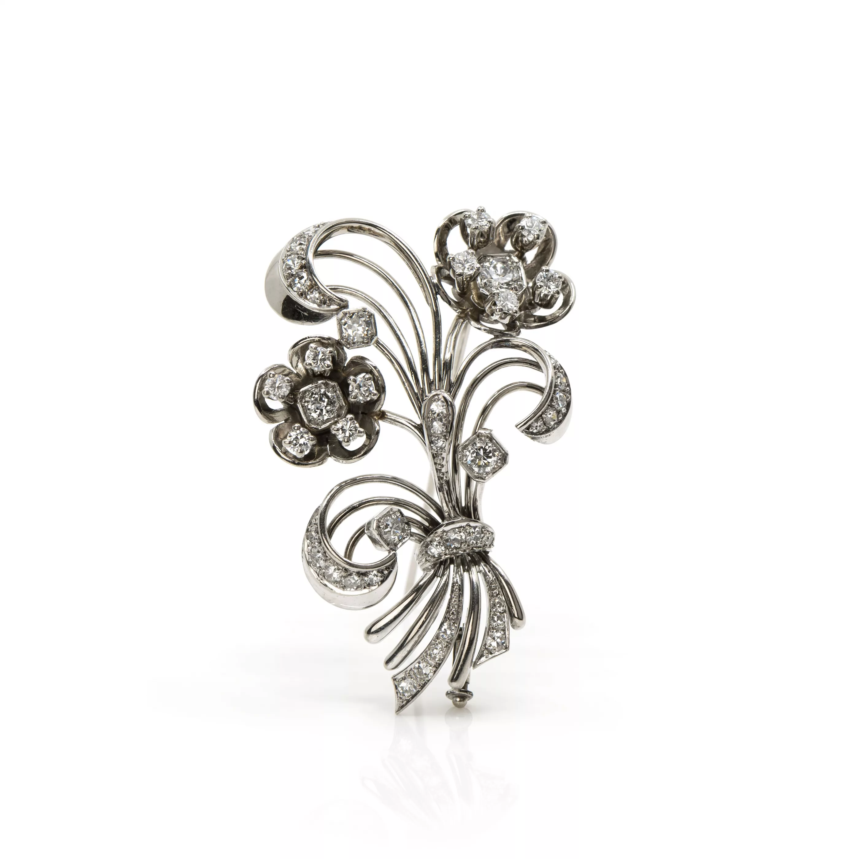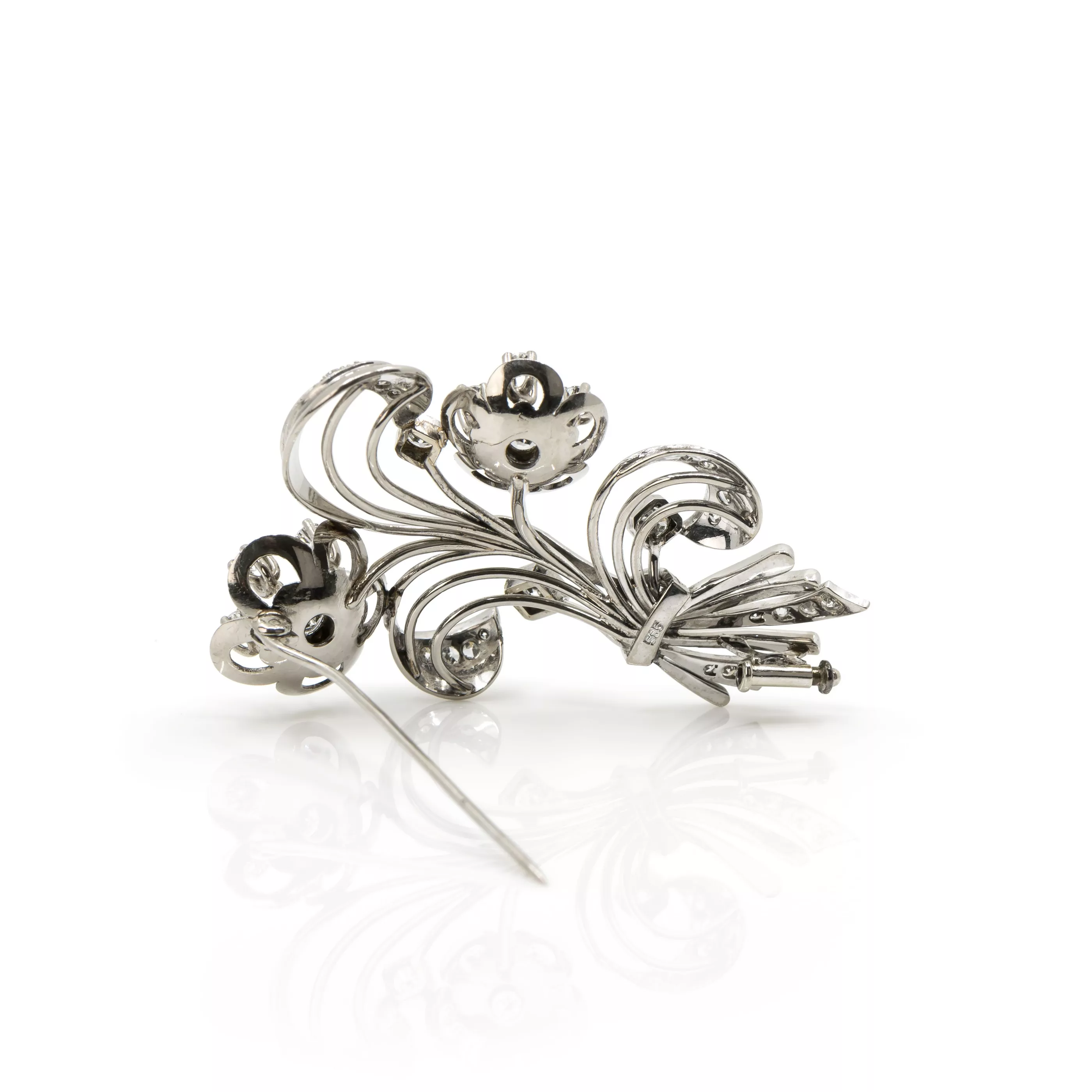 Blumenbouquet-Brosche585 Weißgold, punziert, 45 Diamanten im Brillant- und Achtkantschliff, gesamt ca. 1,50 ct, H, vs-pi, Länge 4,5 cm,...
