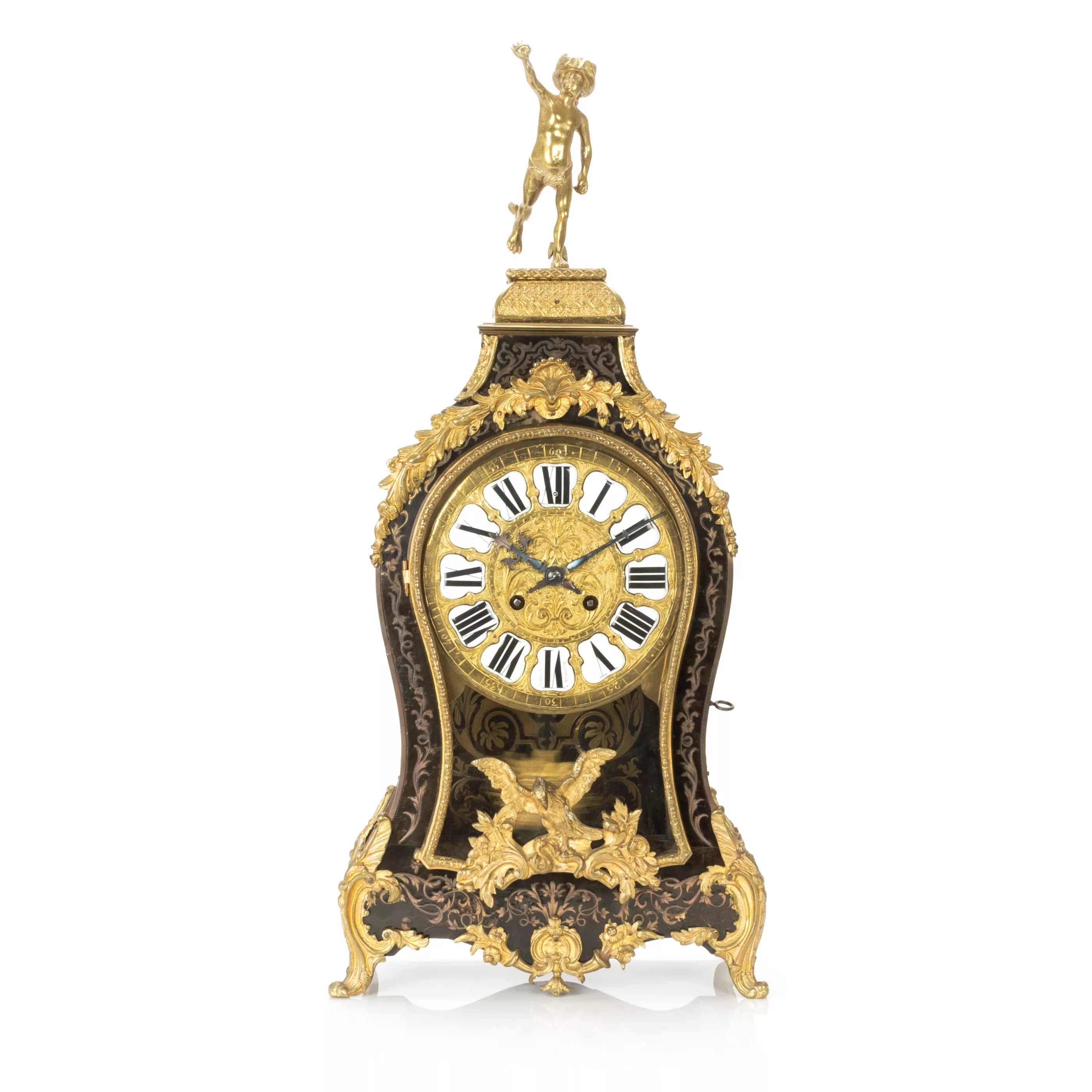 Dessaint Plet Bruxelles, Frankreich/Belgien, Mitte/Ende 19. Jh., allseitig geschweiftes Boulle-Intarsien-Gehäuse bekrönt mit Hermesfigur, verglaste Seiten und Tür, vorne mit Dekoration in Form eines Adlers, Ormolu-Reliefzifferblatt mit Emailkartuschen mit römischen Ziffern, signiert 'Dessaint Plet Bruxelles' für den Verkäufer, Stahlzeiger, Uhrwerk mit Brocot-Hemmung gestempelt 'Parret A Paris', Halbstundenschlag auf Tonfeder-Sonnenpendel an Federaufhängung, Höhe 62 cm, Pendel und Schlüssel vorhanden Funktion geprüft, gangbar, Alters- und Gebrauchsspuren, Werk überholungsbedürftig