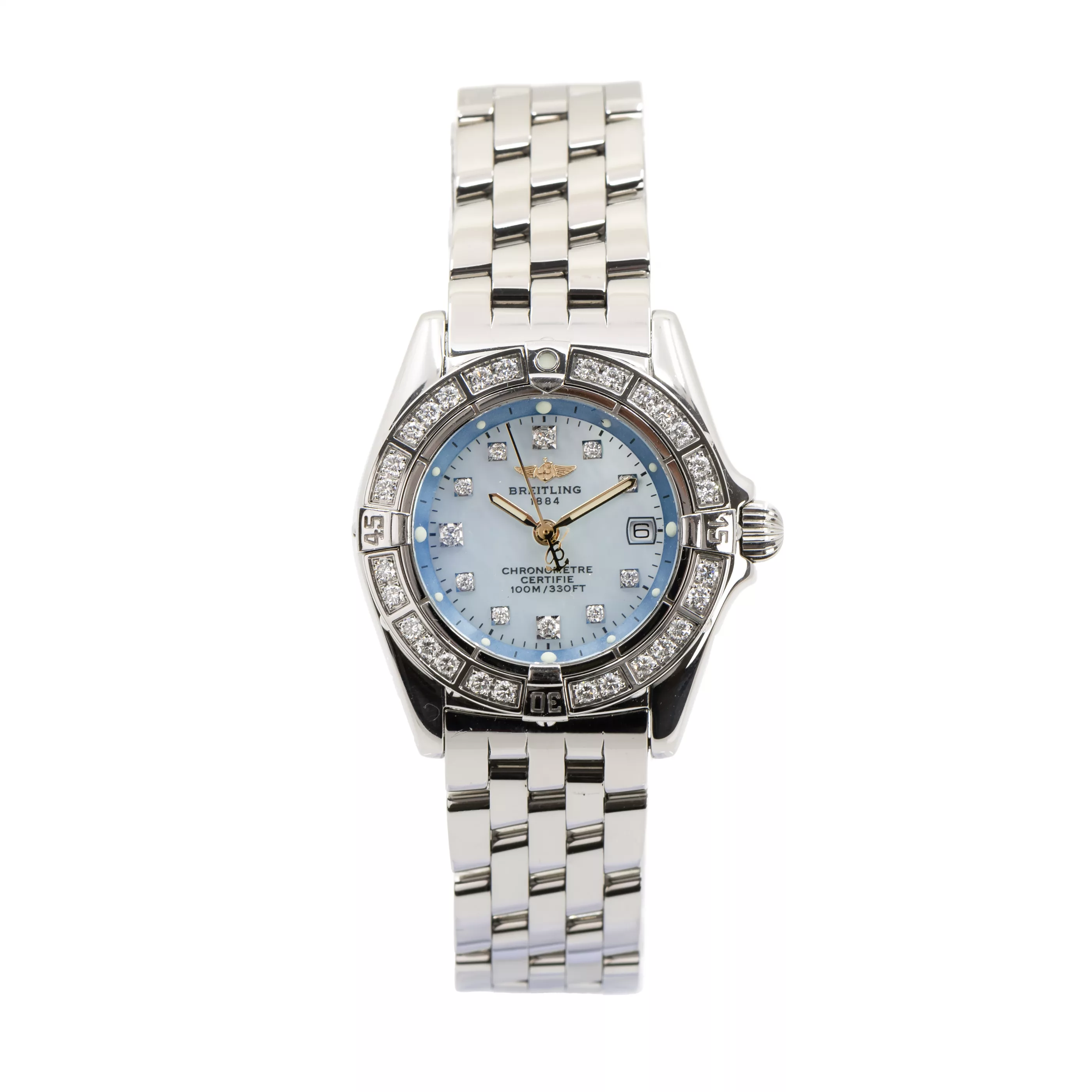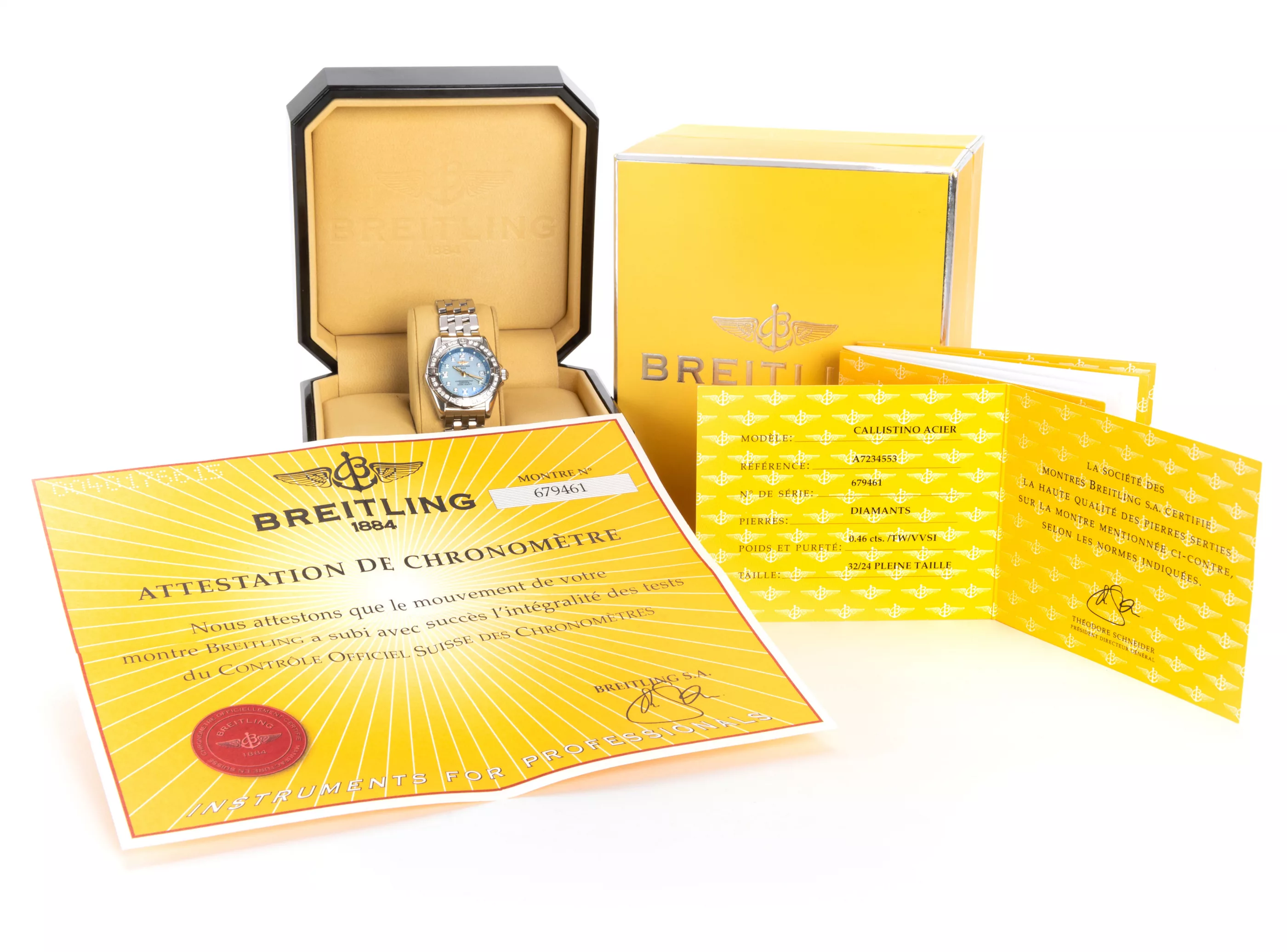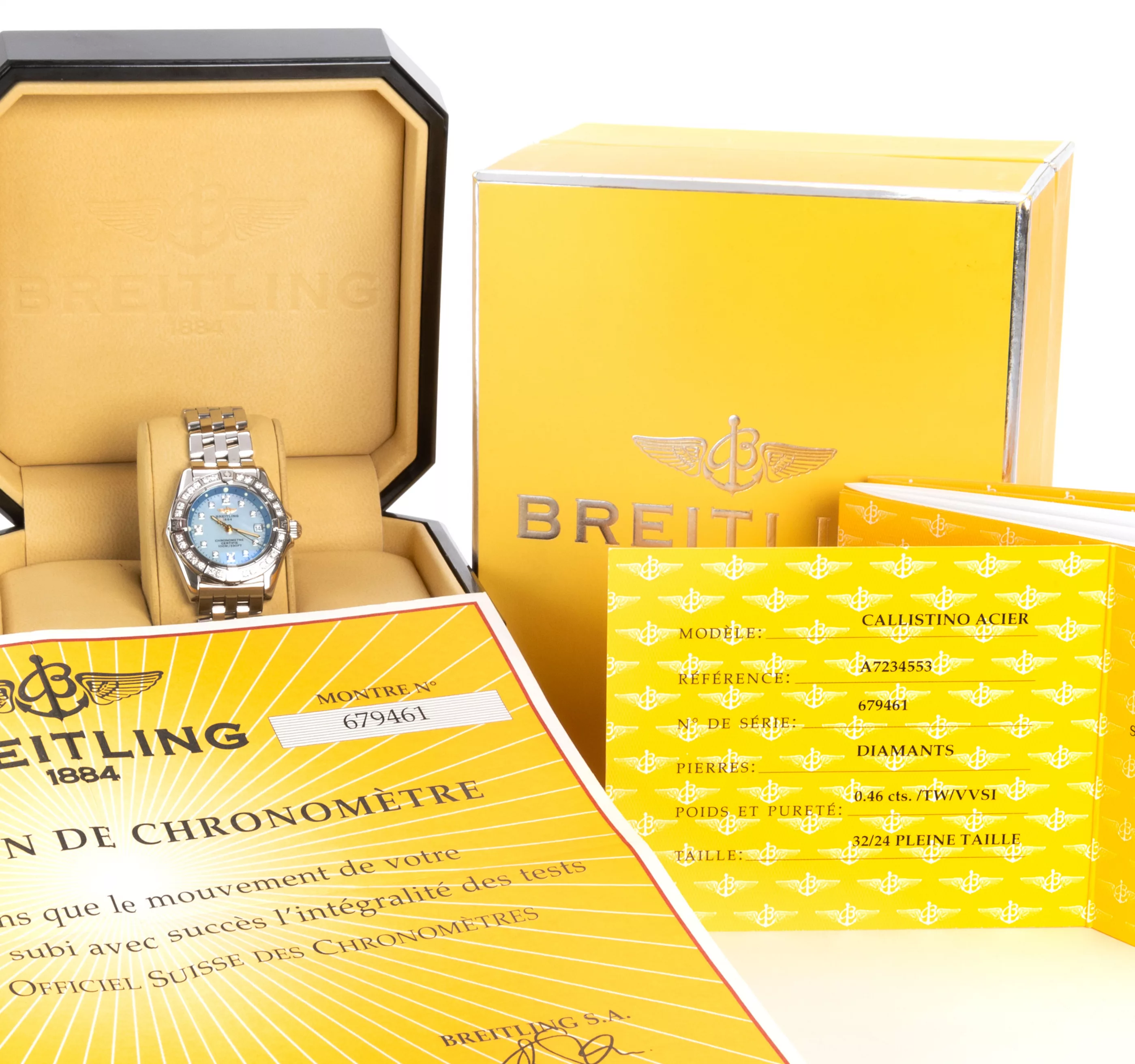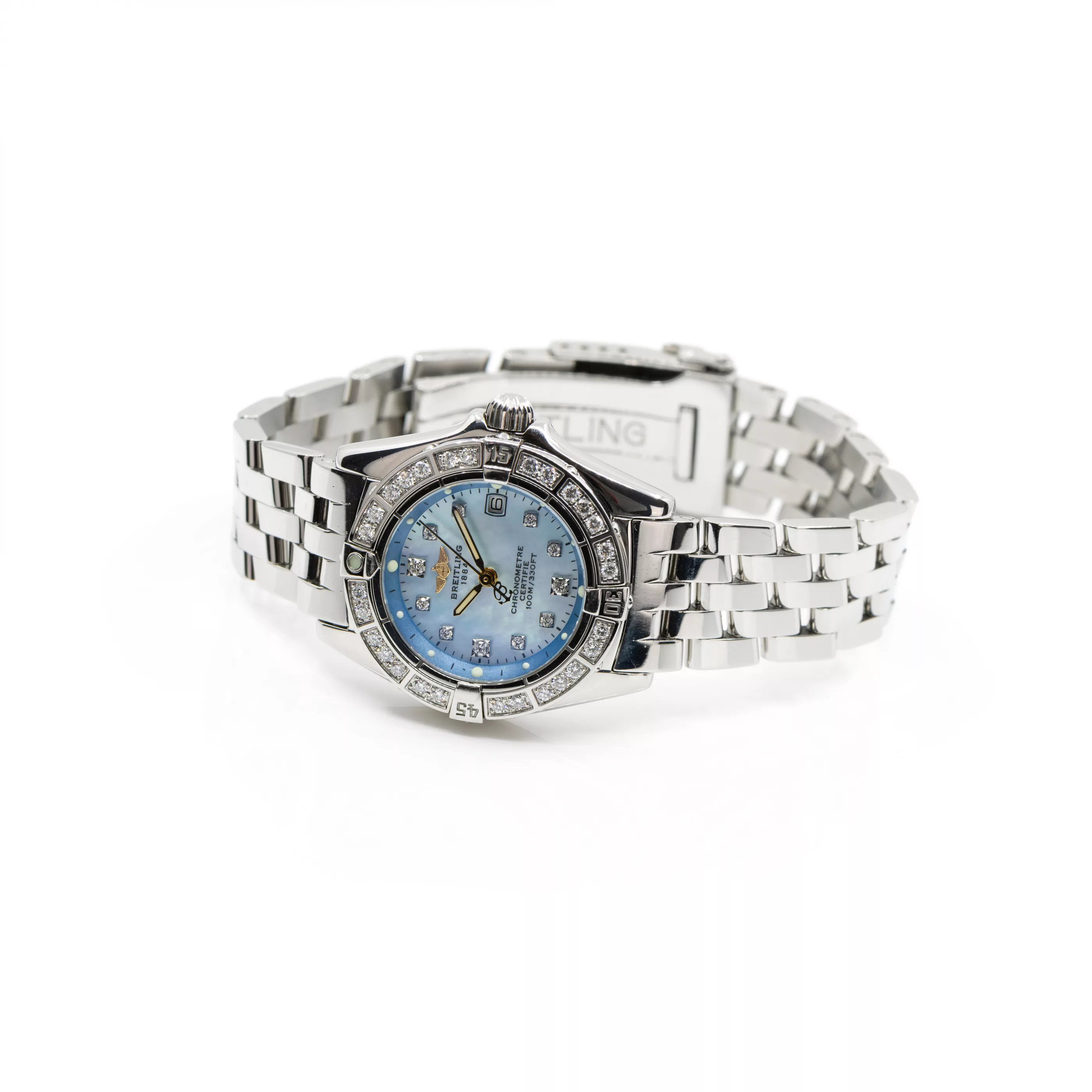 year 2005, quartz movement, date display, bezel set with 28 diamonds, total approx. 0.56 ct, mother-of-pearl dial, applied hour indices made of diamonds, total approx. 0.14 ct, serial no. 679461 | ref. no. A72345-605 D, case steel, diameter 29 mm, original strap, steel, original folding clasp, steel, length 16,5 cm, total weight approx. 75,4 g, functional, tested, condition good, condition and functionality checked by our master watchmaker, with original box, outer packaging and papers, outer packaging good, box good, certificate of authenticity, warranty booklet, instruction manual, note: The buyer's premium is 14,28% incl. VAT. For the use of the online bidding consoles there is an additional fee of 3% plus VAT (3.57%).