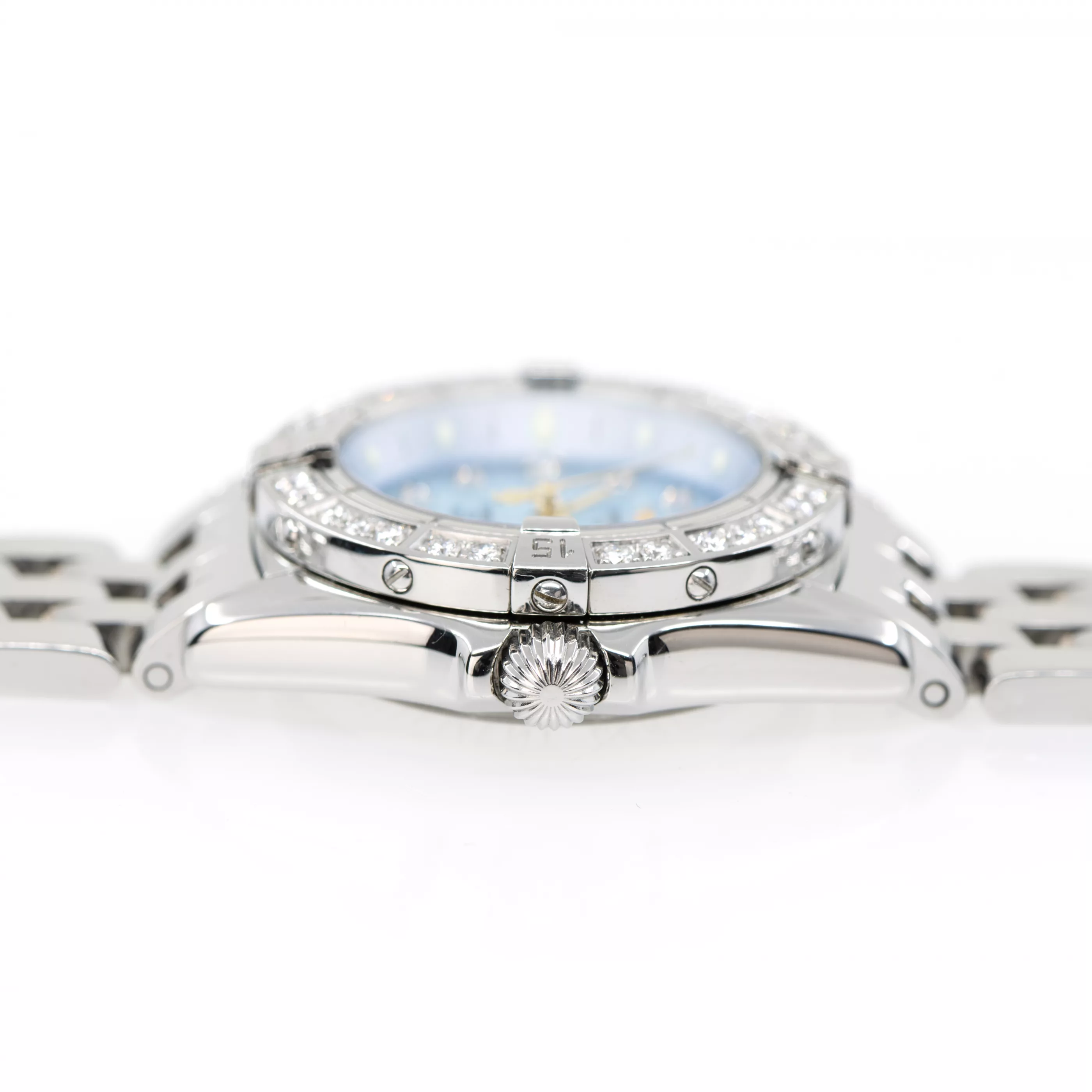 Jahr 2005, Quarzwerk, Datumsanzeige, Lünette besetzt mit 28 Diamanten, gesamt ca. 0,56 ct, Perlmutt Zifferblatt, aufgesetzte Stundenindizes aus Diamanten, gesamt ca. 0,14 ct, Serien-Nr. 679461 | Ref.-Nr. A72345-605 D, Gehäuse Stahl, Durchmesser 29 mm, Original-Armband, Stahl, Original-Faltschließe, Stahl, Länge 16,5 cm, Gesamtgewicht ca. 75,4 g, Funktion gangbar, geprüft, Zustand gut, Zustand und Funktionalität durch unseren Uhrmachermeister geprüft, mit Original-Box, -Umverpackung und -Papieren, Umverpackung gut, Box gut, Echtheitszertifikat, Garantieheft, Bedienungsanleitung, Anmerkung: Das Aufgeld beträgt 14,28% inkl. MwSt. Für die Nutzung der Online-Bietkonsolen fällt eine zusätzliche Gebühr in Höhe von 3% zzgl. MwSt. (3,57%) an.
