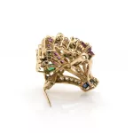 750 Gelbgold, punziert, 30 Diamanten im Brillantschliff, gesamt ca. 0,30 ct, 34 facettierte Rubine, Saphire und Smaragde und 1 Opalcabochon, gesamt ca. 1,00 ct, 2,5 cm x 2,7 cm, Gewicht ca. 7,6 g