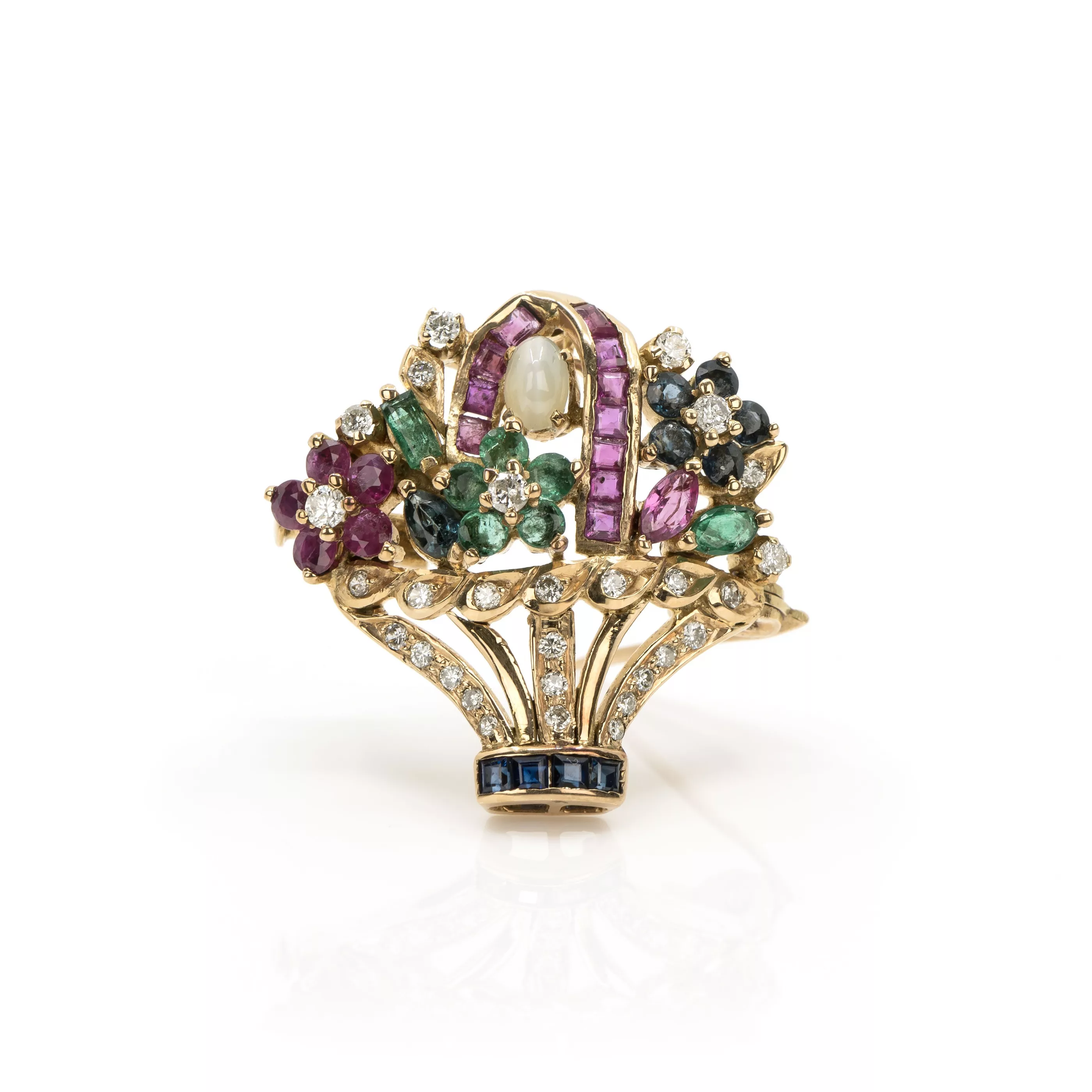 750 Gelbgold, punziert, 30 Diamanten im Brillantschliff, gesamt ca. 0,30 ct, 34 facettierte Rubine, Saphire und Smaragde und 1 Opalcabochon, gesamt ca. 1,00 ct, 2,5 cm x 2,7 cm, Gewicht ca. 7,6 g