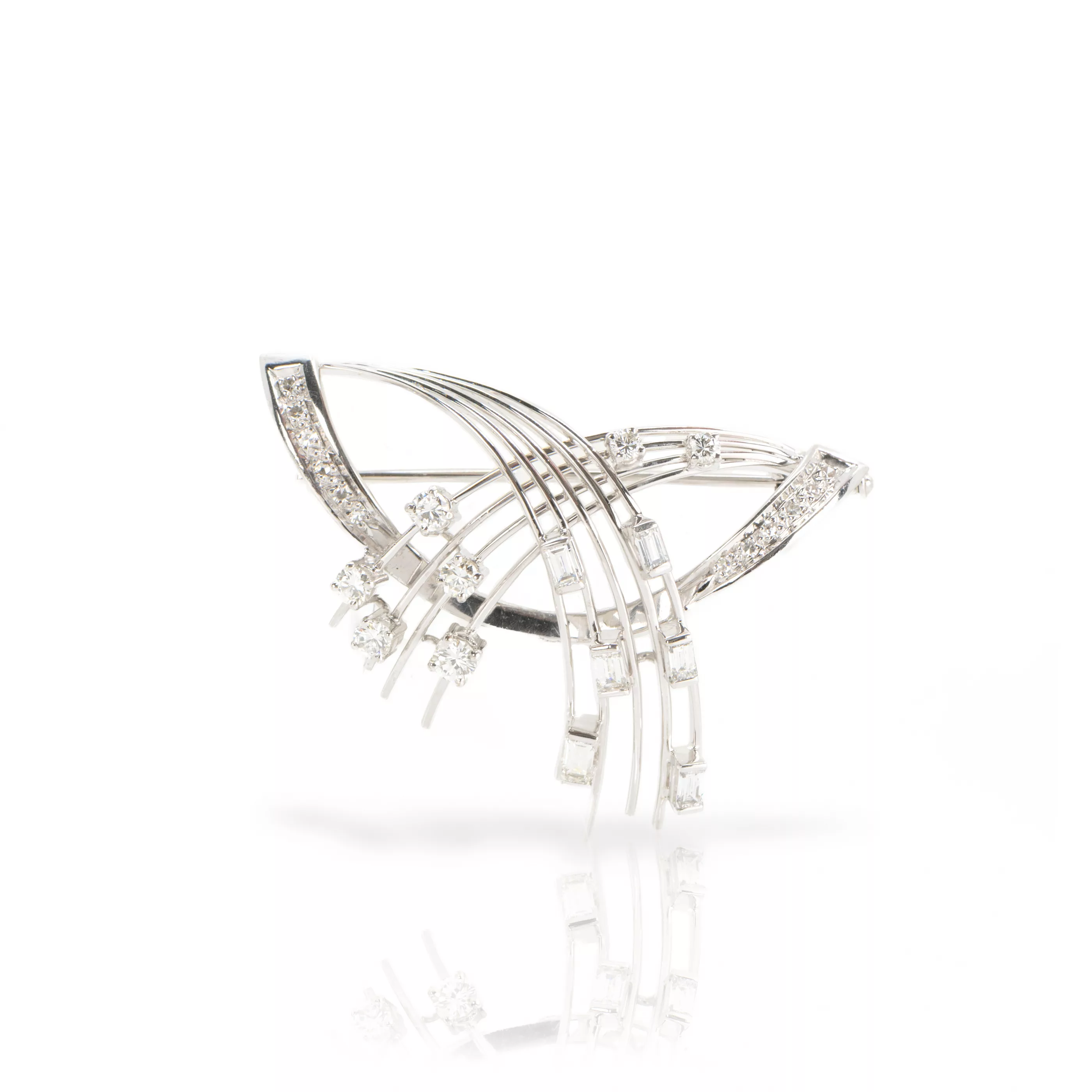 750 Weißgold, punziert, 19 Diamanten im Brillantschliff und 6 Diamaten im Baguetteschliff, gesamt ca. 0,77 ct, G, vvs, Länge 4,6 cm,...