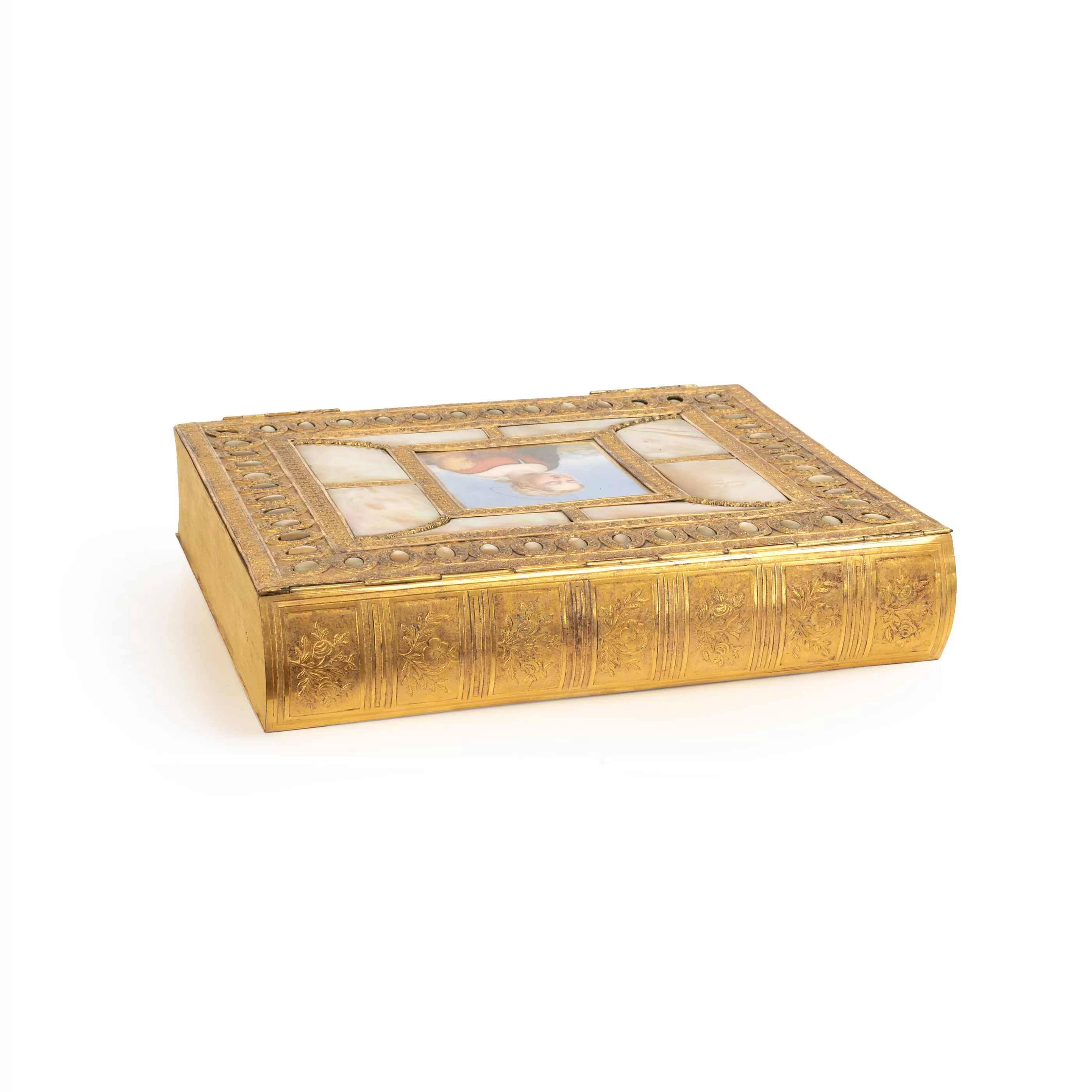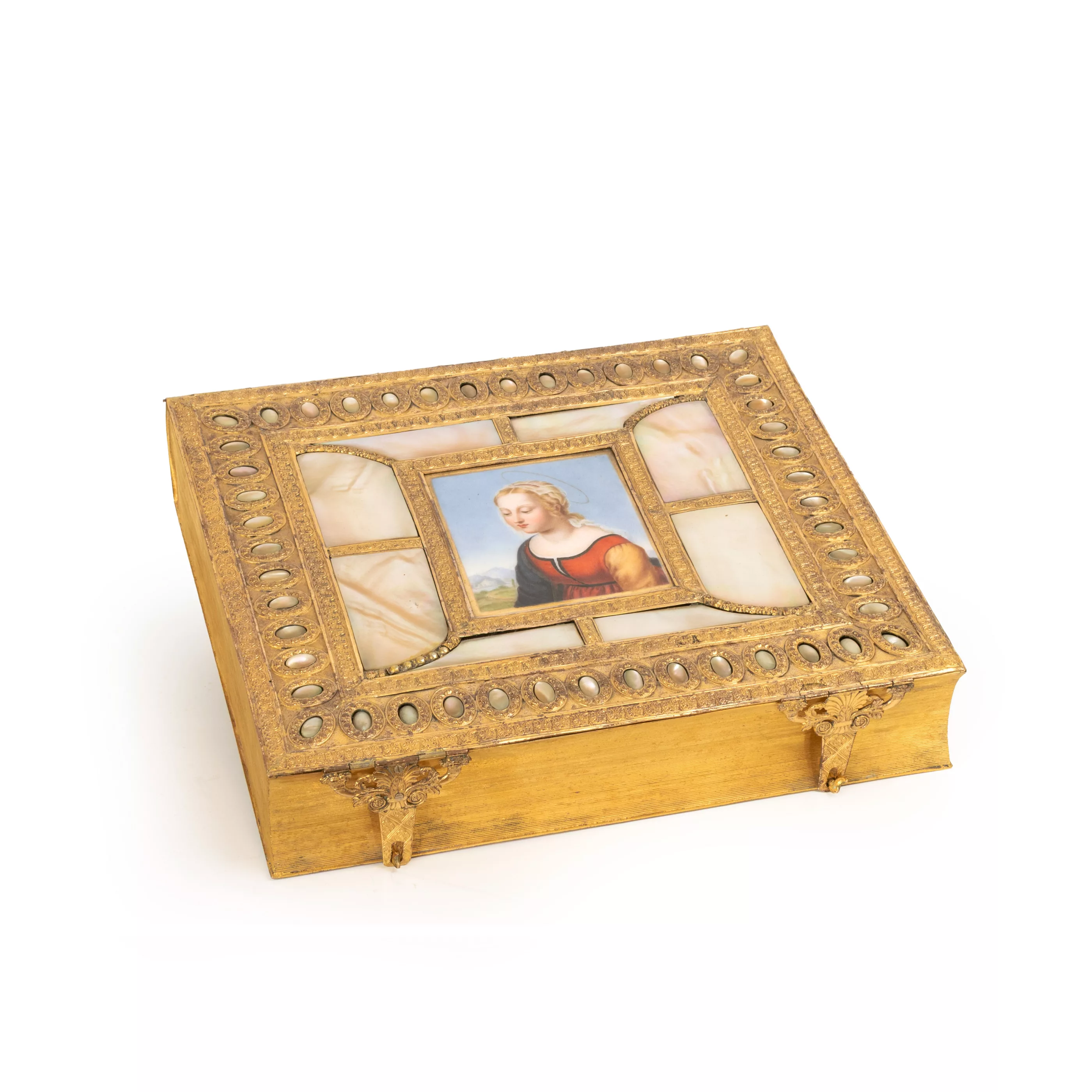 circa 1830, brass, gilt, porcelain, mother-of-pearl, leather and velvet, 23 x 25.5 x 6 cm, fine porcelain painting after a model by Raffaello Santi, surrounding palmettes and rose scrolls, the book clasp is crowned by cornucopias on the hinge, rubbed in places, some of the permuté cabochons have sunk in their setting, the light blue velvet inside is heavily faded, stained, traces of modern glue on the edges of the binding
