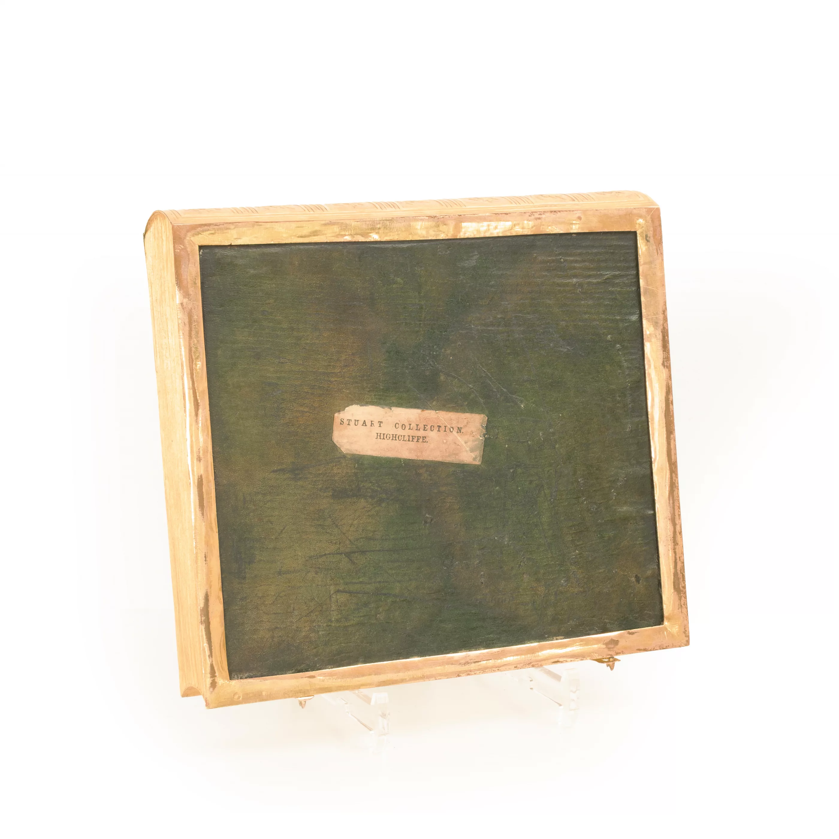 um 1830, 23 x 25,5 x 6 cm, feine Porzellanmalerei nach einem Vorbild von Raffaello Santi, umlaufende Palmetten und Rosenranken, die Buchschließe wird am Scharnier durch Füllhörner bekrönt, partiell berieben, einige Permluttcabochons haben sich in ihrer Fassung abgesenkt, hellblauer Samt im Inneren stark ausgeblichen, fleckig, neuzeitliche Klebespuren an den Rändern der Einfassung Messing, vergoldet, Porzellan, Perlmutt, Leder und Samt
