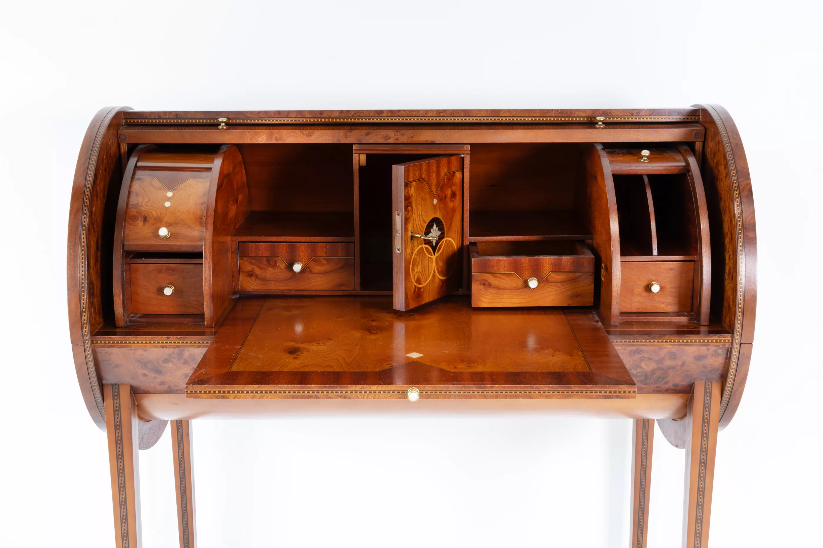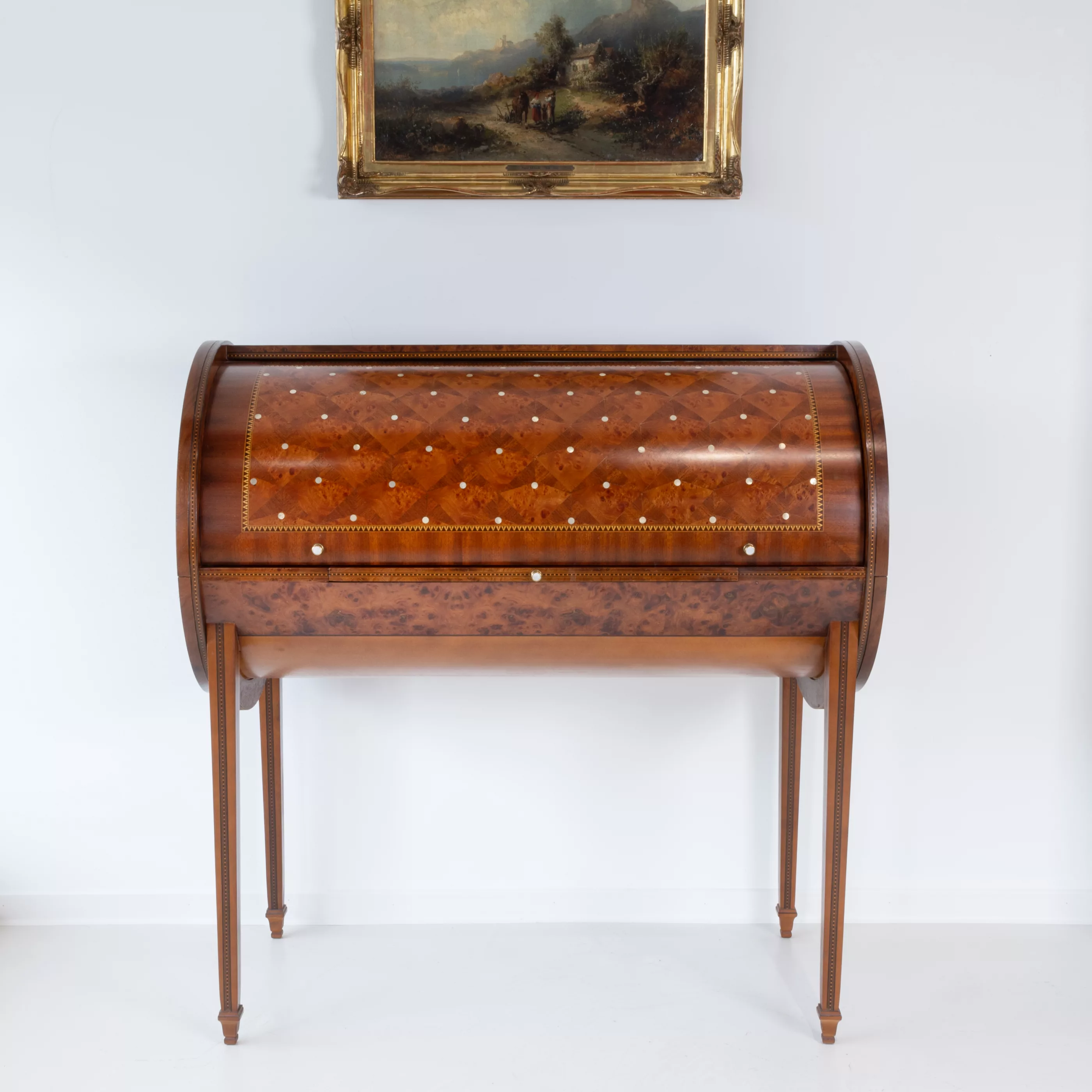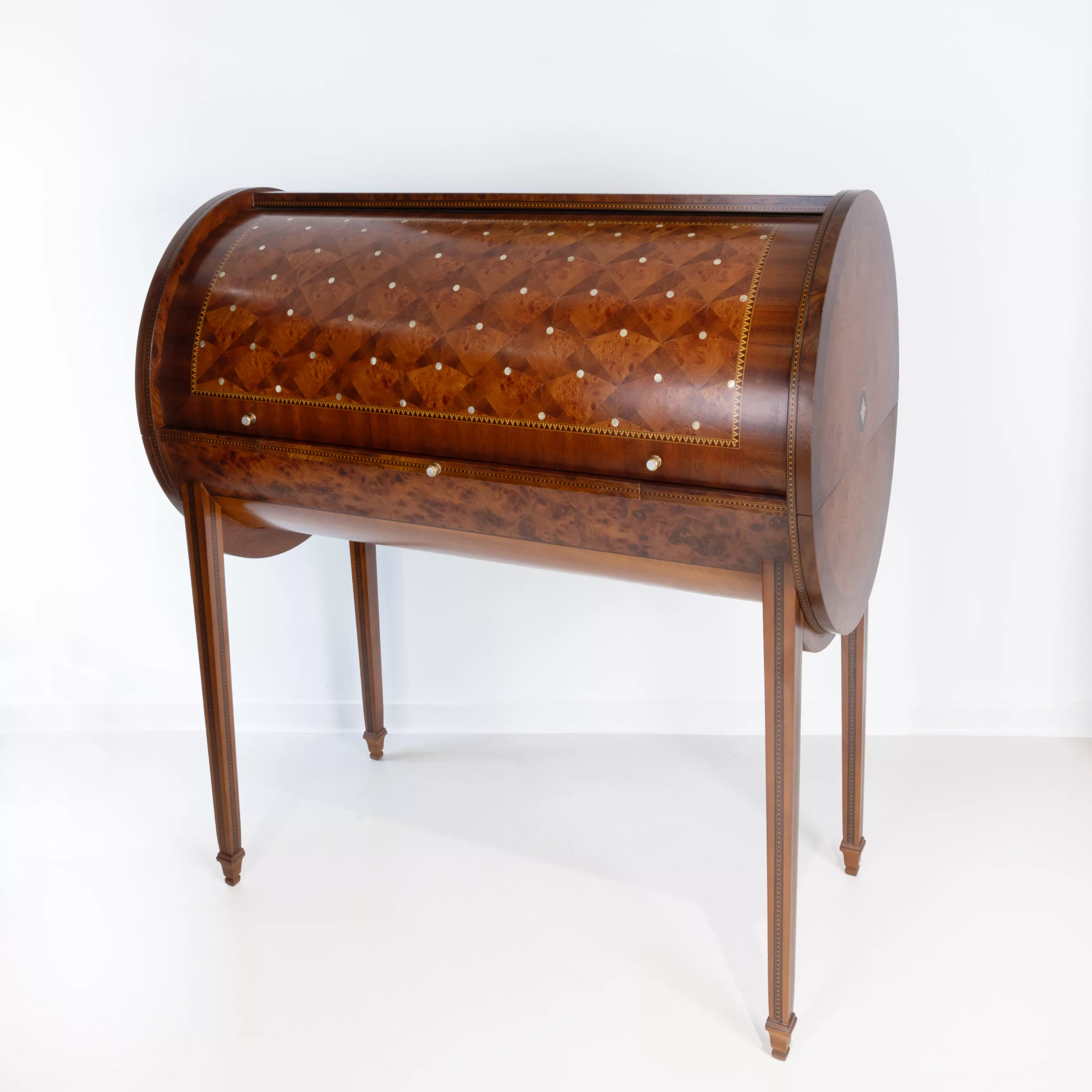 Italy, early 21st century, elm wood with mother-of-pearl inlays, cylindrical secretary with convex sliding flap, interior with 4 small drawers and 6 small compartments, central lockable compartment, pull-out table top, one drawer to each side with central secret compartment, Carpanelli manufactory inlay, brass handles with mother-of-pearl inlays, key present, 107 x 104 x 57 cm, condition A/B, one veneer splinter, one small lacquer damage