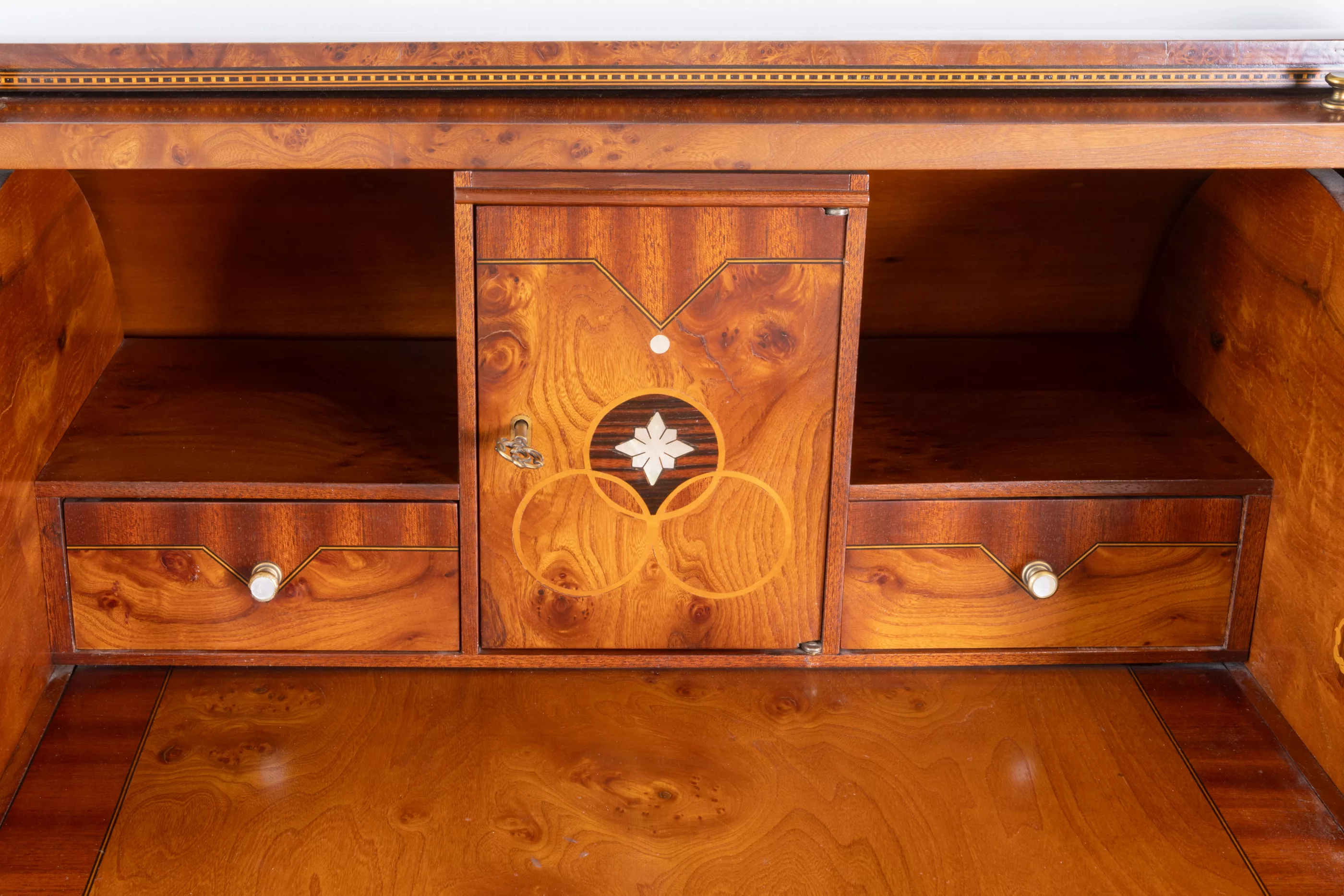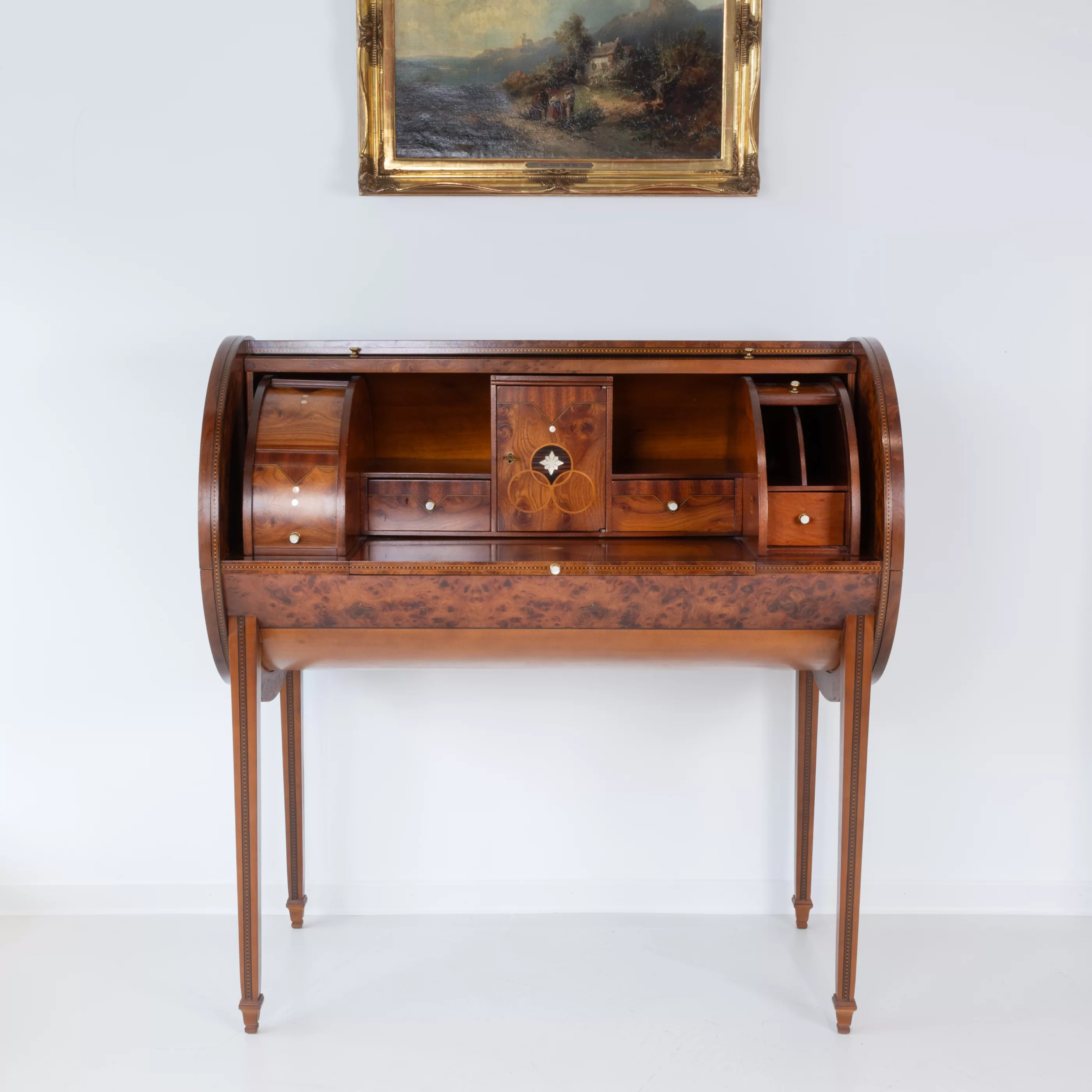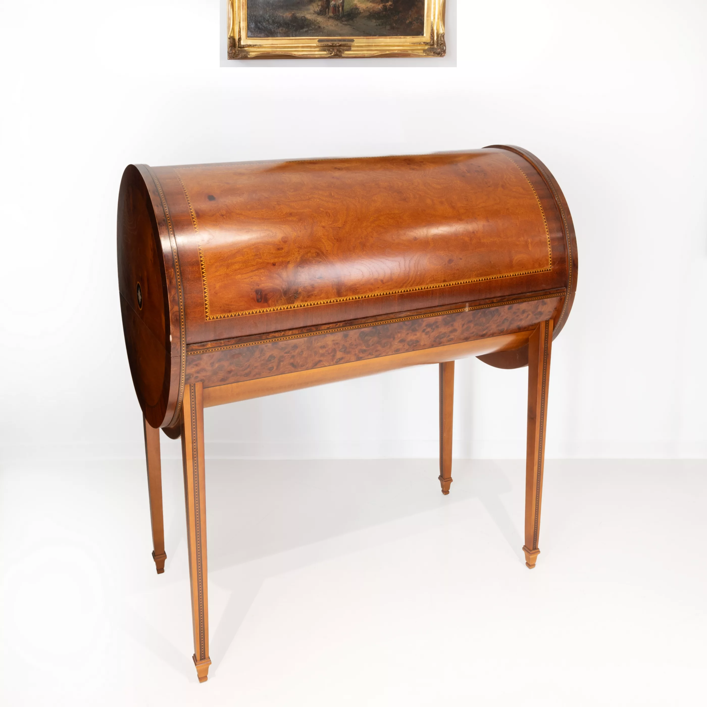 Italy, early 21st century, elm wood with mother-of-pearl inlays, cylindrical secretary with convex sliding flap, interior with 4 small drawers and 6 small compartments, central lockable compartment, pull-out table top, one drawer to each side with central secret compartment, Carpanelli manufactory inlay, brass handles with mother-of-pearl inlays, key present, 107 x 104 x 57 cm, condition A/B, one veneer splinter, one small lacquer damage
