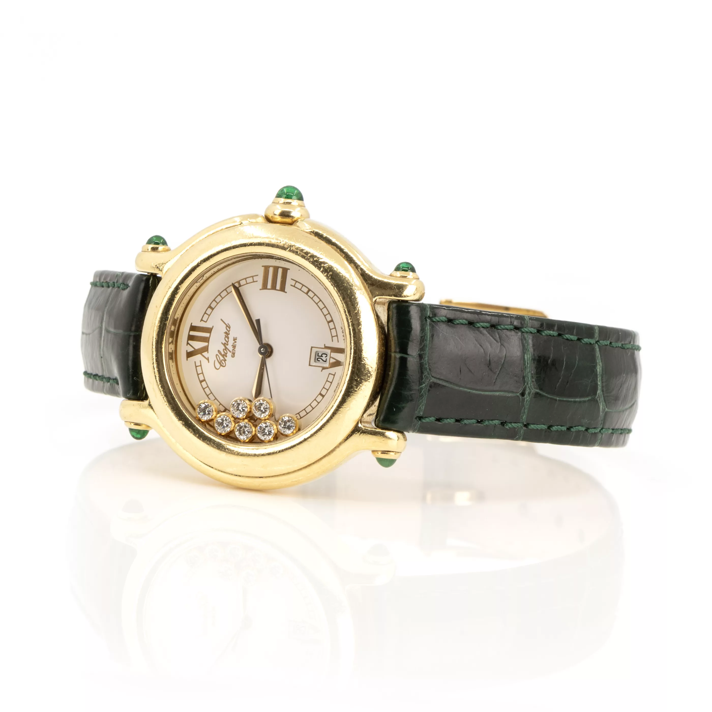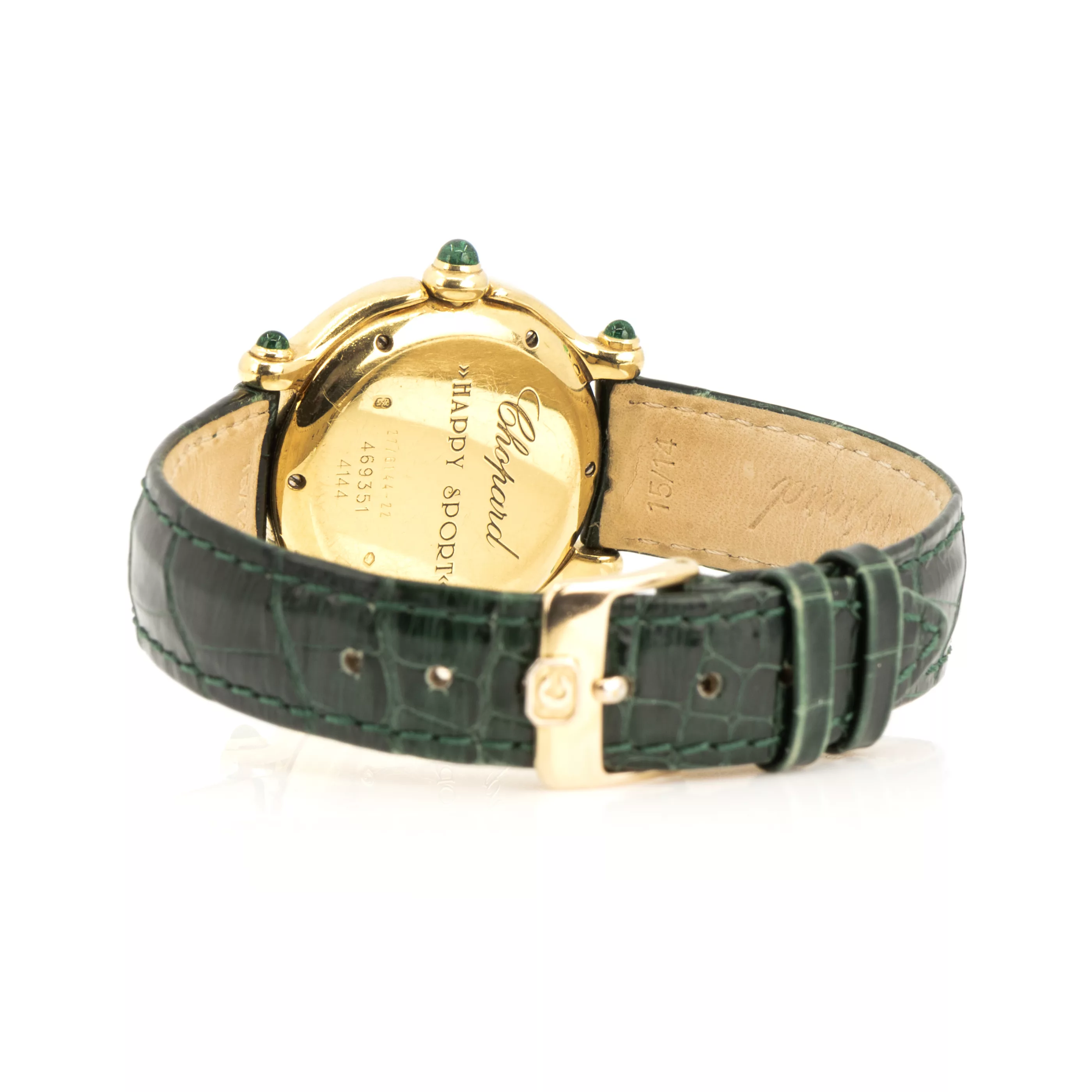 Quarzwerk, Referenz-Nr. 27/6144-0005 | Gehäuse-Nr. 469351 4144, Gehäuse 750 Gelbgold, punziert, Zifferblatt mit 7 losen Diamanten, gesamt ca. 0,21 ct, Datumsanzeige bei 6 Uhr, 5 Smaragdcabochons, Durchmesser 32 mm, Original-Armband, Leder, Original-Schließe, Stahl, vergoldet, Länge 23,5 cm, Gesamtgewicht ca. 57 g, Funktion nicht gegeben, geprüft, Batteriewechsel erforderlich, Zustand gut, mit leichten Tragespuren, ohne Original-Box oder -Papiere, aber Garantiekarte und Revisionsbeleg von 2008 anbei,