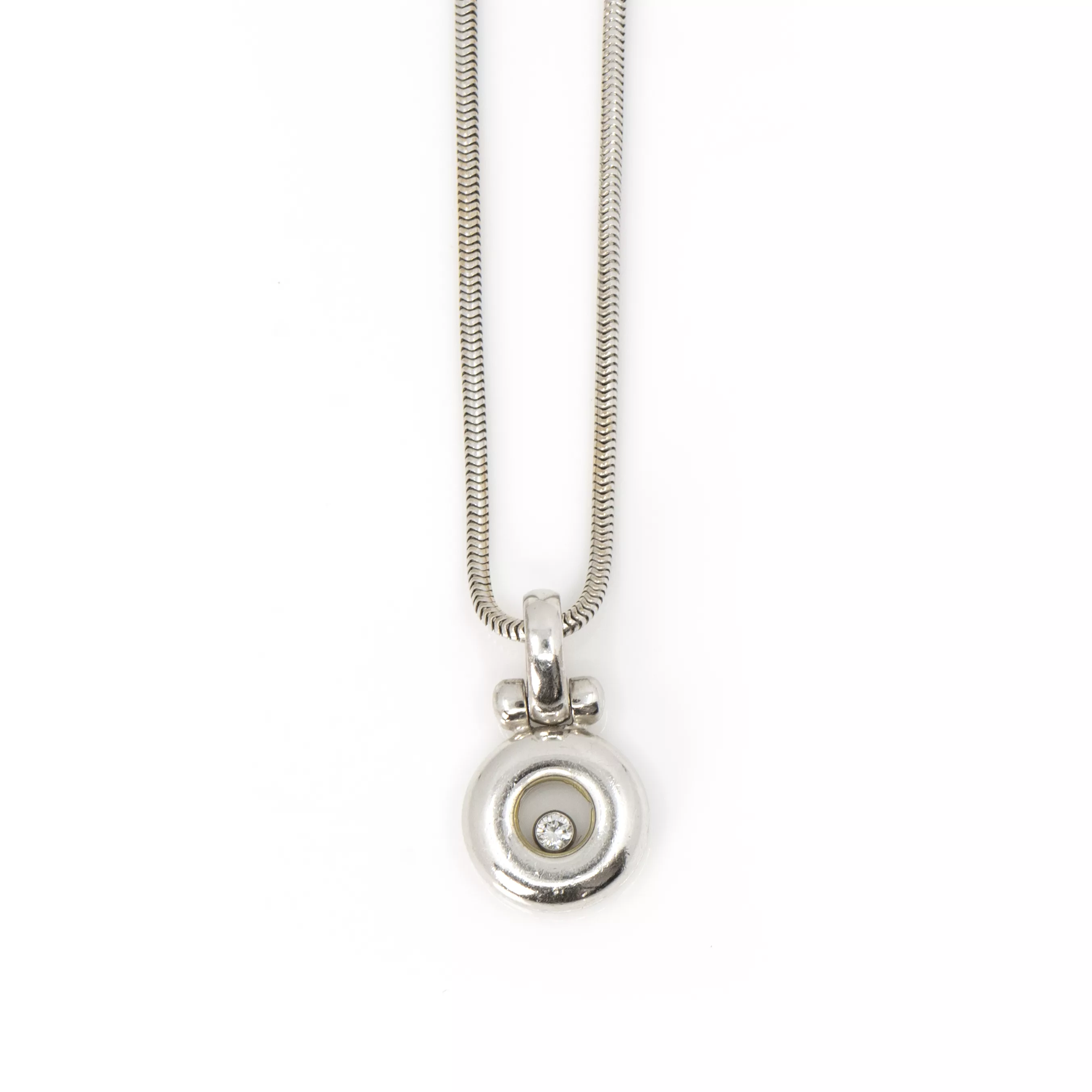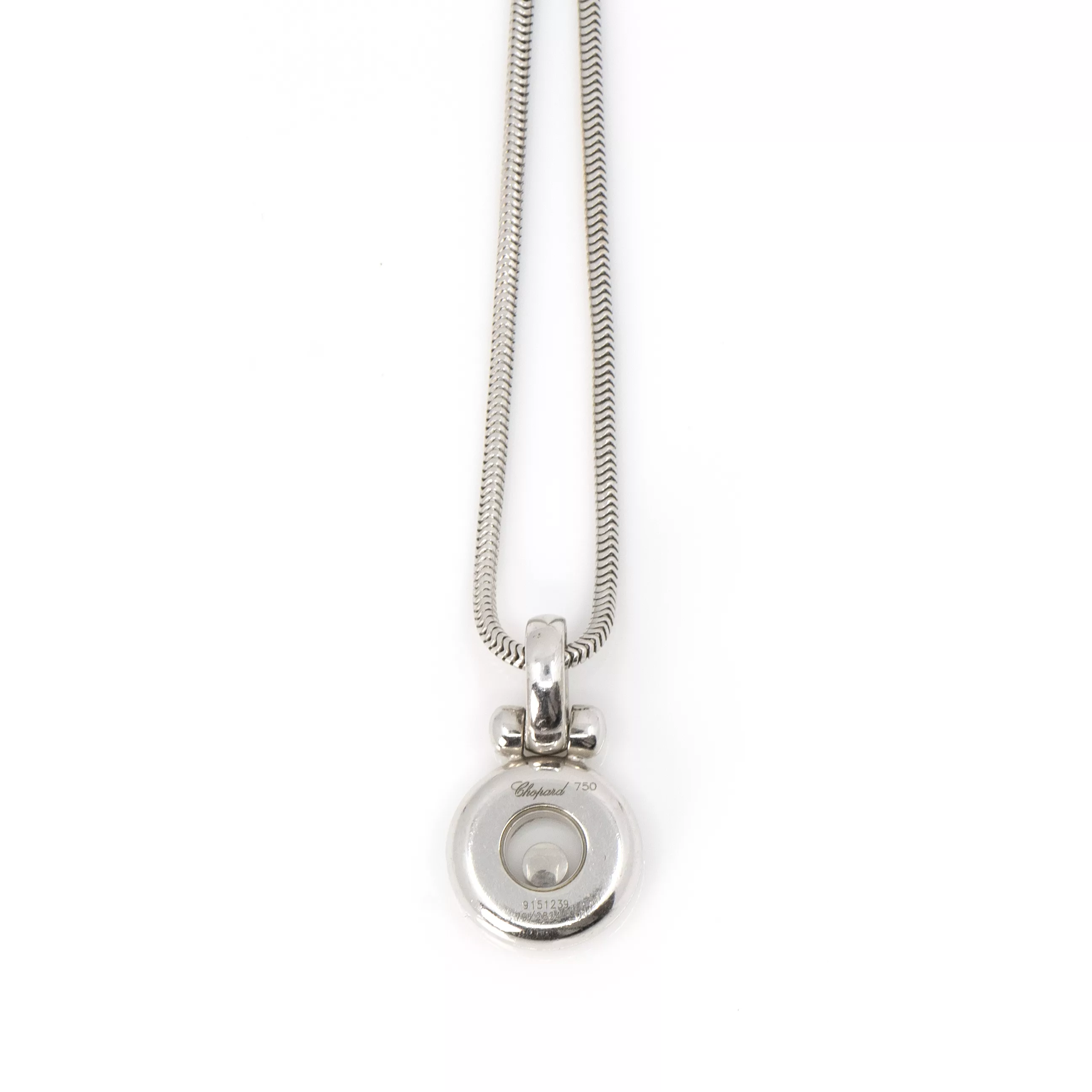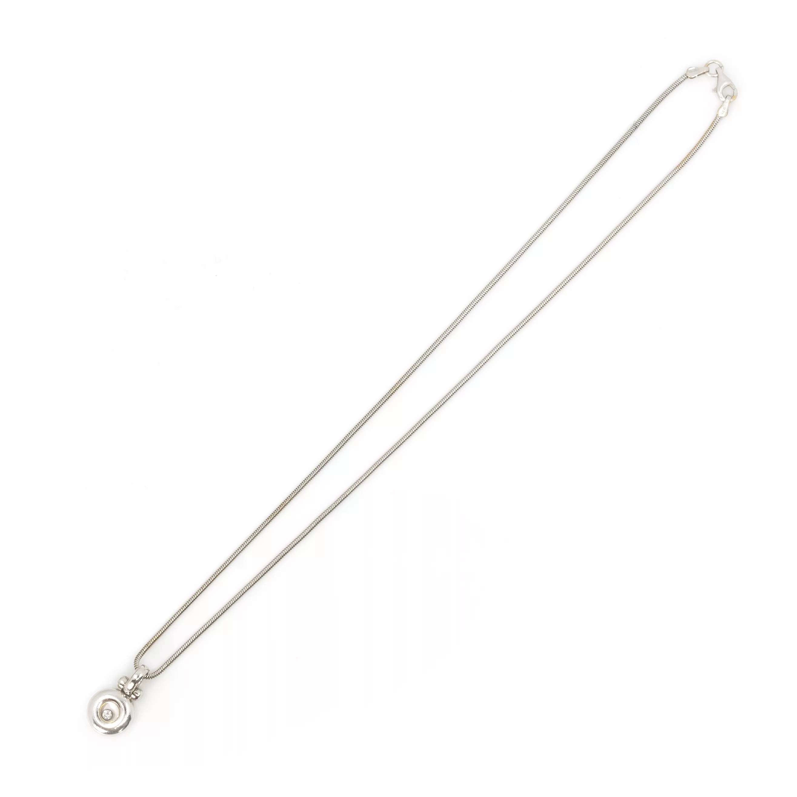 Chopard, France, 750 white gold, hallmarked, pendant with brand hallmark and numbering, brilliant-cut diamond, approx. 0.05 ct, F-G, vvs, length necklace 42 cm, length pendant 2 cm, weight approx. 11.1 g, slight signs of wear