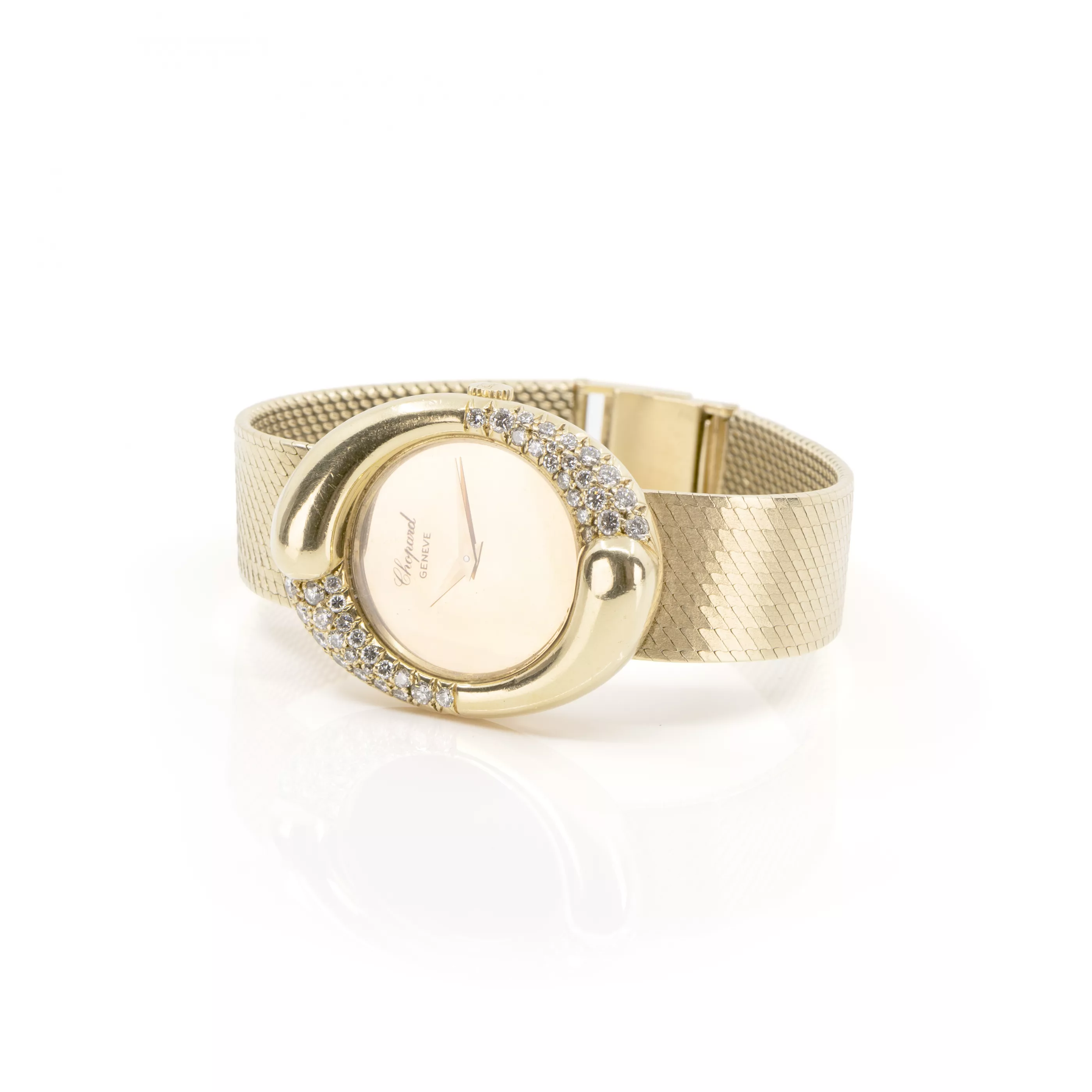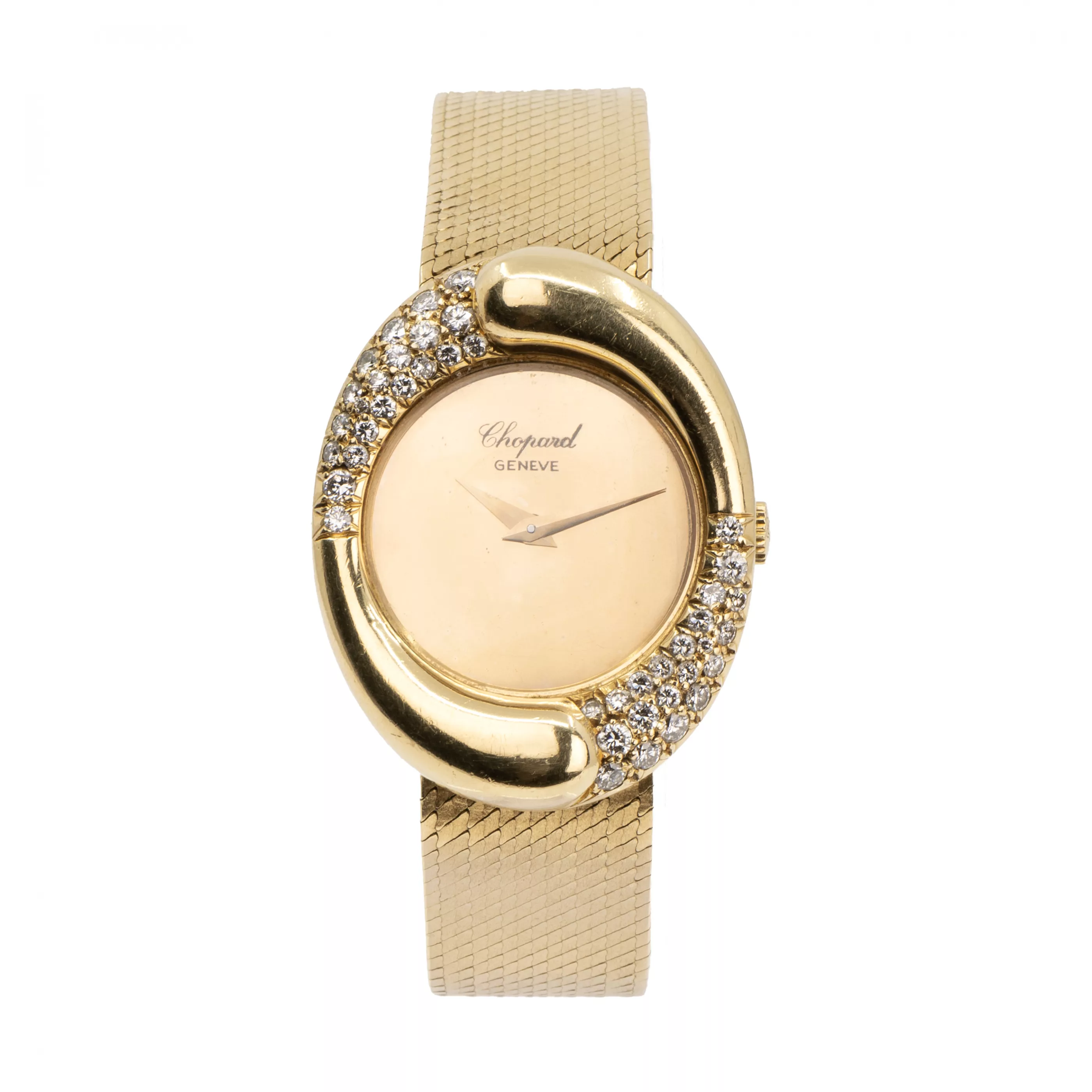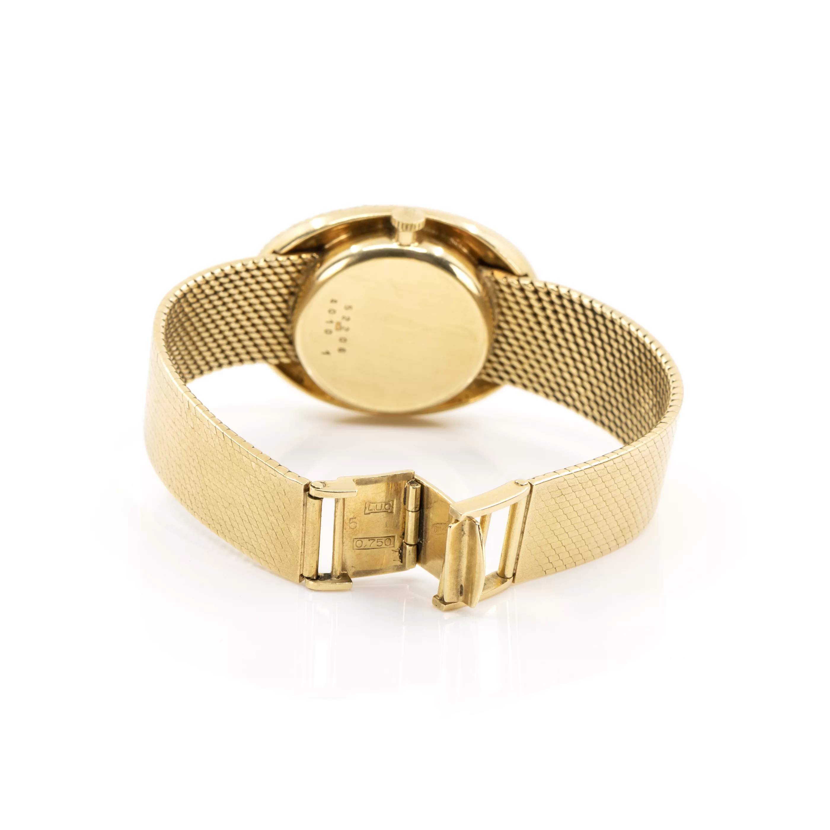 1970/1980s, manual winding, case no. 52206 | ref. No. 4010 1, case 750 yellow gold, hallmarked, gold dial, 42 brilliant-cut diamonds, total approx. 1.25 ct, dimensions 35 mm x 22 mm, original Milanese bracelet, 750 yellow gold, original clasp, 750 yellow gold, hallmarked, length 16.3 cm, total weight approx. 76 g, function tested, working, dial partially stained, in need of revision, without original box or papers