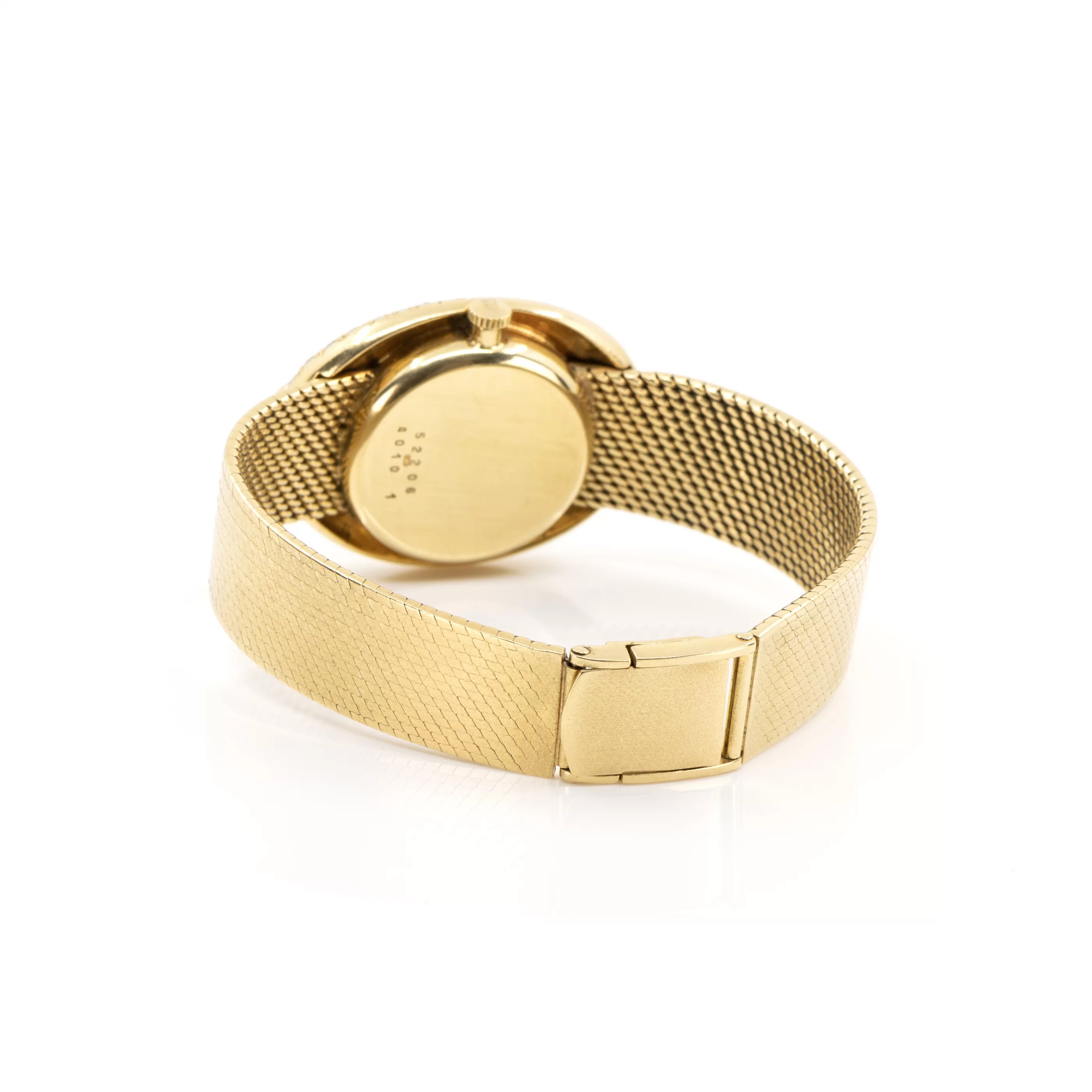 1970/1980er Jahre, Handaufzug, Gehäuse-Nr. 52206 | Ref.-Nr. 4010 1, Gehäuse 750 Gelbgold, punziert, goldenes Zifferblatt, 42 Diamanten im Brillantschliff, gesamt ca. 1,25 ct, Maße 35 mm x 22 mm, Original-Milanaisearmband, 750 Gelbgold, Original-Schließe, 750 Gelbgold, punziert, Länge 16,3 cm, Gesamtgewicht ca. 76 g, Funktion geprüft, gangbar, Zifferblatt partiell fleckig, revisionsbedürftig, ohne Original-Box oder -Papiere